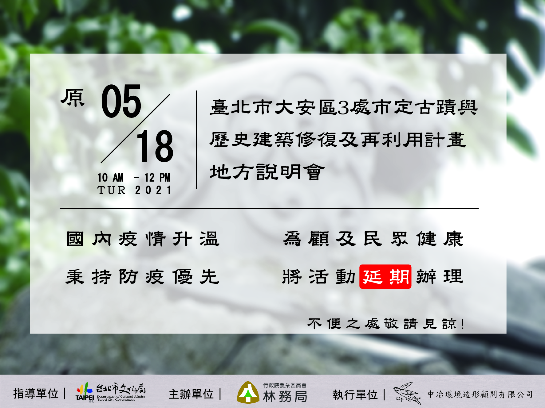 因應疫情升溫,原訂110/05/18(二)舉辦之【臺北市大安區3處市定古蹟與歷史建築修復及再利用計畫 地方說明會】延期辦理。
