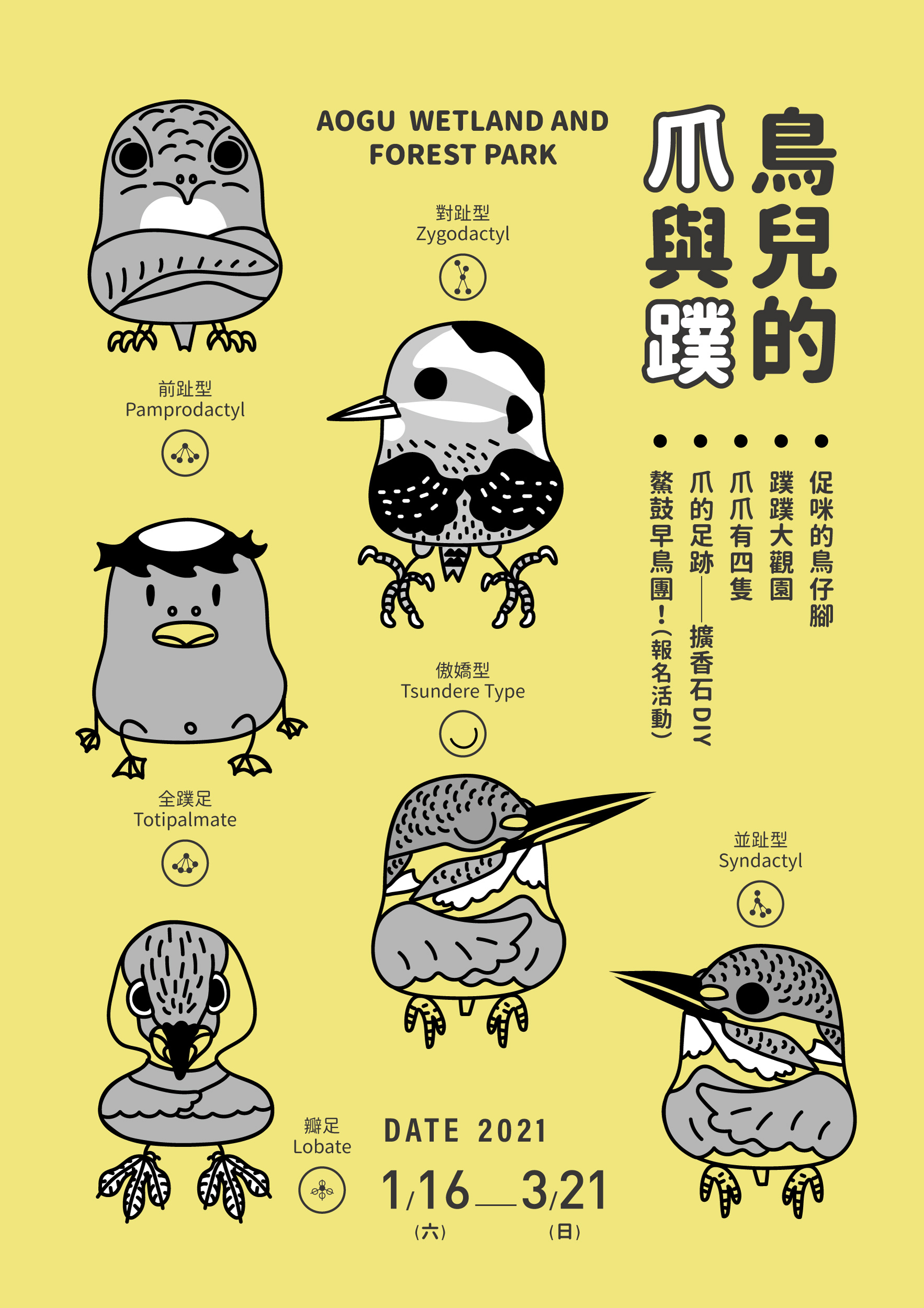 鰲鼓濕地森林園區於110年1月16日至3月21日舉辦「鳥兒的爪與蹼」冬季活動,嘉義林管處為讓遊客更身歷其境,在二二八連假周末2日各辦理1場「鰲鼓早鳥解說團」,直接面對面欣賞豐富鳥況,到東石自然生態展示館還可參加「爪的足跡」擴香石DIY活動,限額報名且免費參加,快來規劃一場生態科普之旅吧! 來認識鳥仔腳 還有限量好禮可以拿 鳥有著靈巧的雙腳可以解決生活大小事,從腿、爪一路到蹼,裏頭藏著好多小秘密。嘉義林管處表示各種樣式的「鳥腳」各有獨特功能,比如小鸊鷈特殊的「瓣蹼」與雁鴨的「滿蹼」構造,於潛水時更有推進力;魚鷹外趾能適時反轉成「對趾」狀態(前二趾、後二趾),輕易地勾住滑溜的魚,讓牠們飽餐一頓;足部修長的高蹺鴴、白鷺鷥則有利於在沼澤泥濘地或是較深的水域裡覓食。 在東石自然生態展示館舉辦為期2個月的「鳥兒的爪與蹼」冬季活動,用鰲鼓可見鳥類舉例說明,搭配闖關小遊戲還有限量小禮,另外還有限額100名的手作鳥爪拓印擴香石;嘉義林管處更表示在二二八連假周末2日各辦理1場、限額30名的「鰲鼓早鳥團解說導覽」,活動將於2月2日(二)上午10點在「鰲鼓濕地臉書粉絲團」開放線上報名,免費好康,趕快安排假期衝一波!詳細活動資訊請追蹤臉書粉絲團,或電洽東石自然生態展示館05-3601801,將由專人為您解答。