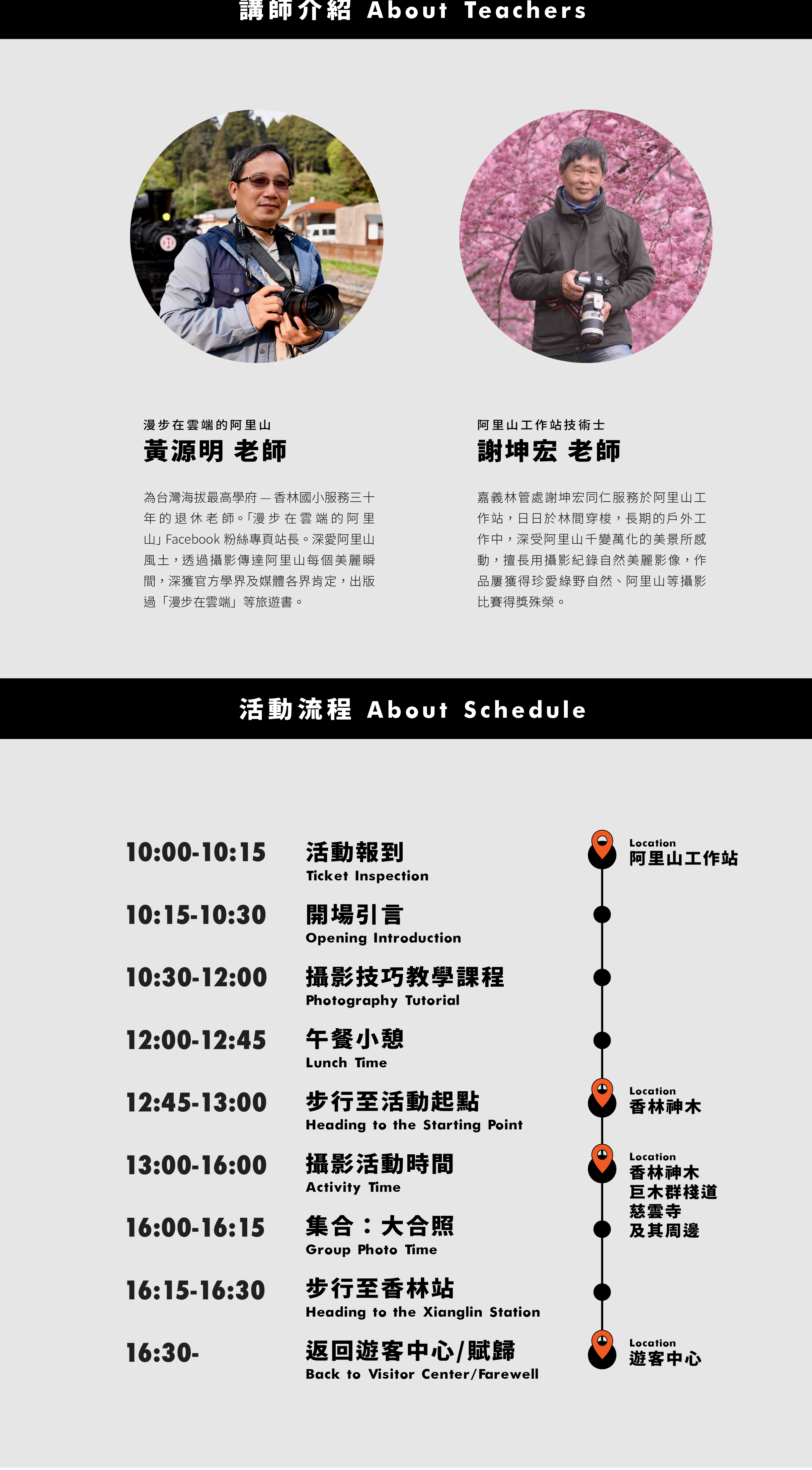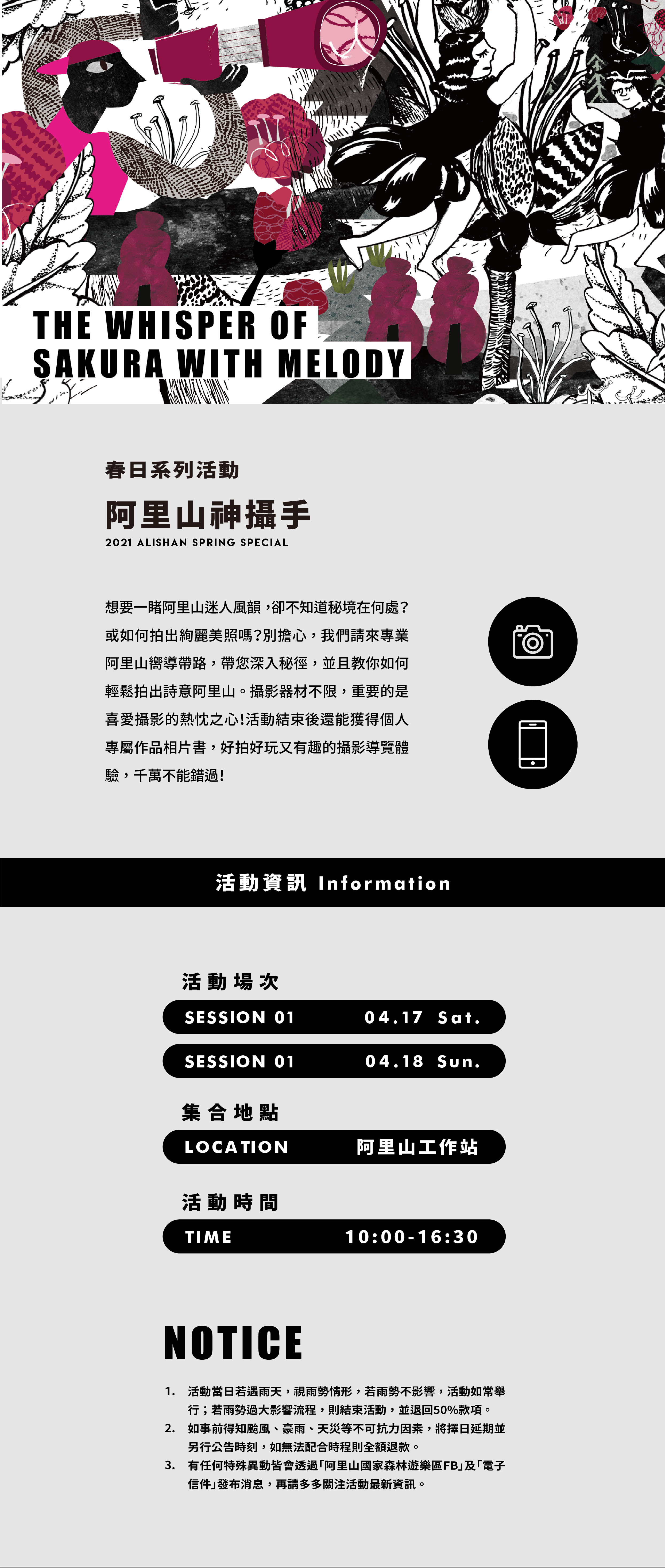 林務局嘉義林區管理處將於110年4月17-18日在阿里山國家森林遊樂區推出2梯次「阿里山神攝手」活動。活動於110年3月29日(一)上午9點開始報名,歡迎對自然生態、攝影有興趣的民眾一起來參加。 鳥語花香阿里山 告別冷冽的冬天,園區春天滿山遍野都開滿了五顏六色的花,山櫻花、阿龜櫻、唐實櫻、霧社櫻、染井吉野櫻、普賢象櫻、高山杜鵑、白木蘭、雲南黃馨、紫藤、臺灣一葉蘭、雛菊等等。滿開的花朵也吸引了鳥兒來覓食,甜甜的花蜜是小鳥們的最愛。漫步在園區耳邊盡是小鳥的叫聲,吱吱喳喳非常熱鬧,此起彼落的「吐米酒」、「嘰—就兒—」、「季、季、季」、「嘎、嘎、嘎」鳥叫聲,彷彿在讚嘆著阿里山的美好。想要一睹留著可愛龐克頭的冠羽畫眉穿梭在山櫻花間吸取花蜜的景象嗎?春天正是阿里山賞花賞鳥拍美景的好時機。 活動介紹 活動內容包含攝影導覽與取景教學。邀請知名「漫步在雲端的阿里山」臉書版主,同時也是嘉義林管處國家森林志工的黃源明老師,及林管處員工知名攝影師謝坤宏,2位熱愛自然山林、熟稔阿里山一草一木,用相機記錄阿里山美景的攝影專家,帶路引領民眾深入阿里山秘境,用鏡頭搜羅阿里山森林美景,對攝影完全沒有概念的新手也ok!由攝影達人講解取動態攝影、風景拍攝技巧,含室內課程及戶外實拍課程。除了現場教學外,報名參加更可獲得限定好禮及個人專屬相片書,為你留下個人拍攝的紀念寫真。 防疫做得好出遊沒煩惱 配合中央流行疫情指揮中心指示,3月1日起持續實施秋冬防疫專案,因應國際疫情嚴峻請遊客搭乘大眾運輸工具須配戴口罩,車上禁止飲食。防疫期間園區定期進行消毒作業,現場服務人員均配戴口罩,館舍內落實量測體溫及人潮管制,公廁洗手台設置洗手乳供遊客清潔洗手維持衛生,打造優質衛生環境落實防護措施讓大家安心出遊。配合正確的防疫措施開心出遊免煩惱。 報名須知 本活動於3月29日(一)上午9點開放報名,每梯次限額38人,活動費用每人1,000元,活動詳細內容請上報名網址查詢。本次活動採KKTIX購票平台https://ider.kktix.cc/events/06f99c97,其餘活動詳情可電詢04-22468535林小姐。