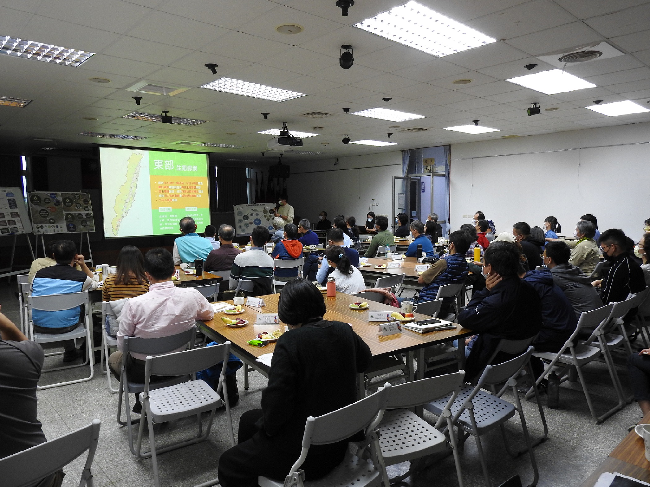 會中經濟部水利署第九河川局分享自108年參與綠網平台後,以「還地於河、還石於河、還水於河、還魚於河」概念恢復河川生命等成果。花蓮縣政府說明花蓮美崙溪出海口台灣狐蝠保育如何與社區協商保全狐蝠棲地,及在新社地區大不岸溪橫向構造物改善,提高洄游魚蝦上溯的機會。林管處則提出林道改善、保安林經營、生態植被復育、重要棲地與瀕危物種生態給付計畫等執行成果。農糧署東區分署則建議以『對地綠色環境給付』政策,增加建構區域綠網的政策工具。
