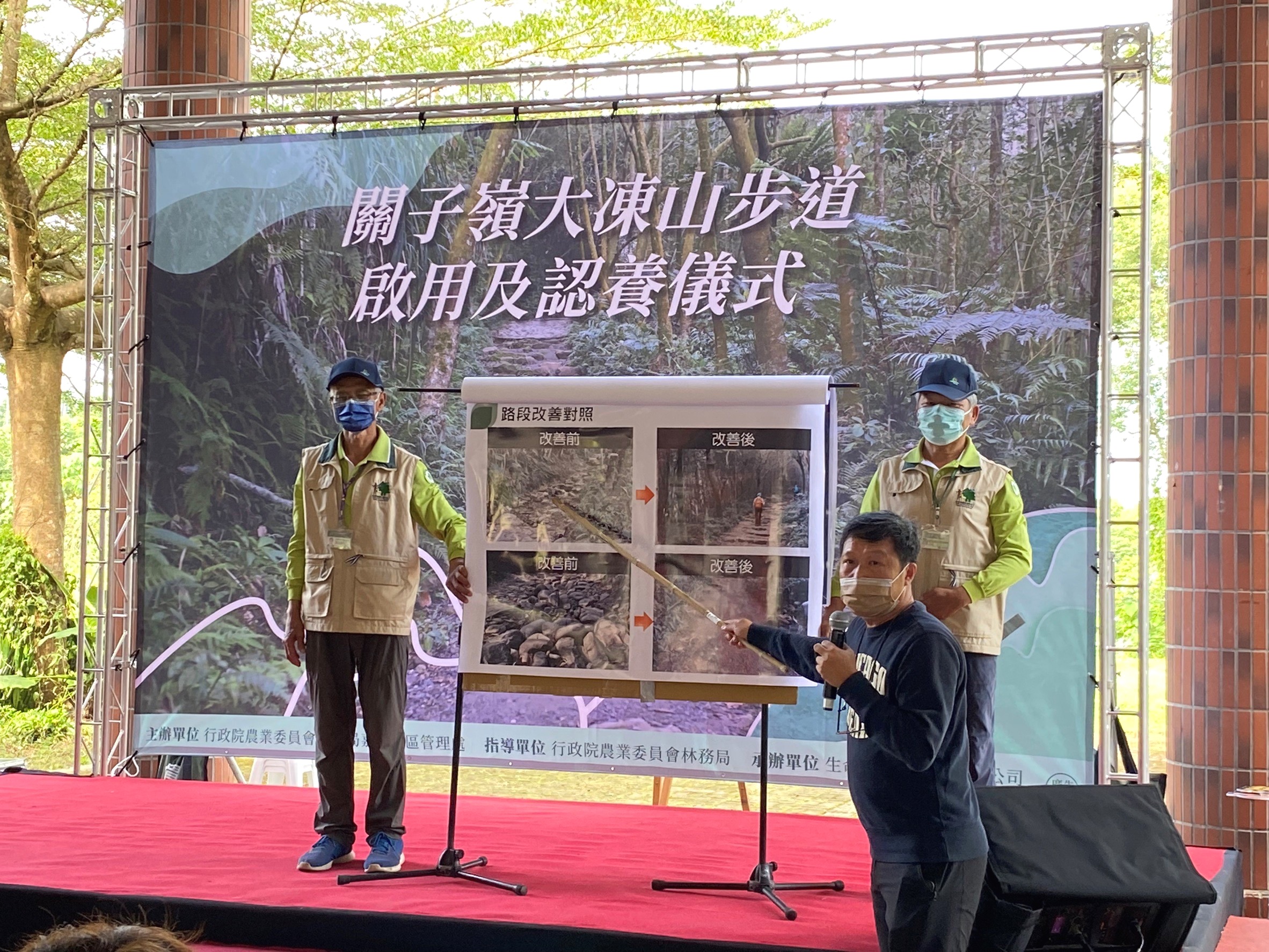 關子嶺大凍山步道是臺南地區假日熱門登山健行路線,由於步道受災,舖面損壞,林務局嘉義林區管理處參採山友使用心得,細部調整步道踏階及採取手作步道自然工法修建,歷經一年於111年10月完工, 11月7日辦理啟用儀式,邀請臺南地區登山團體、國家森林志工及臺南市政府、地方民意代表等機關團體100餘位,共同體驗工法自然及嶄新的關子嶺大凍山步道。