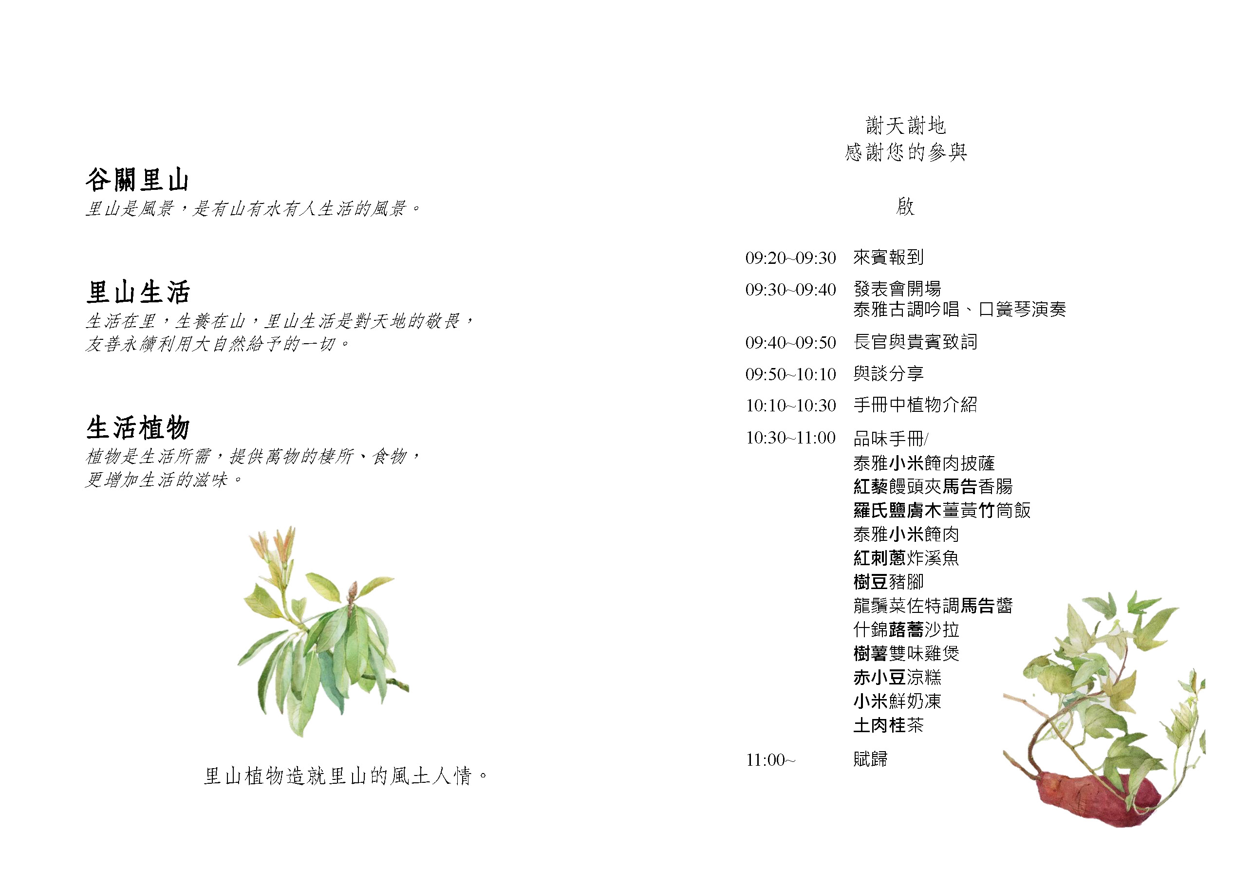 臺中市和平區大甲溪流域沿線的大谷關地區,為泰雅族原鄉部落生活區域,其自然環境孕育出多樣性民族植物融入部落生活,發展出獨特的傳統植物料理、編織、染料、建造工藝等。東勢林區管理處委託專家攜手部落耆老夥伴共同編撰《谷關里山生活植物-大谷關地區原鄉部落傳統生活與民族植物手冊》,並於今(30)日在八仙山國家森林遊樂區辦理新書發表會,邀請該手冊作者、受訪的部落長老及夥伴共同參與,也吸引許多對傳統植物有興趣的民眾共襄盛舉,未來將可在八仙山國家森林遊樂區遊客中心、五南文化廣場、國家書店購買該手冊。 此次手冊由該處委託中華自然資源保育協會陪伴臺中市和平區大甲溪流域沿線的南勢、裡冷、松鶴、哈崙台及斯可巴等泰雅族夥伴實地走訪蒐集資料,歷時2年才編撰完成。書中介紹原民將植物做為香料、染料、編織、建造、工藝等用途,閱讀本書可以瞭解到許多植物運用於生活中的技巧,例如在泰雅料理中,會將「蕗蕎」去硬皮與殘葉,搭配野菜、竹筍、香料、醬油直接食用;「馬告」可直接當零食吃、果實醃漬保存再加入湯或菜中提味等;「樹豆」適合和山肉一起煮,且富含營養價值;皆忠實記錄泰雅原住民族傳統生活智慧。今日發表會時,現場也準備了運用民族植物創作的「樹豆豬腳」、「什錦蕗蕎沙拉」等12道風味料理,讓大家能品嘗到手冊中記載的食材美味。 東勢林管處指出,在部落的里山生活中,植物是生活所需,該手冊以生動的文字及照片,描述泰雅傳統植物在生活中的獨特運用,並請設計師繪製精緻的植物圖片,結合美學設計讓讀者對植物型態一目了然。編撰過程以里山倡議概念融入之友善環境耕種與傳統作物保種復耕,拜訪部落的夥伴、耆老,盤點部落遷徙的歷史、位置及範圍、主要經濟活動、傳統作物開墾與耕種等傳統生活,以及部落所使用的傳統植物,共計30種傳統植物之特性、種植時間、使用時間及方法、植物泰雅語與泰雅族印象等內容,彙編整理成手冊,讓讀者更認識原住民族傳統文化之美。 東勢林區管理處處長張弘毅說明,里山生產、生活、生態及地景,幾乎都存在原住民族的傳統生活裡,透過自然資源永續利用及運用傳統生態智慧,以保全與維護生物多樣性,因此為積極推動生物多樣性保育工作,並與原住民族建立夥伴關係,該處透過出版該手冊,將其傳統生活與山林生態智慧加以記錄及傳承下去,也期望從原住民族傳統生態智慧裡,學習、認識更多與自然和諧共生的方式。