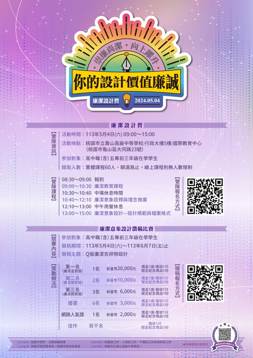 為深化誠信與廉潔之核心理念,厚植廉潔文化及拓展反貪網絡,桃園市政府政風處策劃辦理以高中職學生為對象之廉潔設計營暨廉潔意象徵稿比賽, 期藉由寓教於樂、輕鬆有趣方式,將廉潔意識及品德素養注入校園文化中,並將廉潔守法的概念推展至全民,讓學生、民眾與公部門共同連結成綿密的反貪網絡。 廉潔設計營相關資訊如下: 活動日期:113年5月4日(六)9:00至15:00。 活動地點:桃園市立壽山高級中等學校國際教育中心(桃園市龜山區大同路23號行政大樓5樓)。 活動對象:高中職(含五專前三年級)在學學生。 活動人數:實體60人,線上人數無限制。 廉潔意象徵稿期間自113年5月4日至同年6月7日止,報名徵稿前須完成前揭廉潔設計營課程, 參加課程得採現場、線上直播或事後線上觀看形式,相關資訊請參閱活動簡章 比賽第一名取1名獎金新臺幣(以下同)2萬元,第二名取2名獎金1萬元,第三名取3名6,000元,優選取6名獎金3,000元與1名網路人氣獎獎金2,000元,總獎金共計7萬8,000元整。