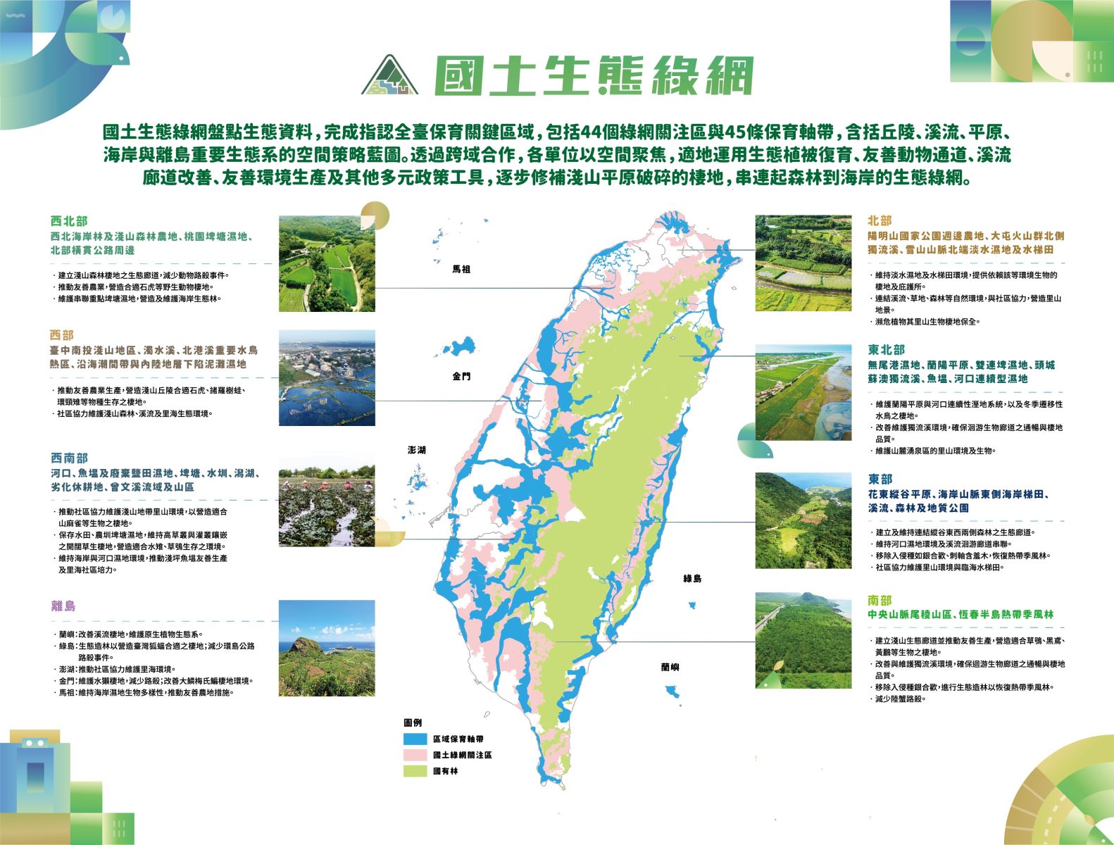 國土生態綠網藍圖的指認與建置,為計畫能夠被實踐的第一步,透過盤整歷年生態調查與資料庫的動植物資料,套疊各類群動物多樣性熱點、瀕危物種實際分布、里山地景、土地利用等圖層,指認出生物多樣性熱點與優先保育地區。依據2020年國土生態綠網藍圖盤整成果,將全台分為8個綠網分區(本島7區、離島1區),共指認了44處綠網關注區域,每個關注區域均盤點重要生態系、議題及關注物種等資料,才能依不同地域特性擬訂保育對策,讓資源投注可以對焦,而這些資料也都會充分公開,提供行動計畫實務上的指引。七大行動策略如下: (一) 建全國土生態綠網藍圖完善建置現階段已指認之8個綠網分區及44處關注區域資訊,發展區域綠網藍圖,包括關注議題、棲地、物種等資料之深化,並強調空間區位之連結;系統性追蹤與評估計畫對於改善生態物種保育、生物多樣性、生態棲地與生態環境之效能;強化開放圖台建置與維運工作,促進工程單位及其他公私部門之使用;深化不同專業、單位與空間的跨域合作,整合農業部各單位的技術資源,並與交通、水利、內政、國有土地、公共工程等跨部會機關建立合作機制,開啟公部門、縣市政府與民間的綠網協力平台。 (二) 生態植被復育與入侵種移除執行全台平地至淺山間綠網生態關注區域河川兩岸及農田溝渠岸邊土地、內陸避風老化林木海岸林、珍稀植物復育等工作;栽植原生樹種營造多樣化複層植栽廊道,並針對入侵外來種植物辦理移除,建構適宜野生生物棲地環境。 (三) 生態廊道串連與動物通道建置針對綠網藍圖評估之高風險、低韌性生態環境地區,借鏡國際之「基於自然的解決方案(Nature-based Solutions)」,提出對應之保育和復育策略,例如配合周邊地景分析與路殺資料,在高風險路段設置動物通道、溪流與河川友善工程與護溪、農田灌排友善設施等。 (四) 高風險地區與瀕危物種保育推動高風險地區與瀕危物種保育對策,對應22種瀕危物種辦理物種永續之威脅因子分析,建立族群數量止跌回升之策略方法並落實;推動野生動物救傷、受脅植物復育場域營造建置、生態服務給付案例操作與輔導等工作。 (五) 友善生產環境之營造擬訂臺灣鄉村社區「社會-生態-生產地景與海景」保全、維護與活用策略、發展並推廣綠色保育標章認證制度,於里山、里海場域輔導友善農、漁業生產案例,並連結有機及友善耕作農地,整合執行成果與惠益。 (六) 里山倡議與地景保育推動推動里山倡議夥伴關係網絡(Taiwan Partnership for the Satoyama Initiative, TPSI)與地質公園網絡,結合在地社區與農民更有系統的保全關注區域內的「社會-生產-生態」地景,發展保全活用對策和在地行動方案;積極參與國際型研討及成果發表,提升我國生態保育事務之國際能見度及貢獻。 (七) 公眾參與及國土生態綠網環境教育推廣推動綠網關注區域內林區之公私協力,進行環境營造及維護,發展環境教育等工作;整合在地文化特色,融入不同地區之生態資源,促進地方產業經濟與綠色產業發展,並配合進行里山及綠網成果推廣,爭取大眾對「人與自然和諧共生」理念之支持。