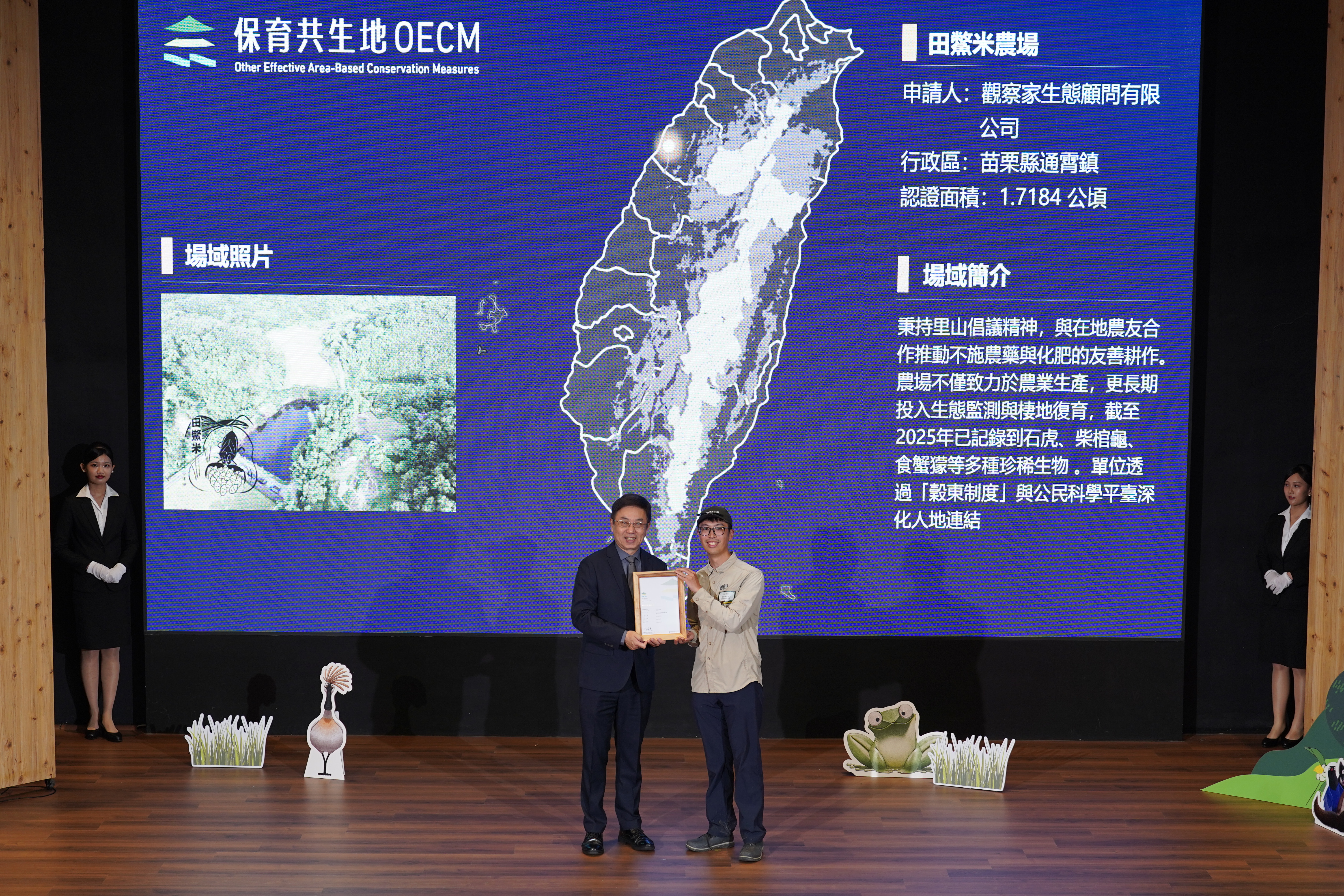 基本資料 認證分級 保育共生地 認證年度 114年 認證字號 114-1-005 申請人 觀察家生態顧問有限公司 行政區 苗栗縣通霄鎮 認證面積 1.7184 公頃 生物多樣性價值 價值一 瀕危動植物之現存、潛在棲息及生長範圍或其復育場域價值二 依賴特殊環境之物種或狹域分布物種之現存、潛在棲息及生長範圍價值三 物種生活史之關鍵棲地價值五 具生態連結或緩衝功能之區域價值六 具生物多樣性保育功能之文化生活地景價值七 經政府機關認可具生物多樣性保育功能之區域 場域簡介 秉持里山倡議精神,與在地農友合作推動不施農藥與化肥的友善耕作,透過「穀東制度」與公民科學平臺深化人地連結。農場不僅致力於農業生產,更長期投入生態監測與棲地復育,截至2025年已記錄到石虎、柴棺龜、食蟹獴等多種珍稀生物 。