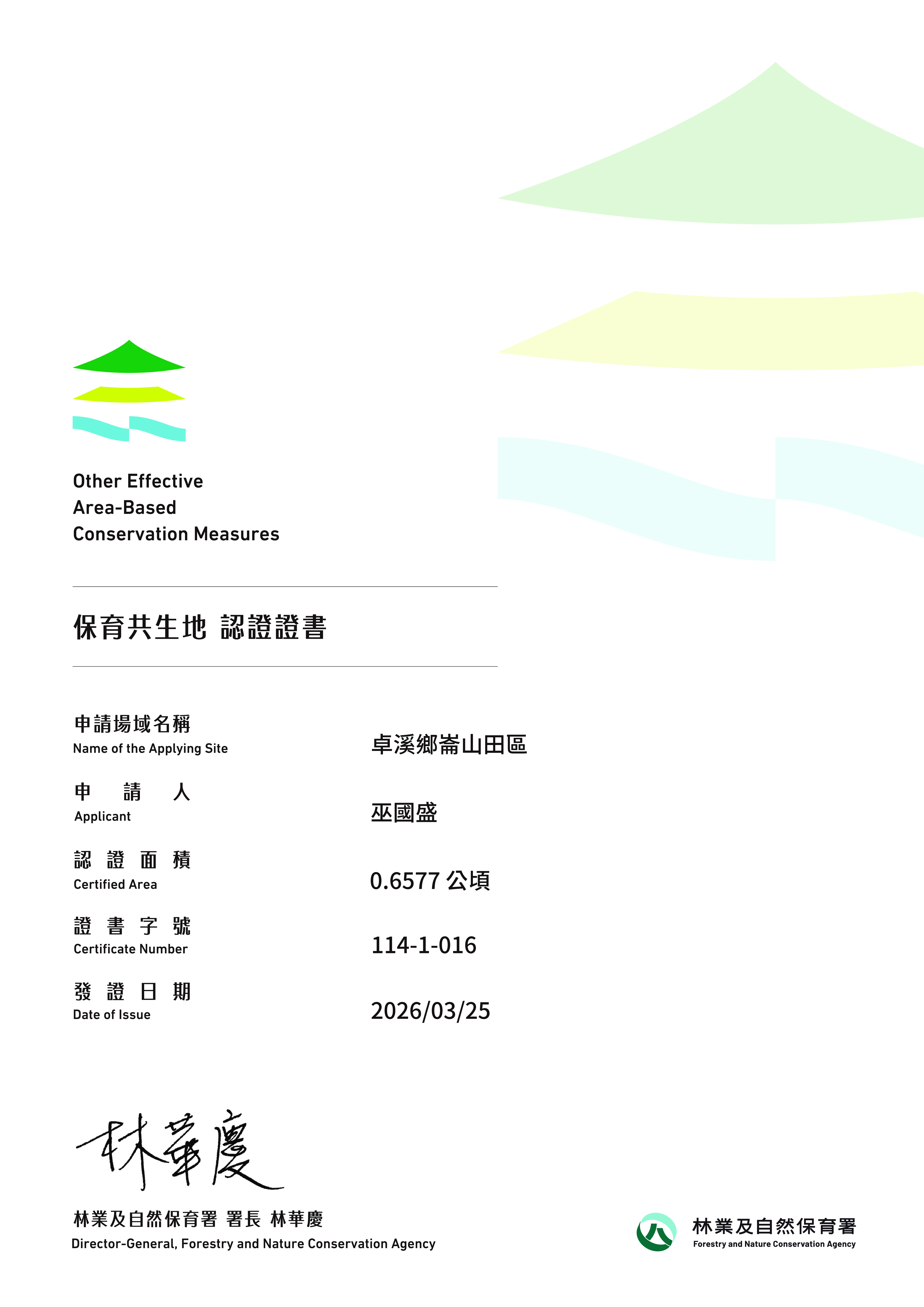 基本資料 認證分級 保育共生地 認證年度 114年 認證字號 114-1-016 申請人 巫國盛 行政區 花蓮縣卓溪鄉 認證面積 0.6577 公頃 生物多樣性價值 價值一 瀕危動植物之現存、潛在棲息及生長範圍或其復育場域價值三 物種生活史之關鍵棲地價值五 具生態連結或緩衝功能之區域價值七 經政府機關認可具生物多樣性保育功能之區域 場域簡介 場域屬於水梯田,透過終年湛水的耕作模式與鄰近野溪及次生林連結,營造出良好的生態環境 。核心價值在於保護保育類野生動物柴棺龜,由崙山社區發展協會組成巡護隊定期監測,落實農業生產與野生動物棲地維護共生之理念 。