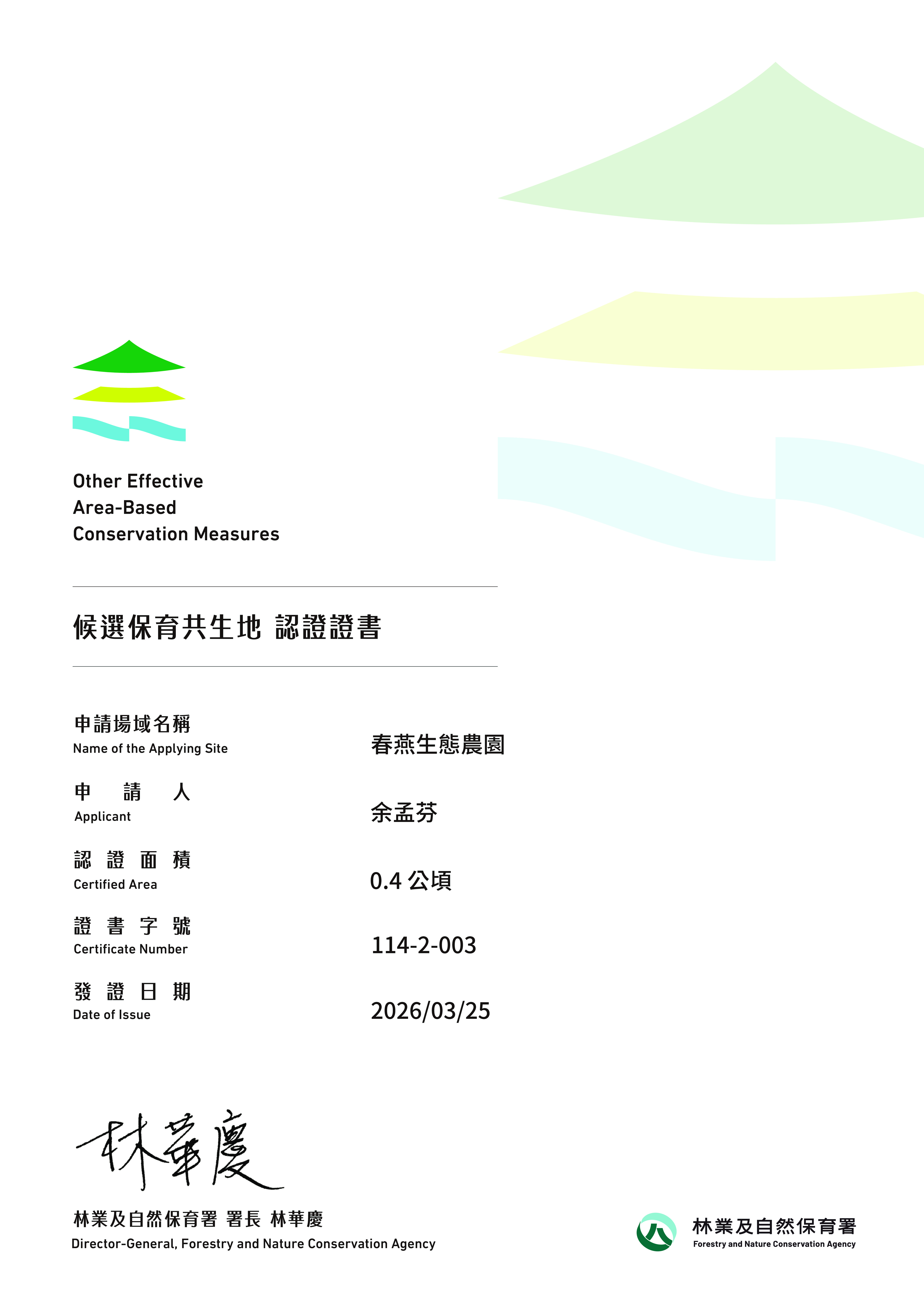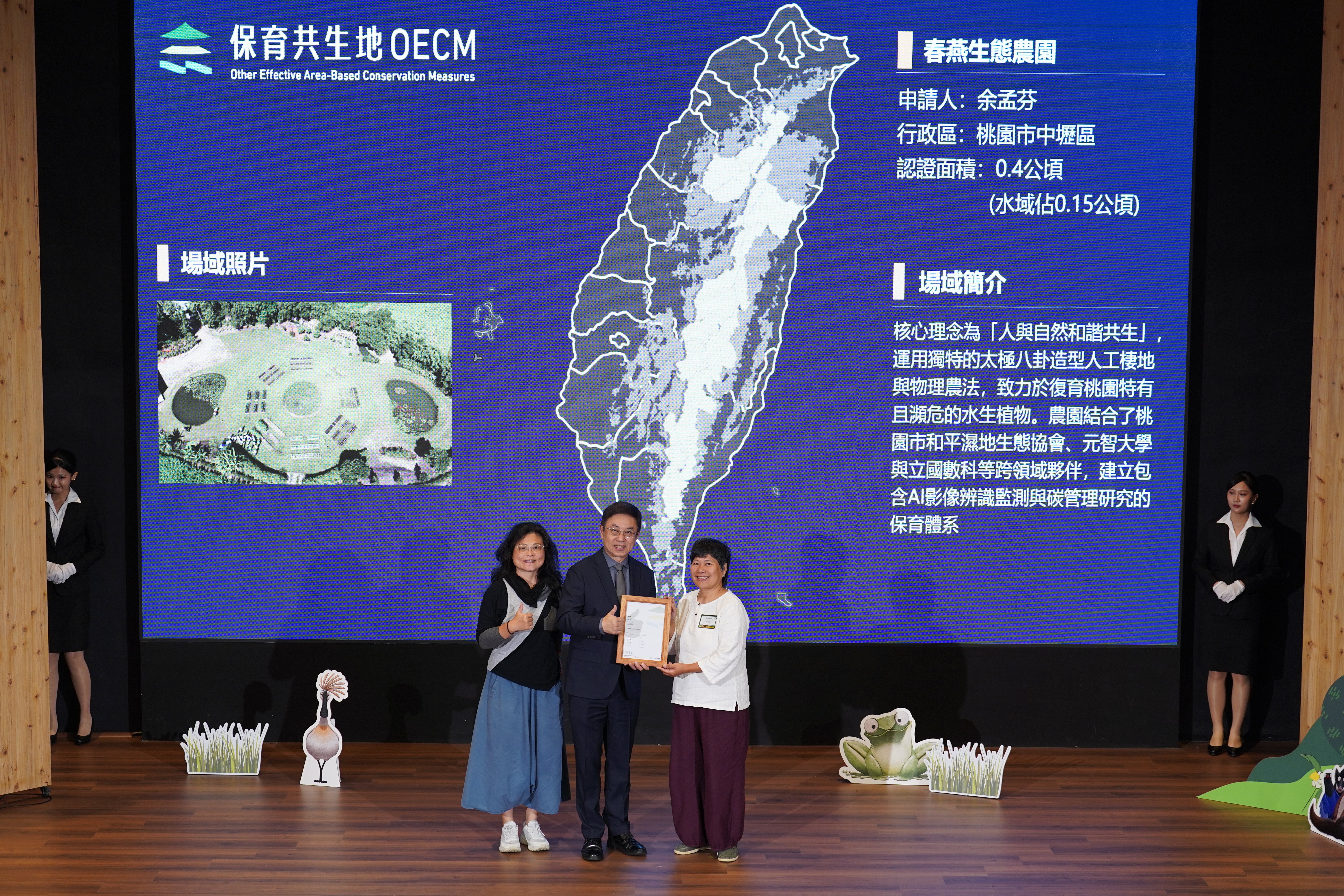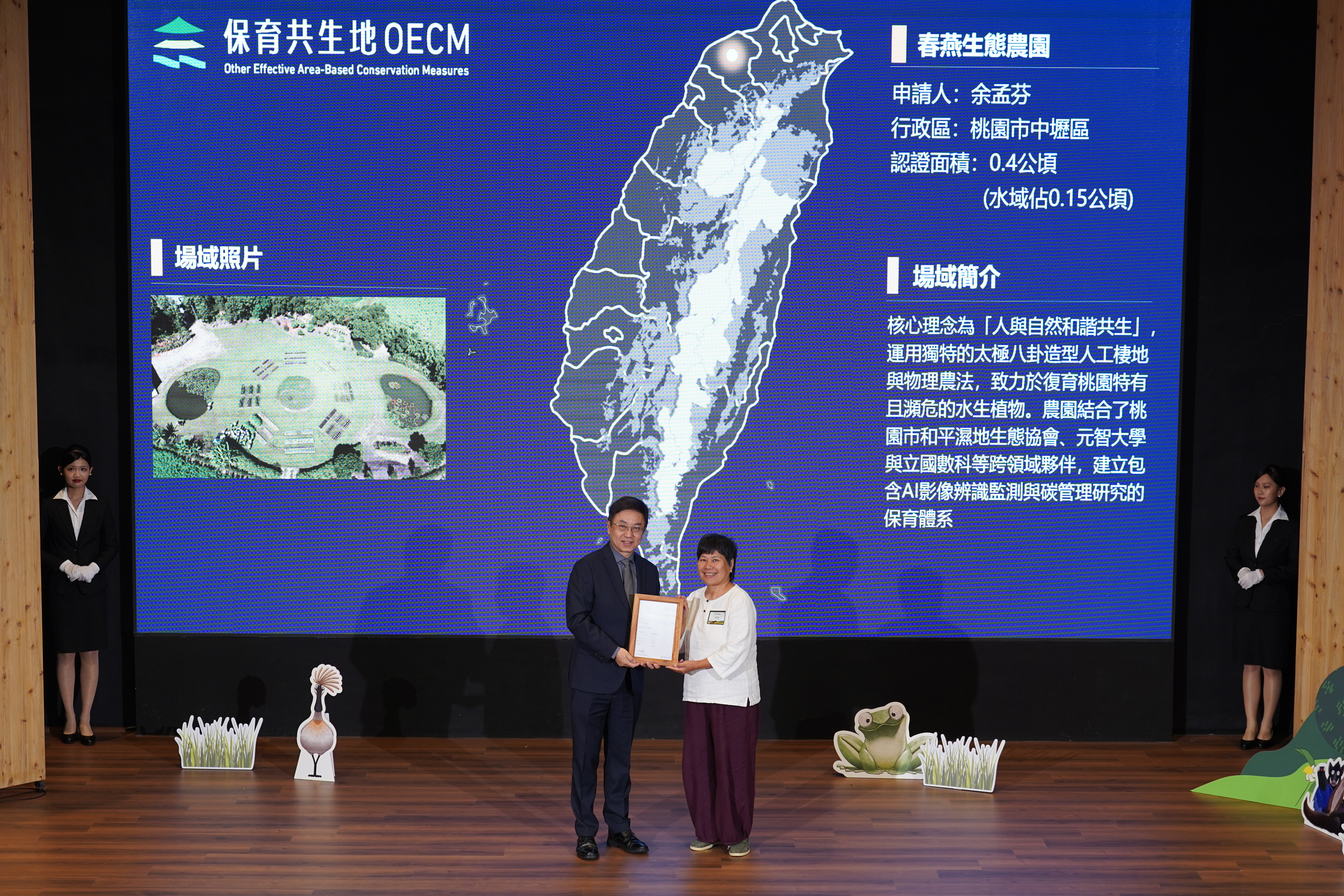 基本資料 認證分級 候選保育共生地 認證年度 114年 認證字號 114-2-003 申請人 余孟芬 行政區 桃園市中壢區 認證面積 0.4 公頃 (水域面積占 0.15 公頃) 場域簡介 核心理念為「人與自然和諧共生」,運用獨特的太極八卦造型人工棲地與物理農法,致力於復育桃園特有且瀕危的水生植物。農園結合了桃園市和平濕地生態協會、元智大學與立國數科等跨領域夥伴,建立包含AI影像辨識監測與碳管理研究的保育體系 。