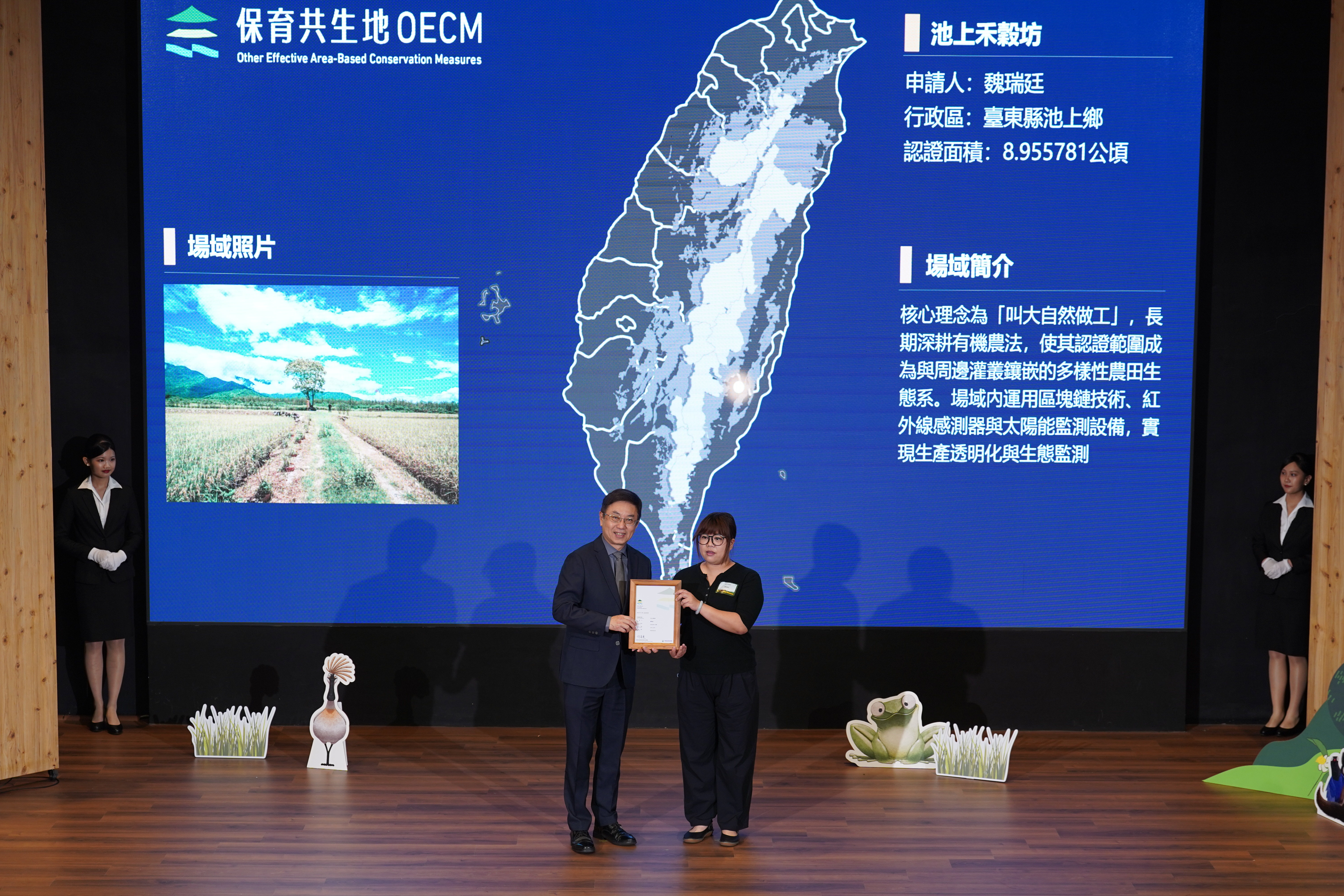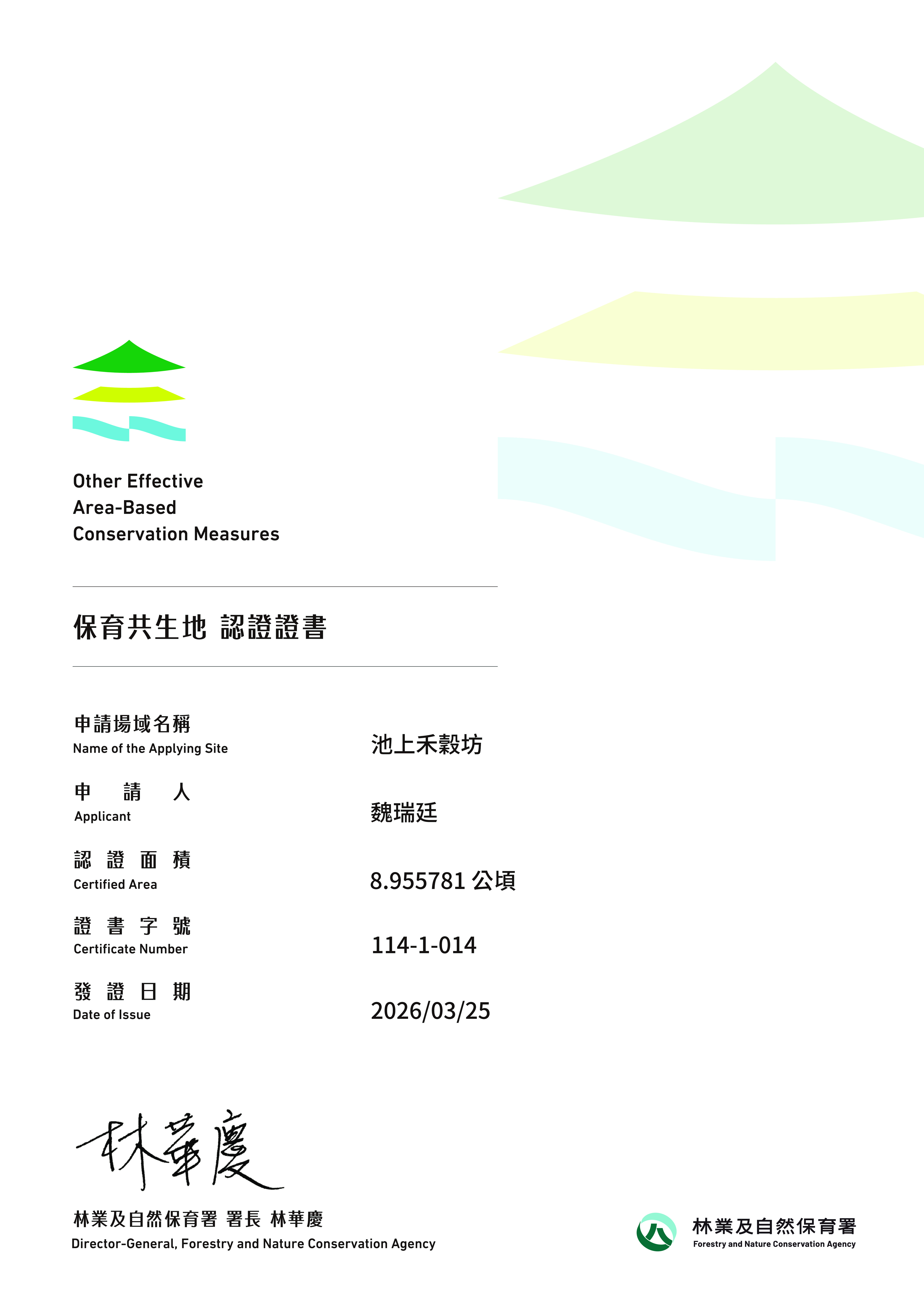 基本資料 認證分級 保育共生地 認證年度 114年 認證字號 114-1-014 申請人 魏瑞廷 行政區 臺東縣池上鄉 認證面積 8.955781 公頃 生物多樣性價值 價值一 瀕危動植物之現存、潛在棲息及生長範圍或其復育場域價值三 物種生活史之關鍵棲地價值七 經政府機關認可具生物多樣性保育功能之區域 場域簡介 核心理念為「叫大自然做工」,長期深耕有機農法,使其認證範圍成為與周邊灌叢鑲嵌的多樣性農田生態系。場域內運用區塊鏈技術、紅外線感測器與太陽能監測設備,實現生產透明化與生態監測 。