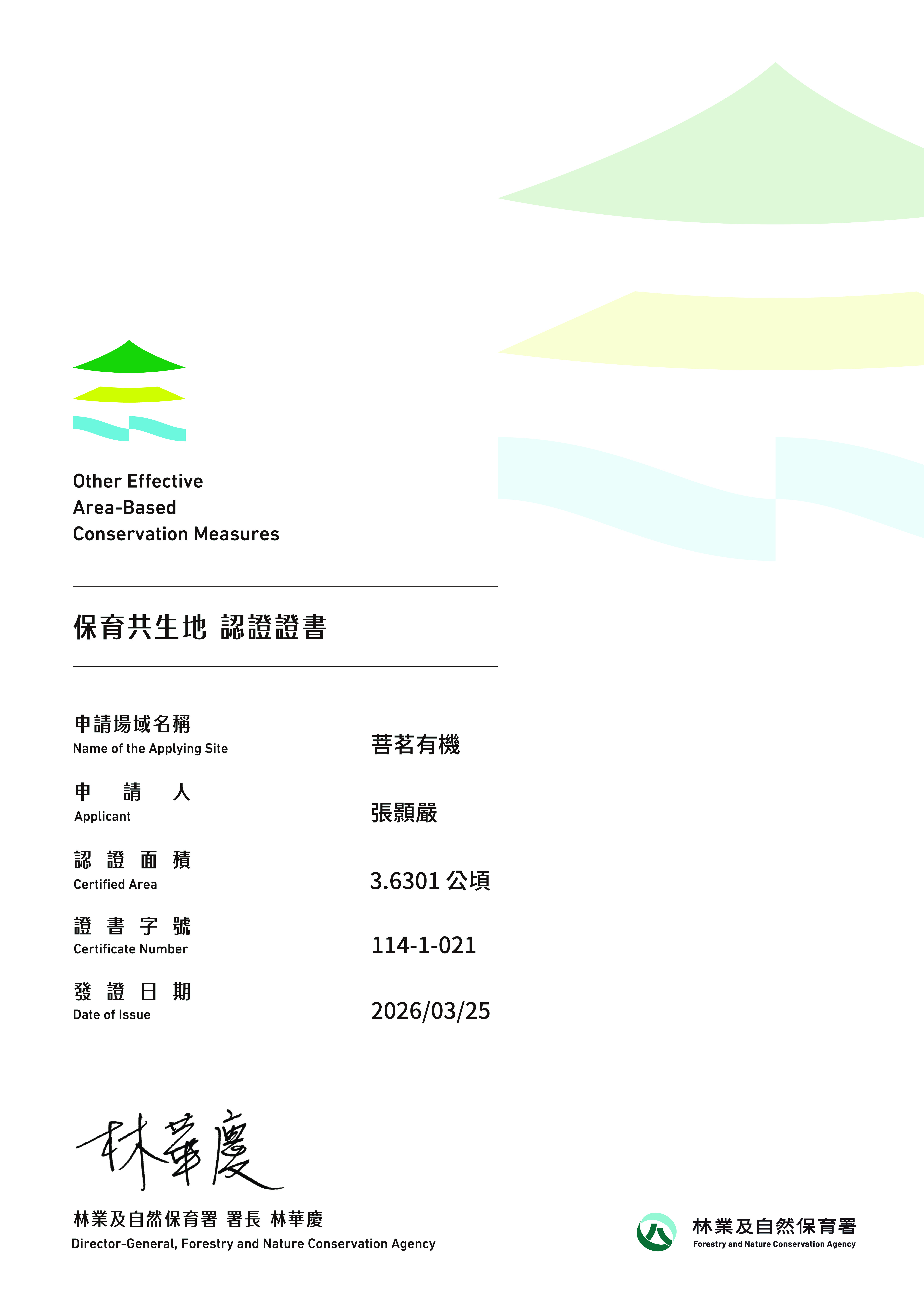 基本資料 認證分級 保育共生地 認證年度 114年 認證字號 114-1-021 申請人 張顥嚴 行政區 南投縣竹山鎮 認證面積 3.6301 公頃 生物多樣性價值 價值五 具生態連結或緩衝功能之區域價值六 具生物多樣性保育功能之文化生活地景價值七 經政府機關認可具生物多樣性保育功能之區域 場域簡介 前身為台灣早期輔導有機茶轉型的恆誠有機農場 ,核心理念為「土壤棲地營造」,透過低投入與維持生態鏈平衡的方式,生產高品質茶葉與薑,致力於維護紫斑蝶蝶道與穿山甲等保育類動物棲地,並利用傳統砌石地景調節微氣候,體現永續善農與生物多樣性共生的價值 。