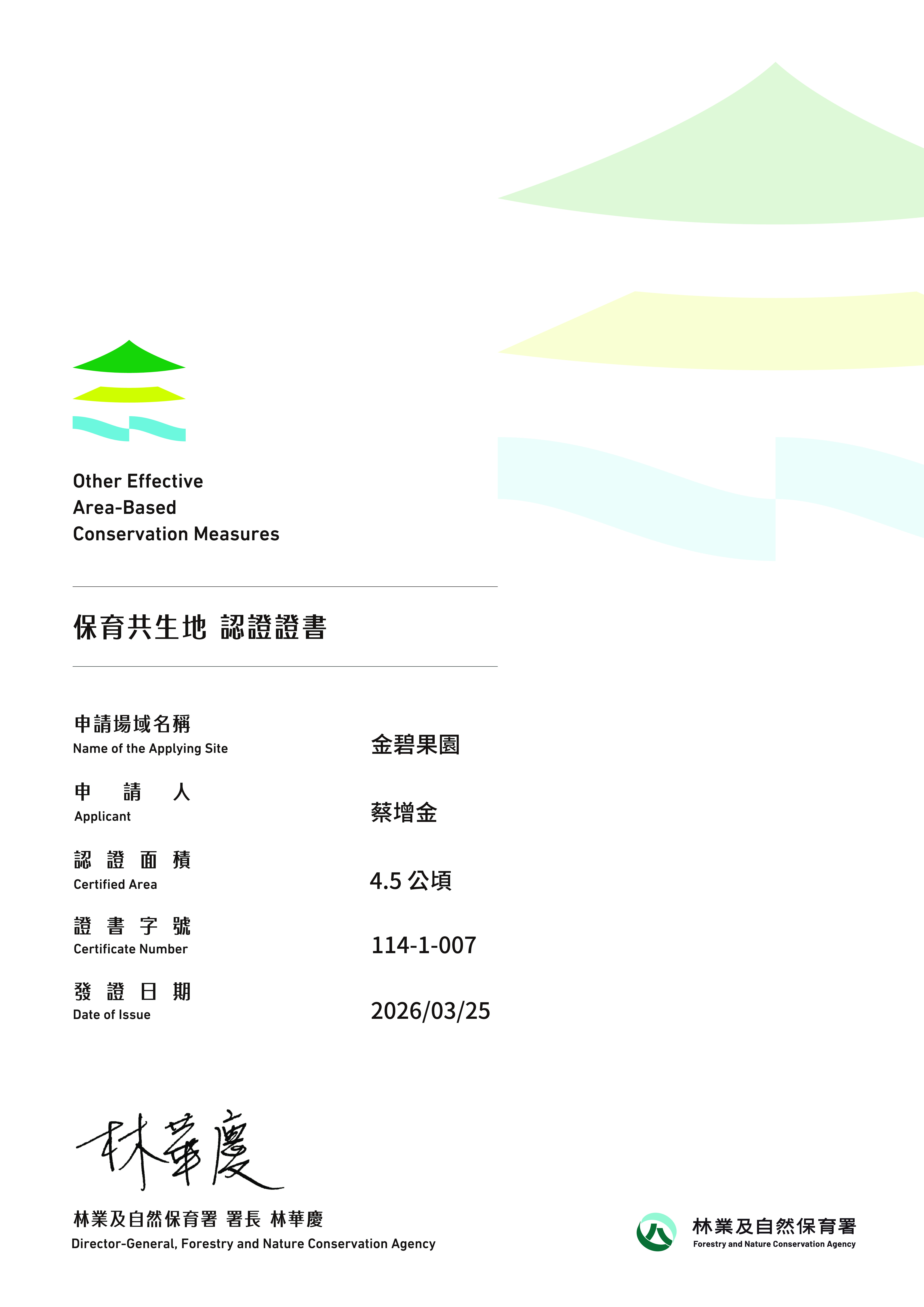 基本資料 認證分級 保育共生地 認證年度 114年 認證字號 114-1-007 申請人 蔡增金 行政區 南投縣中寮鄉 認證面積 4.5 公頃 生物多樣性價值 價值一 瀕危動植物之現存、潛在棲息及生長範圍或其復育場域價值三 物種生活史之關鍵棲地價值五 具生態連結或緩衝功能之區域價值七 經政府機關認可具生物多樣性保育功能之區域 場域簡介 秉持不使用農藥、除草劑及化肥的理念 ,自民國87年投入有機栽培,長期採行草生栽培以穩定坡地水土並提升土壤有機質 、促進土壤微生物多樣性,產出健康農產品、兼顧野生動物棲地保育價值;和眾多農友組成友善石虎團體,希望喚醒友善耕作認知。