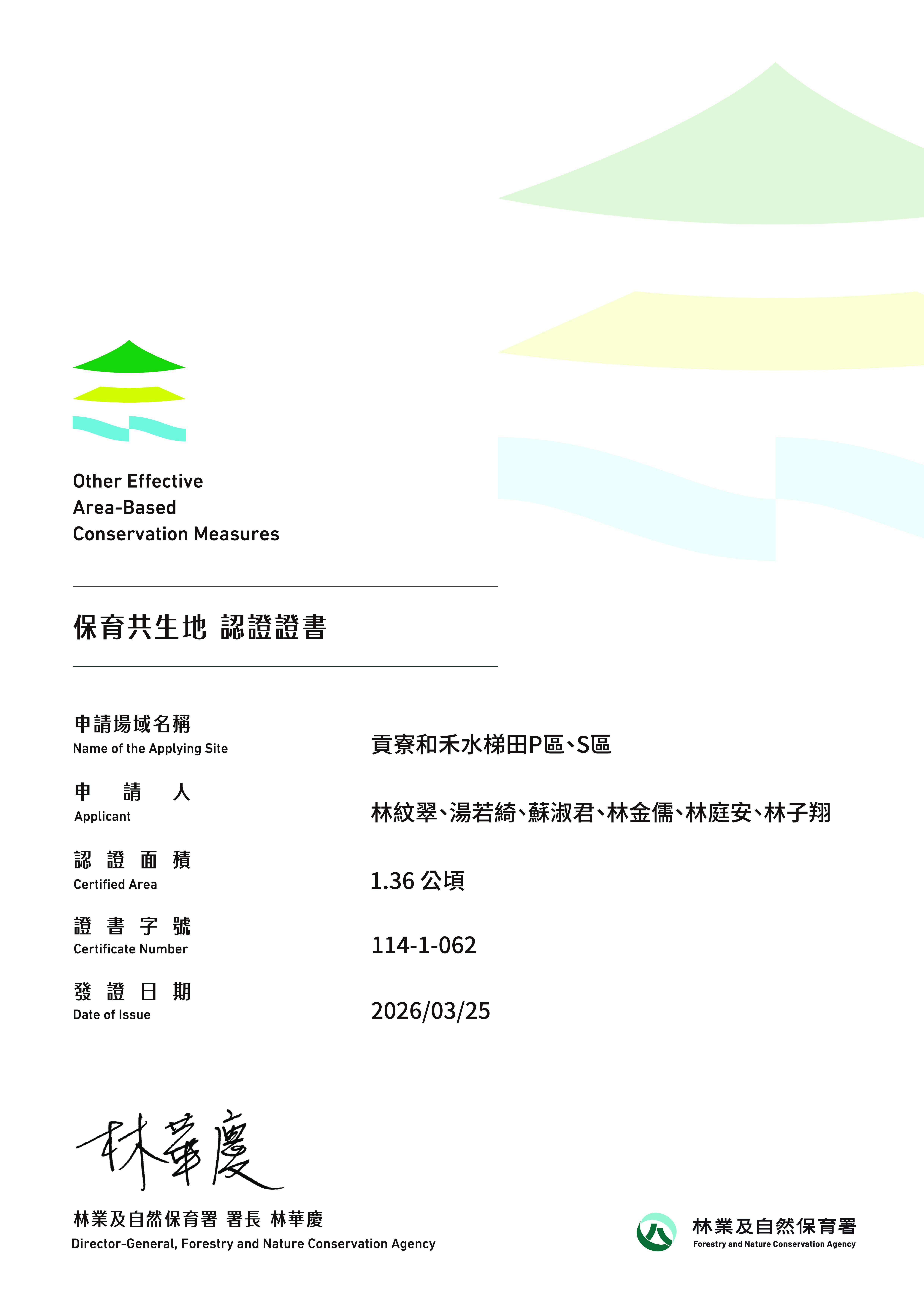 基本資料 認證分級 保育共生地 認證年度 114年 認證字號 114-1-062 申請人 林紋翠、湯若綺、蘇淑君、林金儒、林庭安、林子翔 行政區 新北市貢寮區 認證面積 1.36 公頃 (水域面積占 0.45 公頃) 生物多樣性價值 價值一 瀕危動植物之現存、潛在棲息及生長範圍或其復育場域價值二 依賴特殊環境之物種或狹域分布物種之現存、潛在棲息及生長範圍價值三 物種生活史之關鍵棲地價值五 具生態連結或緩衝功能之區域價值六 具生物多樣性保育功能之文化生活地景價值七 經政府機關認可具生物多樣性保育功能之區域 場域簡介 經營團隊由返鄉青農組成,秉持「和禾田間作業準則」,投入生物多樣性核心的農業經營 。場域環境森林環抱、蓄水穩定,是柴棺龜、青鱂魚及食蛇龜等瀕危物種的重要棲地,並成功復育葦草蘭等受脅植物。透過維持全年蓄水與低度擾動的人工耕作,傳承傳統水牛犁田文化,打造具保育功能的文化生活地景 。