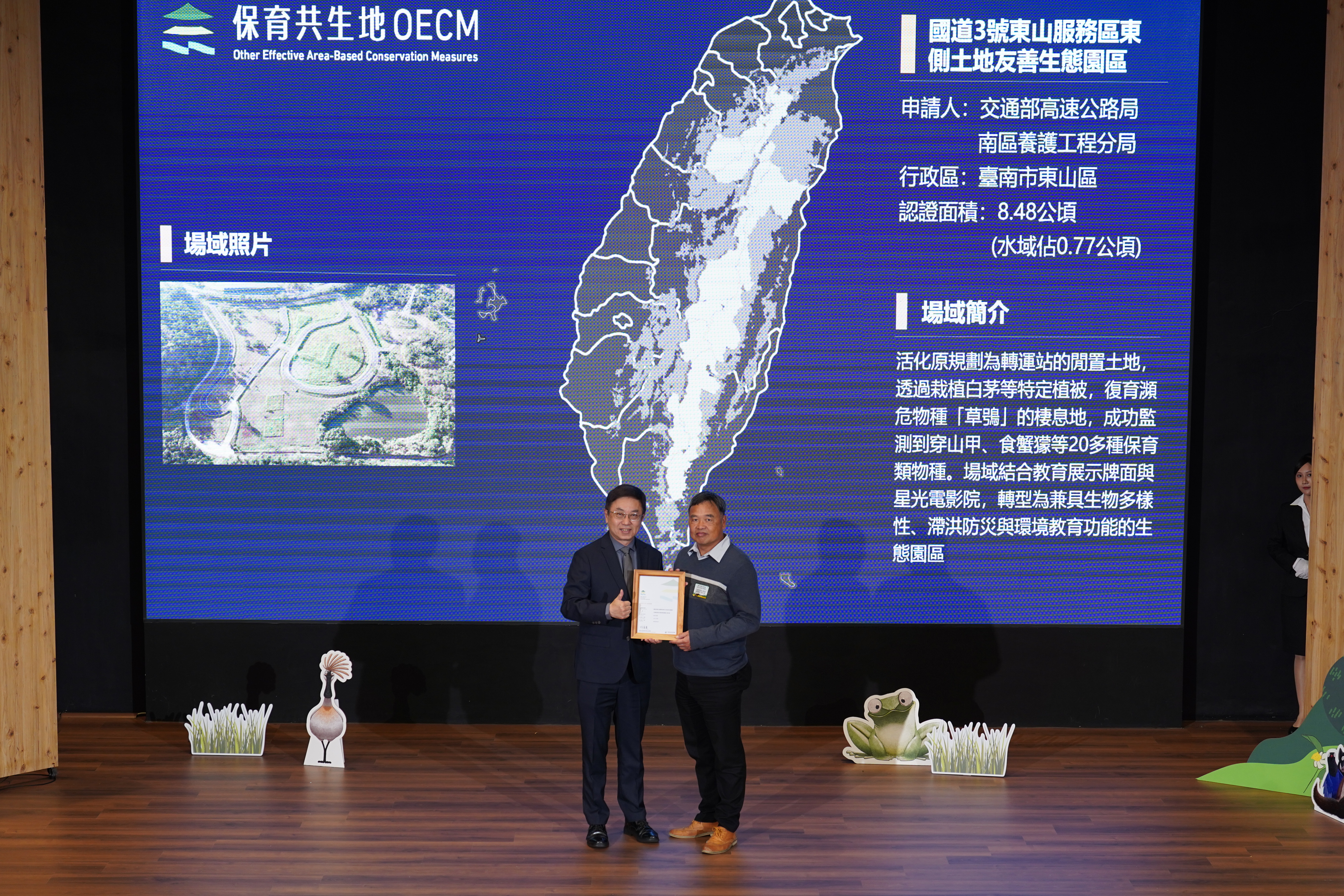 基本資料 認證分級 保育共生地 認證年度 114年 認證字號 114-1-035 申請人 交通部高速公路局南區養護工程分局 行政區 臺南市東山區 認證面積 8.48 公頃 (水域面積占 0.77 公頃) 生物多樣性價值 價值一 瀕危動植物之現存、潛在棲息及生長範圍或其復育場域價值二 依賴特殊環境之物種或狹域分布物種之現存、潛在棲息及生長範圍價值三 物種生活史之關鍵棲地價值五 具生態連結或緩衝功能之區域 場域簡介 活化原規劃為轉運站的閒置土地,透過栽植白茅等特定植被,復育瀕危物種「草鴞」的棲息地,成功監測到穿山甲、食蟹獴等20多種保育類物種。場域結合教育展示牌面與星光電影院,轉型為兼具生物多樣性、滯洪防災與環境教育功能的生態園區。