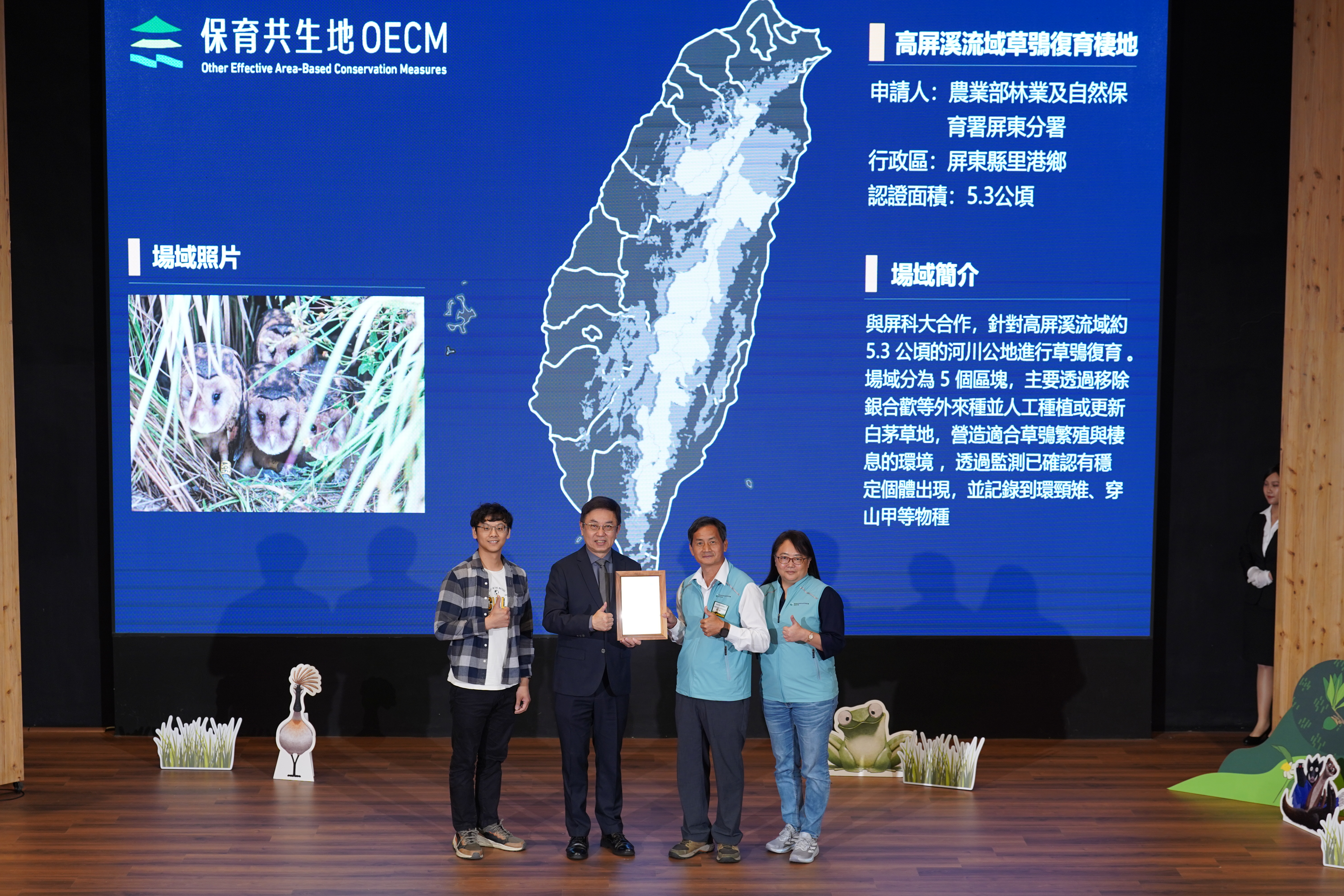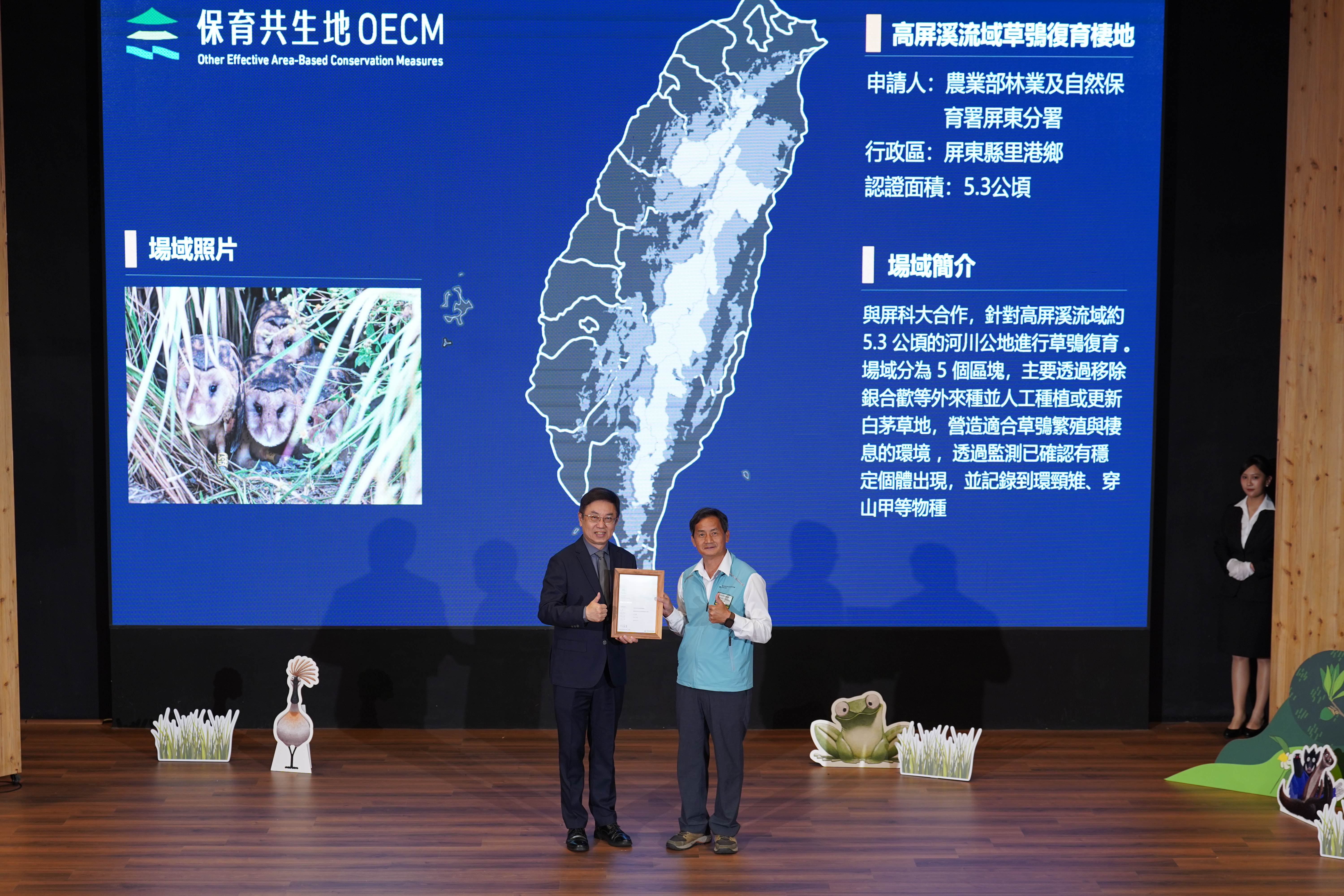 基本資料 認證分級 保育共生地 認證年度 114年 認證字號 114-1-038 申請人 農業部林業及自然保育署屏東分署 行政區 屏東縣里港鄉 認證面積 5.3 公頃 生物多樣性價值 價值一 瀕危動植物之現存、潛在棲息及生長範圍或其復育場域價值二 依賴特殊環境之物種或狹域分布物種之現存、潛在棲息及生長範圍價值三 物種生活史之關鍵棲地 場域簡介 與屏科大合作,針對高屏溪流域約 5.3 公頃的河川公地進行草鴞復育 。場域分為 5 個區塊,主要透過移除銀合歡等外來種並人工種植或更新白茅草地,營造適合草鴞繁殖與棲息的環境 ,透過監測已確認有穩定個體出現,並記錄到環頸雉、穿山甲等物種。