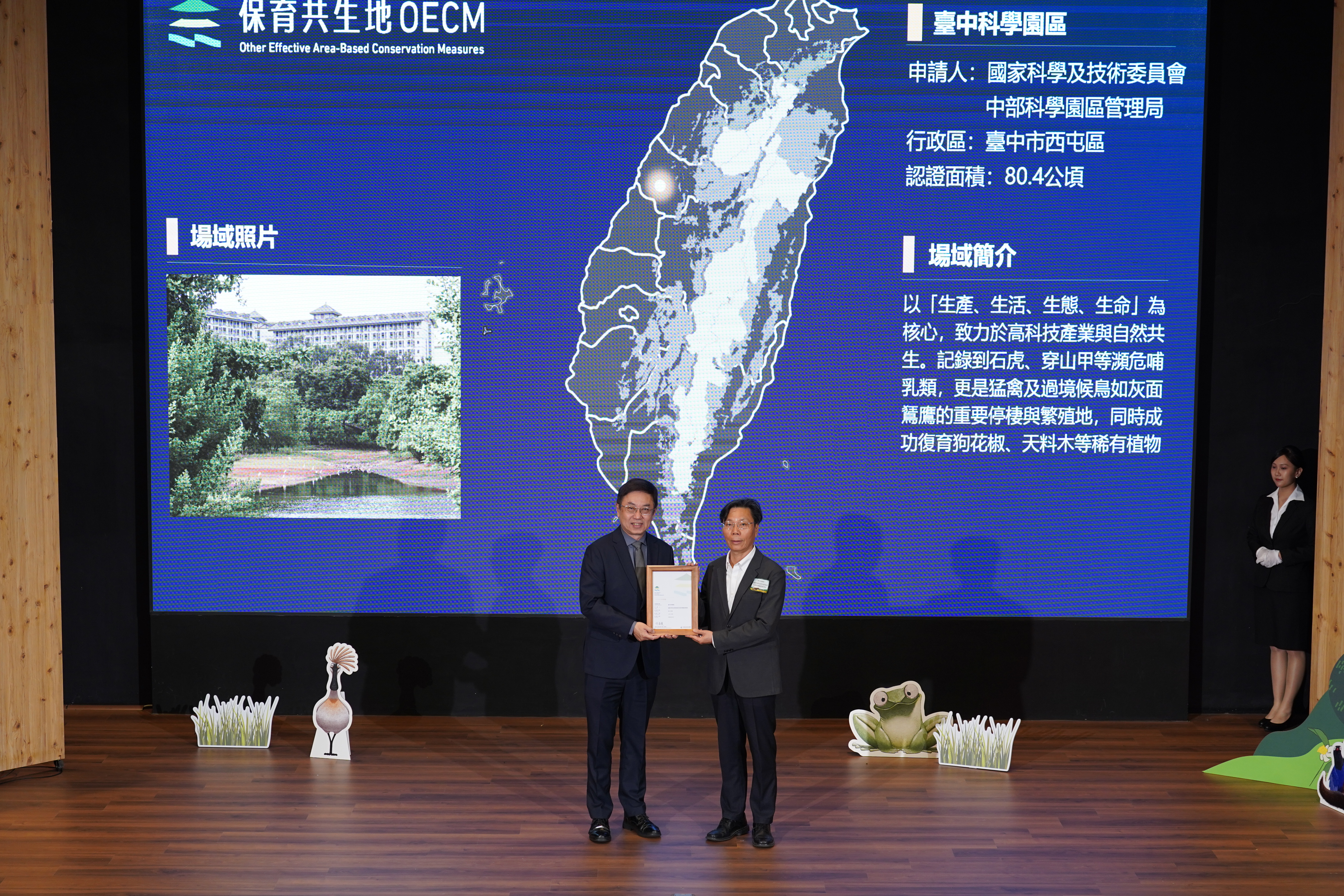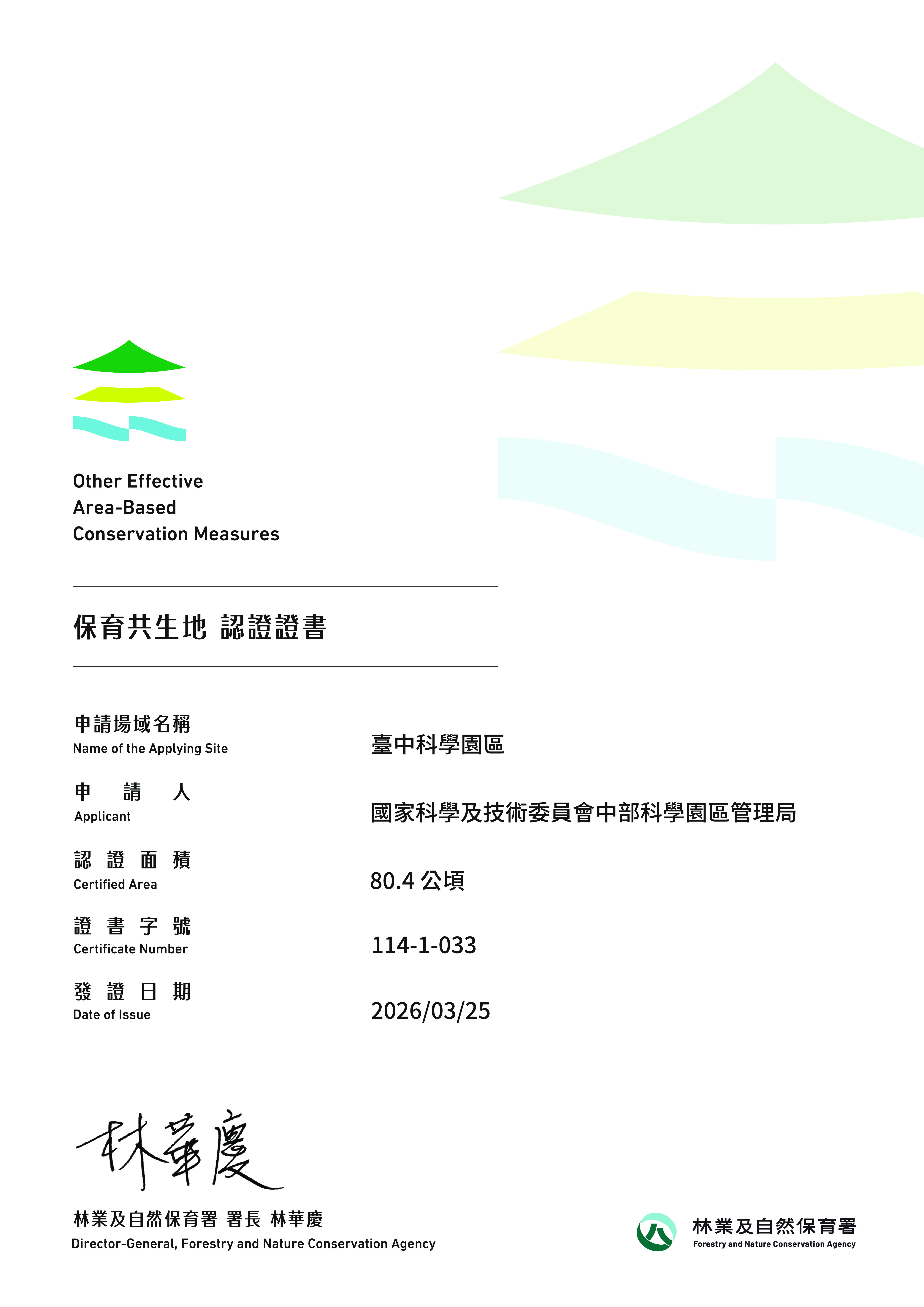 基本資料 認證分級 保育共生地 認證年度 114年 認證字號 114-1-033 申請人 國家科學及技術委員會中部科學園區管理局 行政區 臺中市西屯區 認證面積 80.4 公頃 生物多樣性價值 價值一 瀕危動植物之現存、潛在棲息及生長範圍或其復育場域價值二 依賴特殊環境之物種或狹域分布物種之現存、潛在棲息及生長範圍價值三 物種生活史之關鍵棲地價值五 具生態連結或緩衝功能之區域 場域簡介 以「生產、生活、生態、生命」為核心,致力於高科技產業與自然共生。記錄到石虎、穿山甲等瀕危哺乳類,更是猛禽及過境候鳥如灰面鵟鷹的重要停棲與繁殖地,同時成功復育狗花椒、天料木等稀有植物。