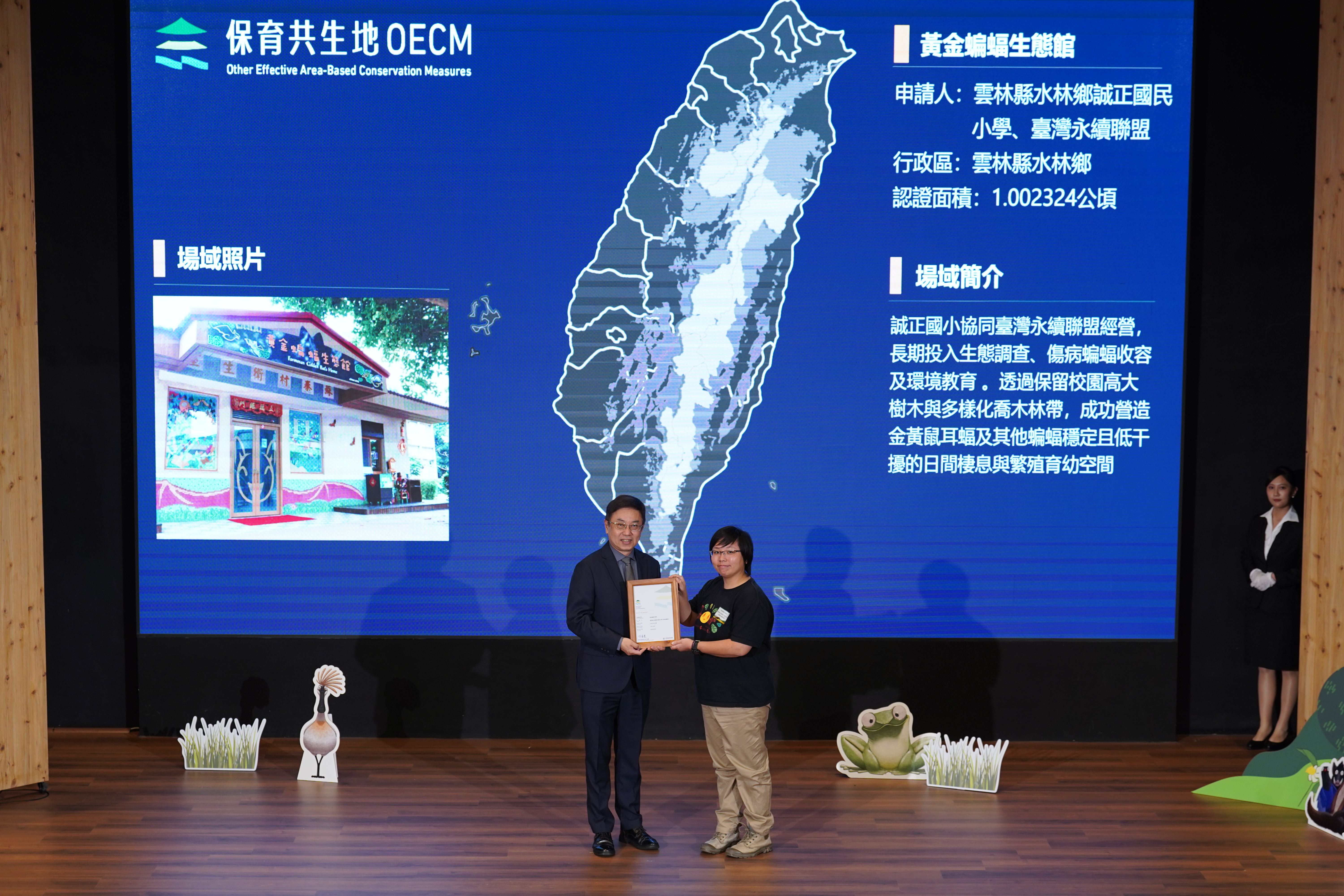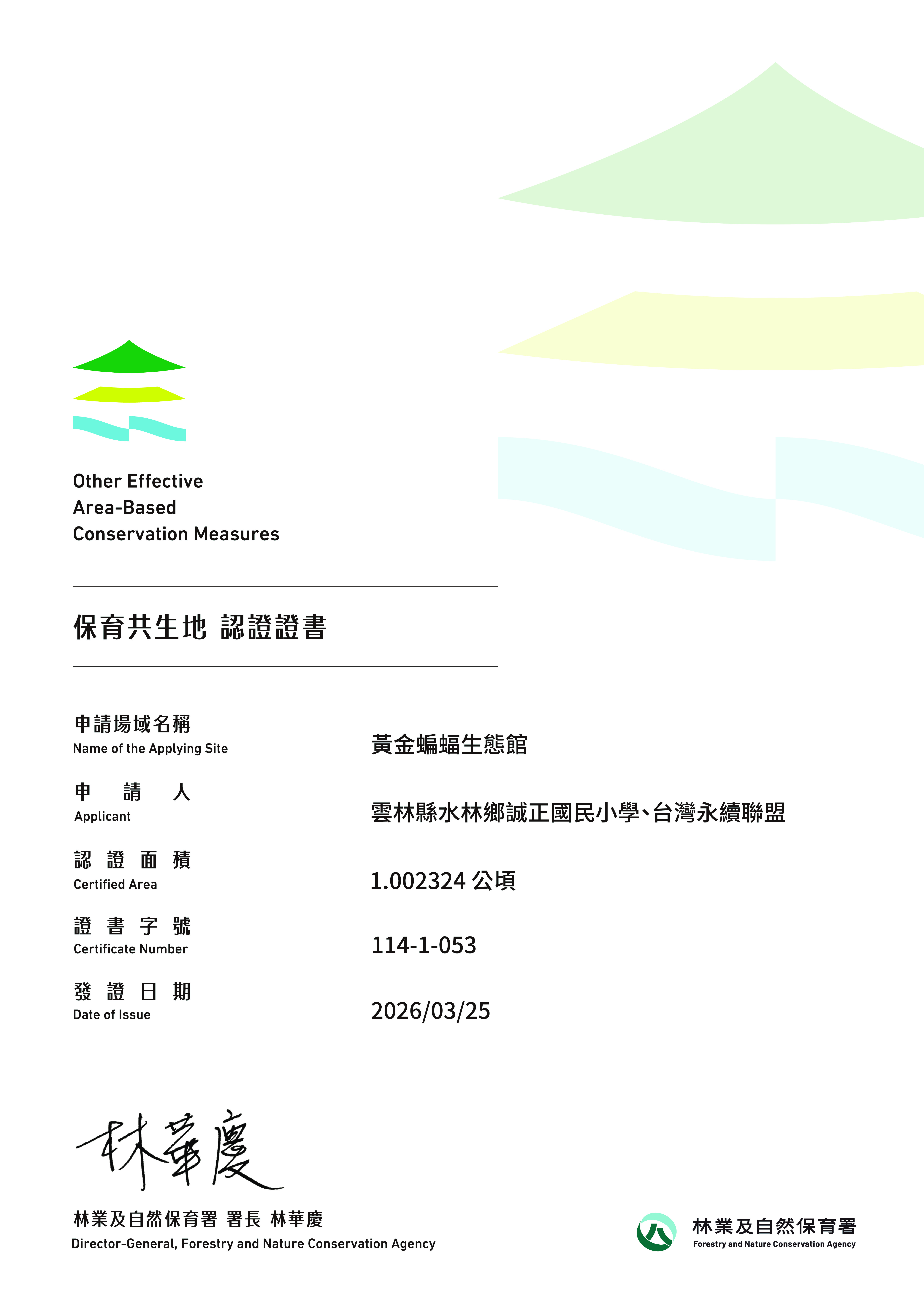 基本資料 認證分級 保育共生地 認證年度 114年 認證字號 114-1-053 申請人 雲林縣水林鄉誠正國民小學、台灣永續聯盟 行政區 雲林縣水林鄉 認證面積 1.002324 公頃 生物多樣性價值 價值一 瀕危動植物之現存、潛在棲息及生長範圍或其復育場域價值二 依賴特殊環境之物種或狹域分布物種之現存、潛在棲息及生長範圍價值三 物種生活史之關鍵棲地價值七 經政府機關認可具生物多樣性保育功能之區域 場域簡介 誠正國小協同台灣永續聯盟經營,長期投入生態調查、傷病蝙蝠收容及環境教育 。透過保留校園高大樹木與多樣化喬木林帶,成功營造穩定且低干擾的日間棲息與繁殖育幼空間。