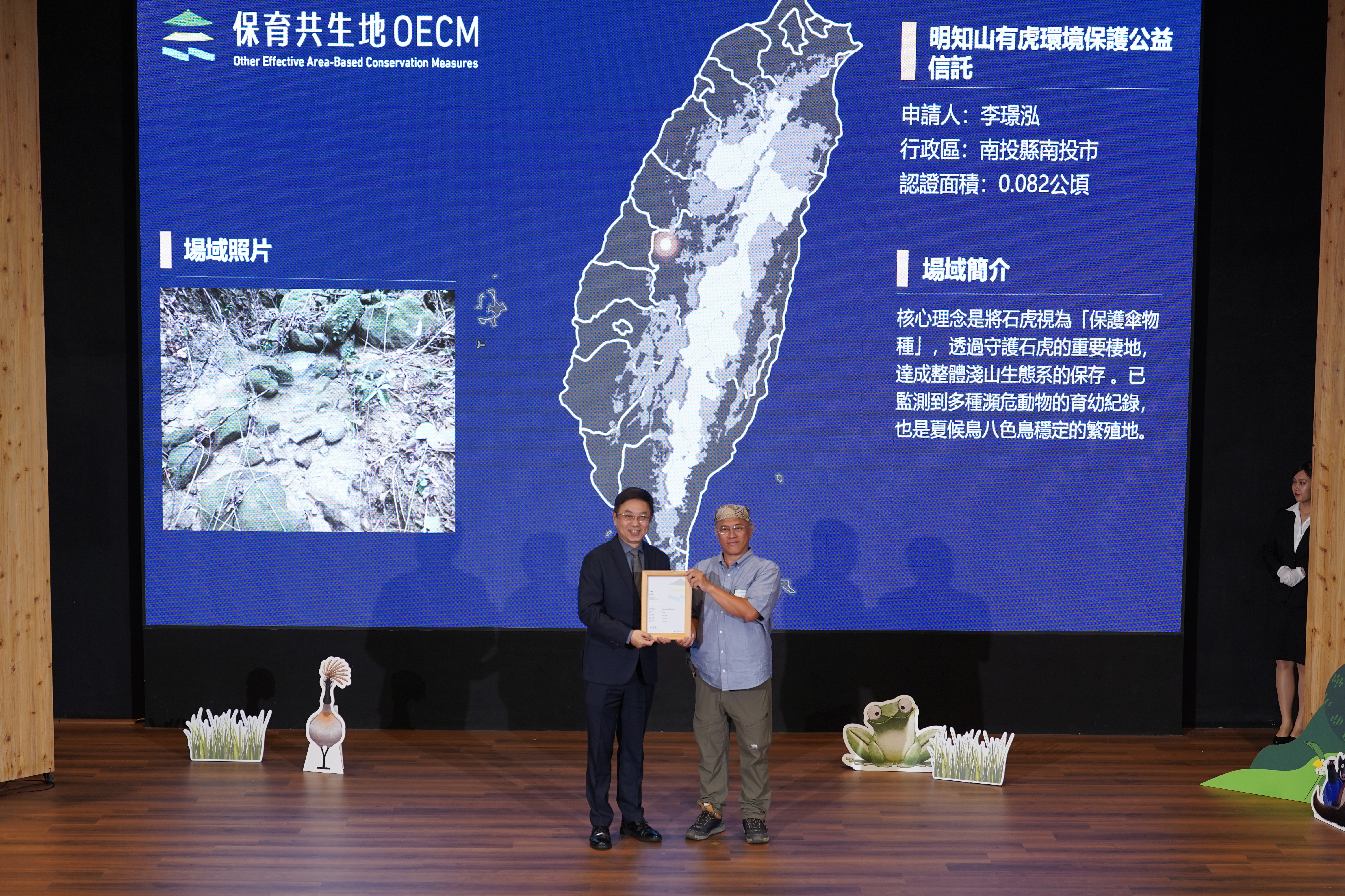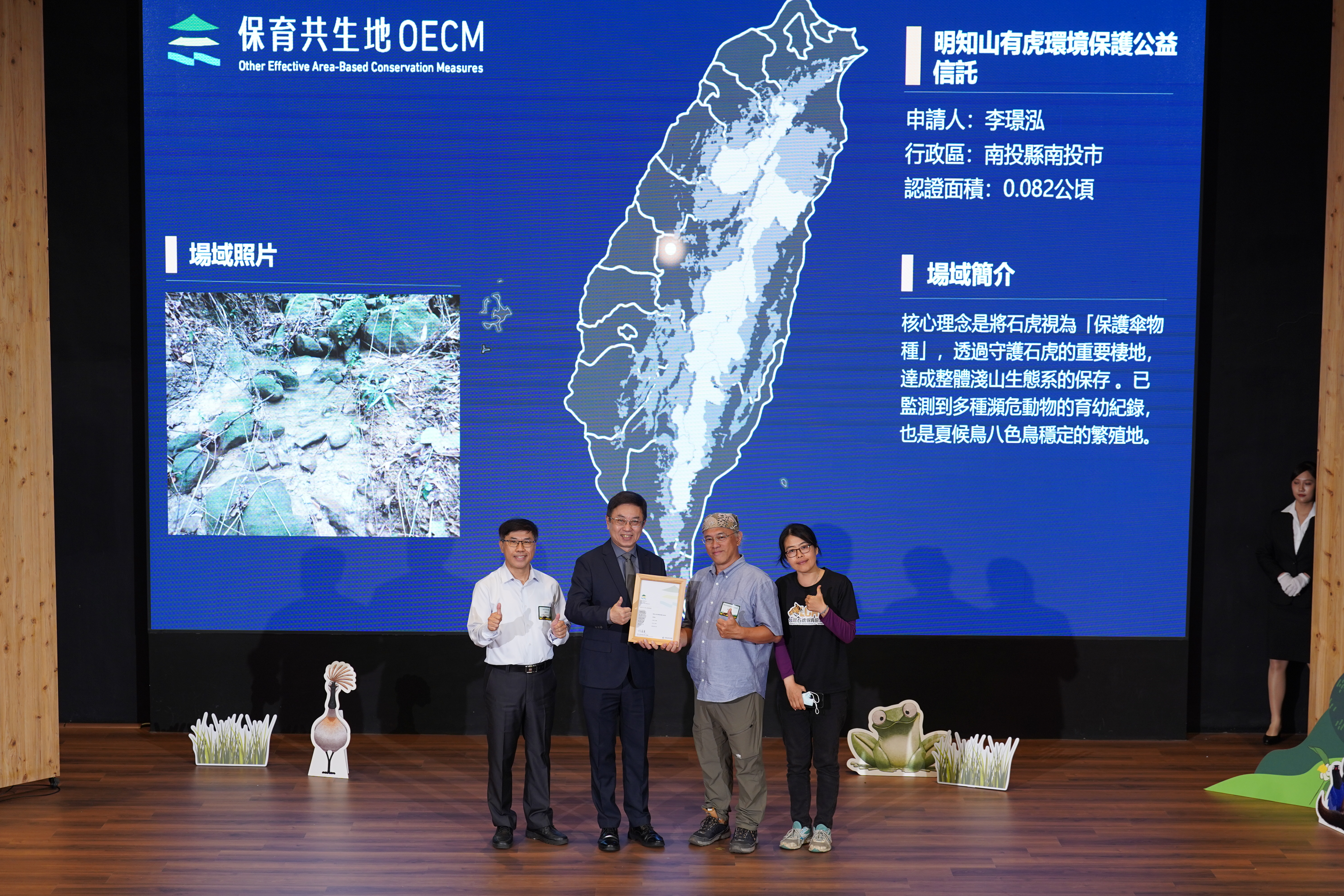 基本資料 認證分級 保育共生地 認證年度 114年 認證字號 114-1-040 申請人 李璟泓 行政區 南投縣南投市 認證面積 0.082 公頃 生物多樣性價值 價值一 瀕危動植物之現存、潛在棲息及生長範圍或其復育場域價值五 具生態連結或緩衝功能之區域價值七 經政府機關認可具生物多樣性保育功能之區域 場域簡介 核心理念是將石虎視為「保護傘物種」,透過守護石虎的重要棲地,達成整體淺山生態系的保存 。已監測到多種瀕危動物的育幼紀錄,也是夏候鳥八色鳥穩定的繁殖地。致力於在面臨遊蕩犬貓、外來入侵物種及本土失衡生物(如疣胸琉璃蟻)的威脅下,維持棲地的完整性與功能。