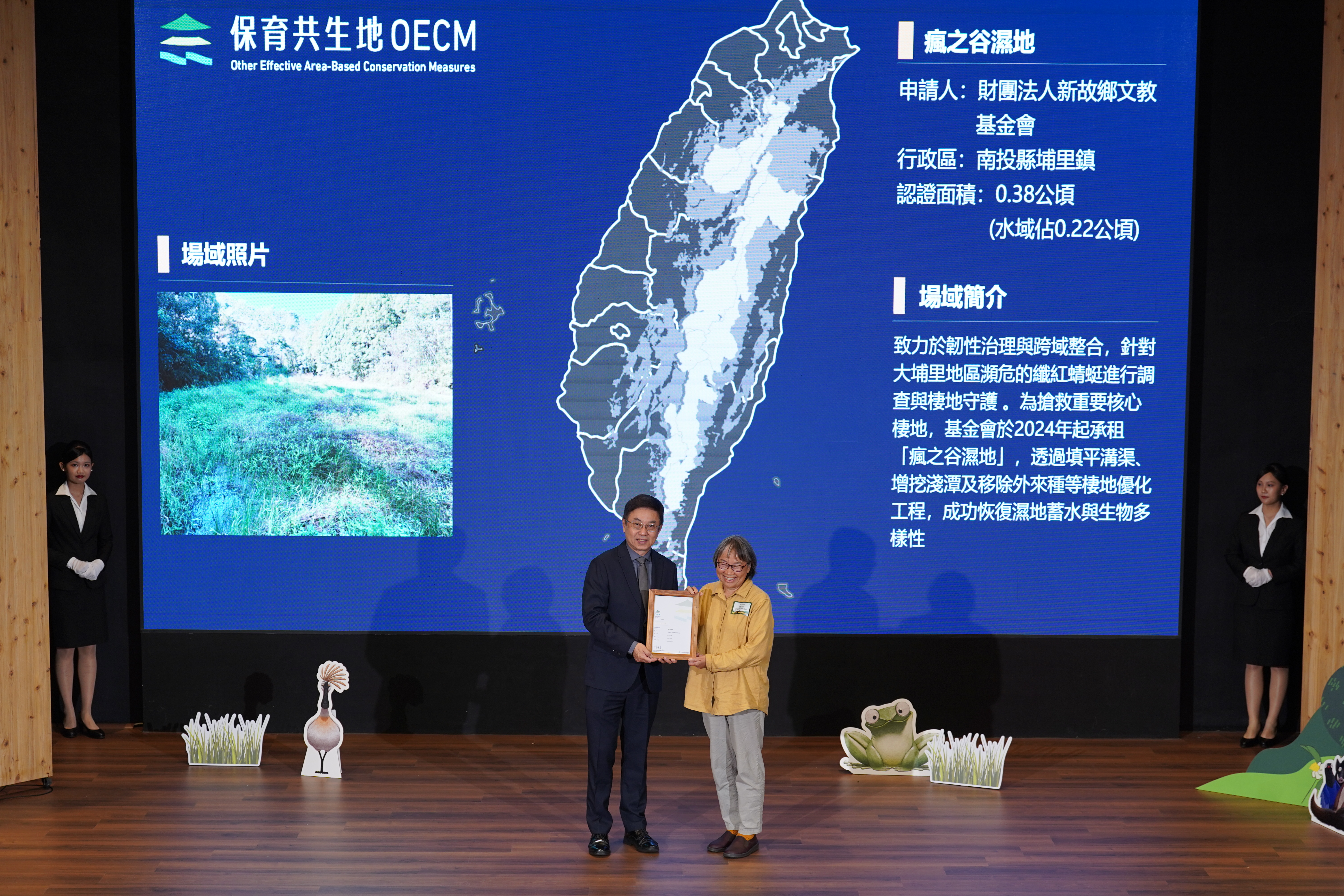 基本資料 認證分級 保育共生地 認證年度 114年 認證字號 114-1-036 申請人 財團法人新故鄉文教基金會 行政區 南投縣埔里鎮 認證面積 0.38 公頃 (水域面積占 0.22 公頃) 生物多樣性價值 價值一 瀕危動植物之現存、潛在棲息及生長範圍或其復育場域價值二 依賴特殊環境之物種或狹域分布物種之現存、潛在棲息及生長範圍價值三 物種生活史之關鍵棲地價值四 特殊或完整之天然棲地或生態系價值五 具生態連結或緩衝功能之區域 場域簡介 致力於韌性治理與跨域整合,針對大埔里地區瀕危的纖紅蜻蜓進行調查與棲地守護 。為搶救重要核心棲地,基金會於2024年起承租「瘋之谷濕地」,透過填平溝渠、增挖淺潭及移除外來種等棲地優化工程,成功恢復濕地蓄水功能與生物多樣性。