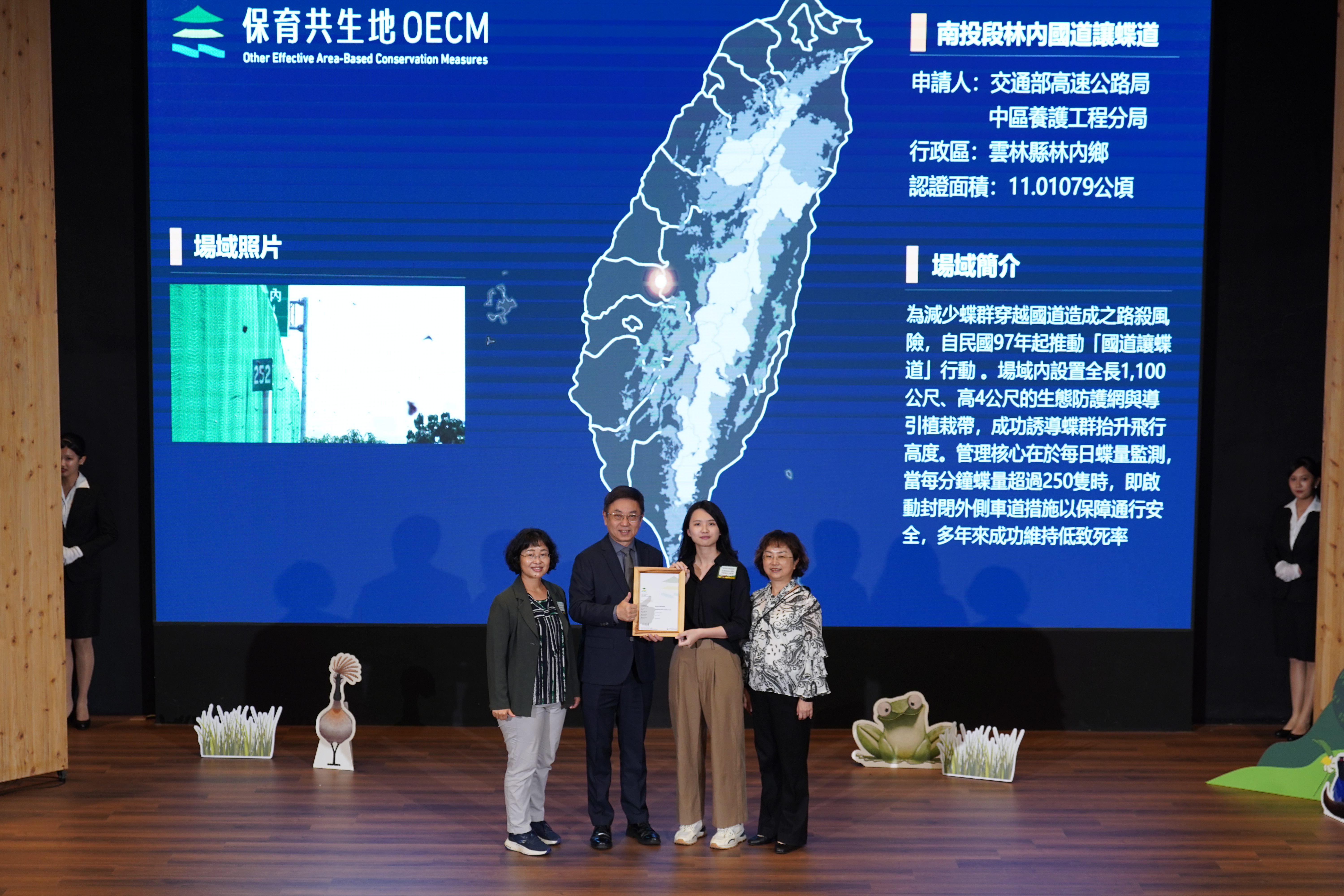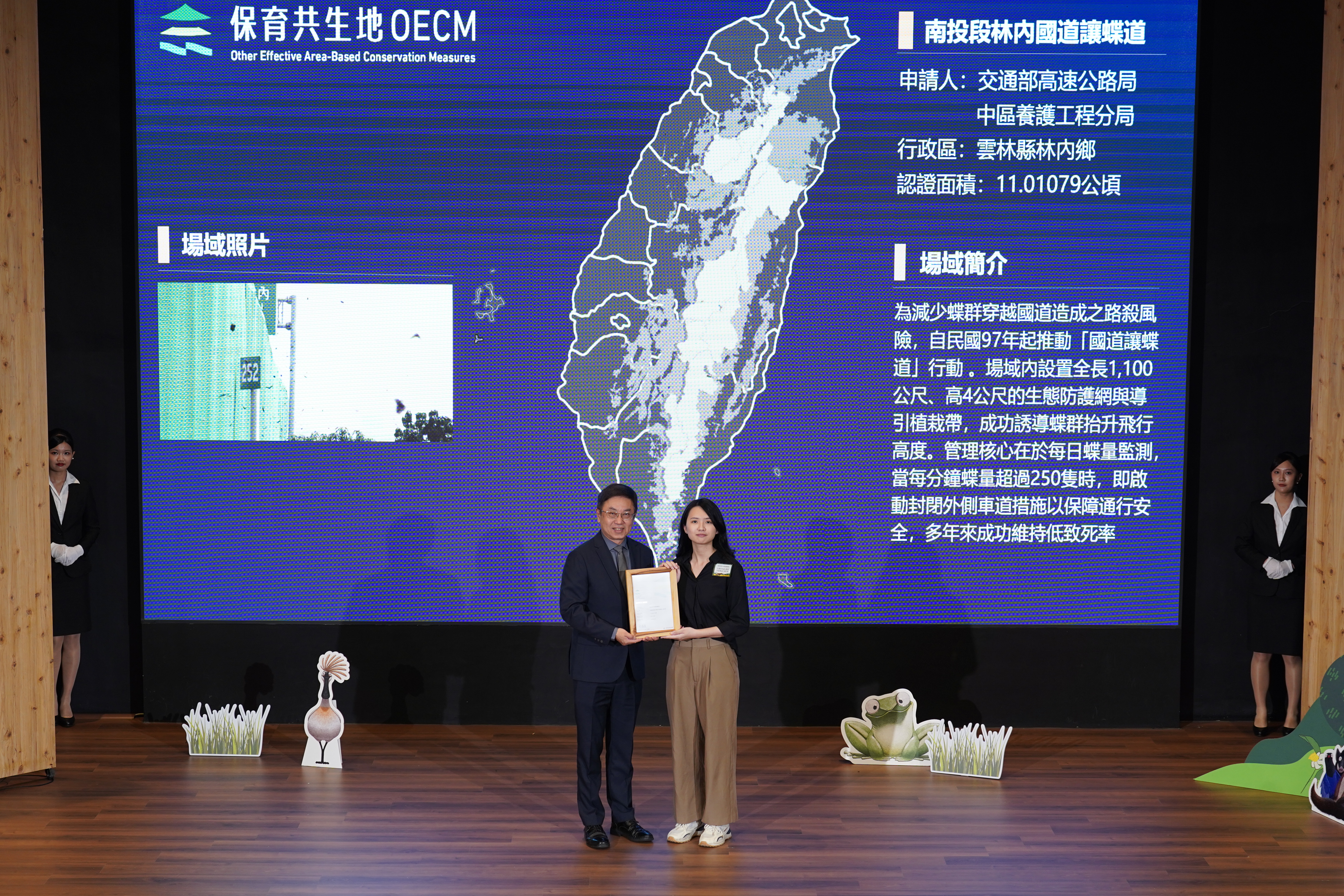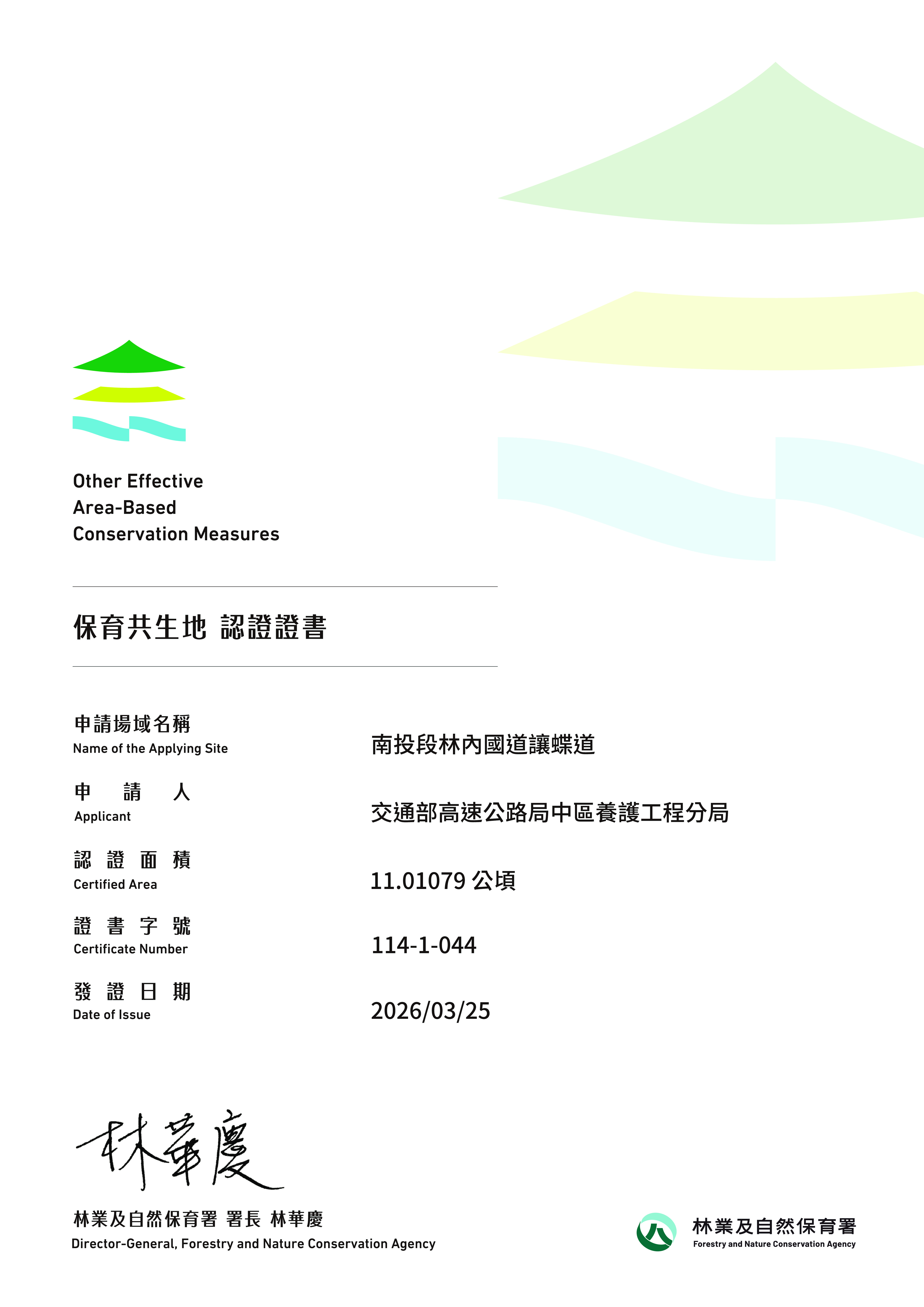 基本資料 認證分級 保育共生地 認證年度 114年 認證字號 114-1-044 申請人 交通部高速公路局中區養護工程分局 行政區 雲林縣林內鄉 認證面積 11.01079 公頃 生物多樣性價值 價值五 具生態連結或緩衝功能之區域 場域簡介 為減少蝶群穿越國道造成之路殺風險,自民國97年起推動「國道讓蝶道」行動。場域內設置全長1,100公尺、高4公尺的生態防護網與導引植栽帶,成功誘導蝶群抬升飛行高度。管理核心在於每日蝶量監測,當每分鐘蝶群數量超過250隻時,即啟動封閉外側車道措施以保障通行安全,多年來成功維持低致死率。