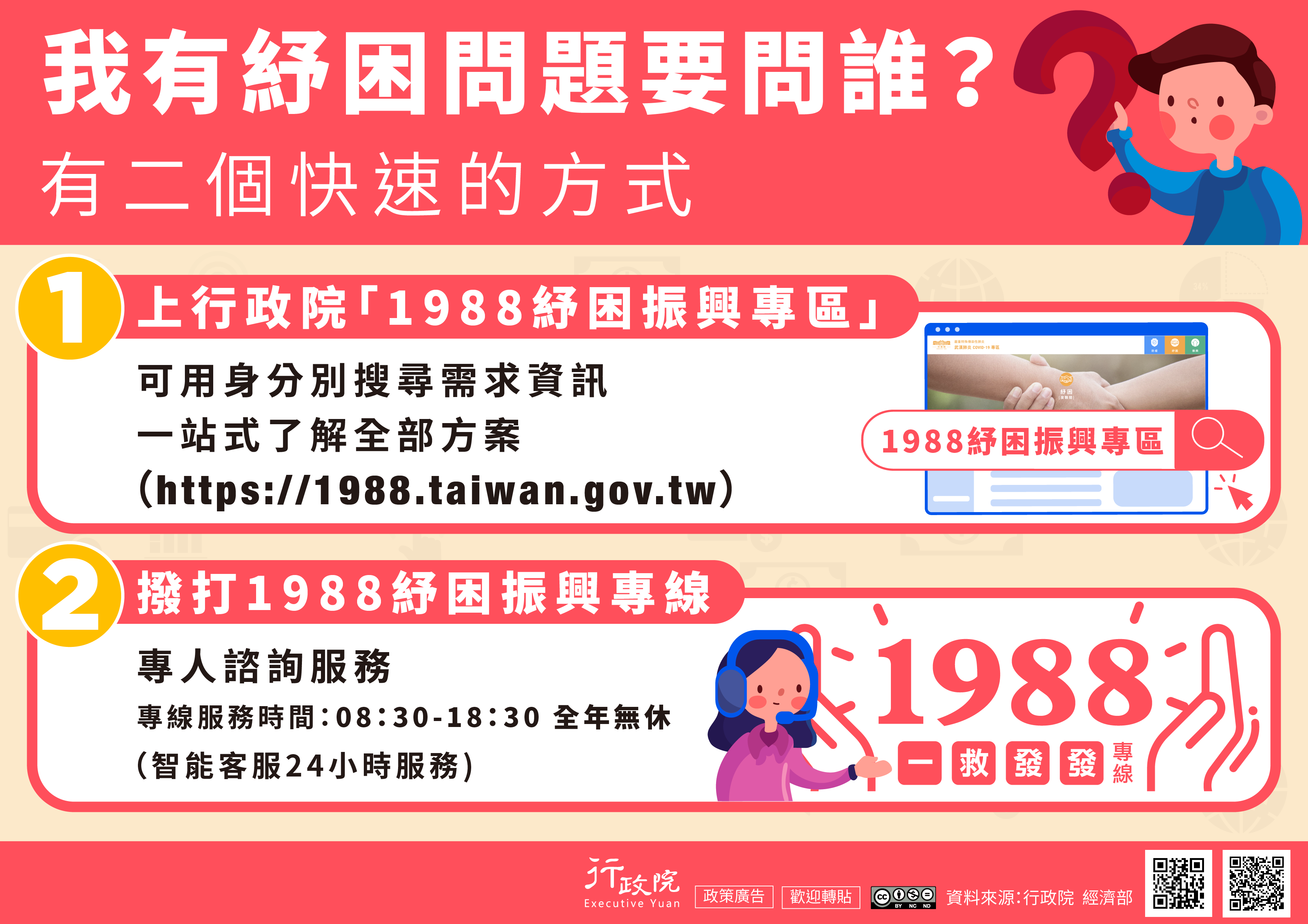 為因應COVID-19(嚴重特殊性傳染肺炎)所帶來之衝擊,行政院設置了「1988顧台灣」紓困振興專網,提供民眾依身分別一站式了解各項紓困需求方案,並指示經濟部成立「1988紓困振興專線」免付費專線,民眾或企業以手機或市話直接撥打1988即可接通客服專員,提供中英文服務,服務時間為每日8:30~18:30,周一至周日均可撥打,並連結智能客服可提供24小時線上提問,歡迎需求民眾踴躍使用!