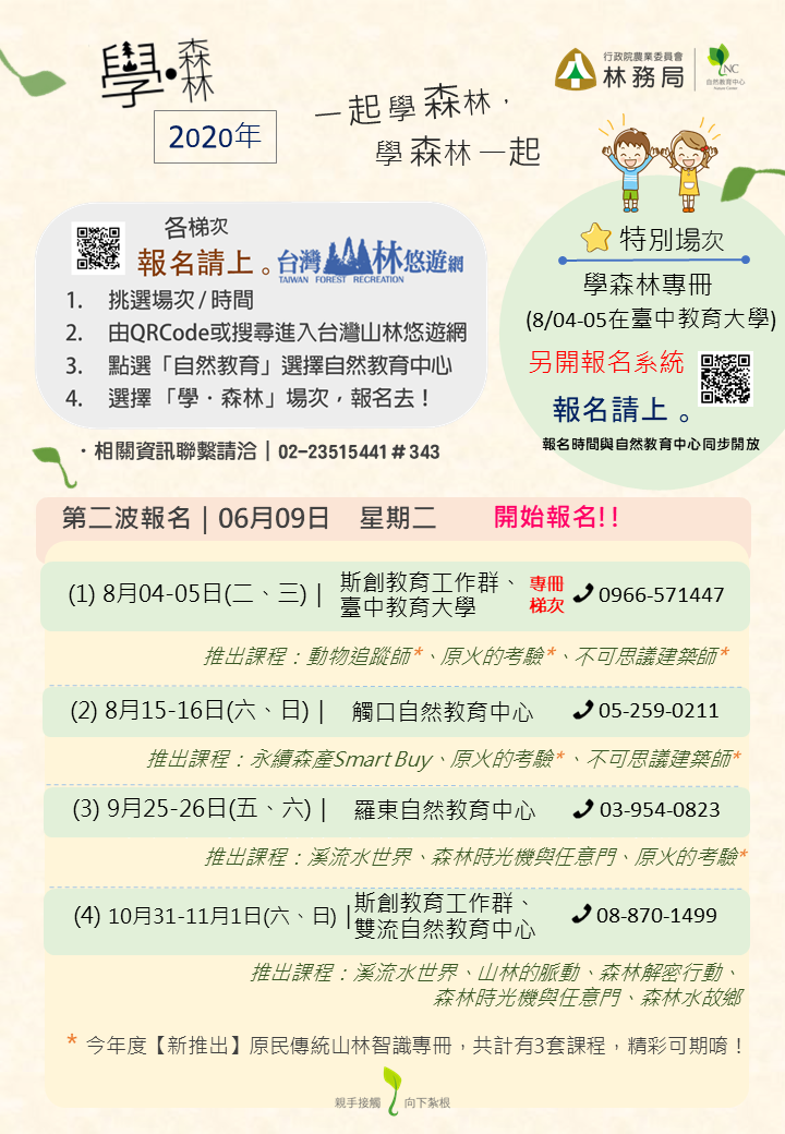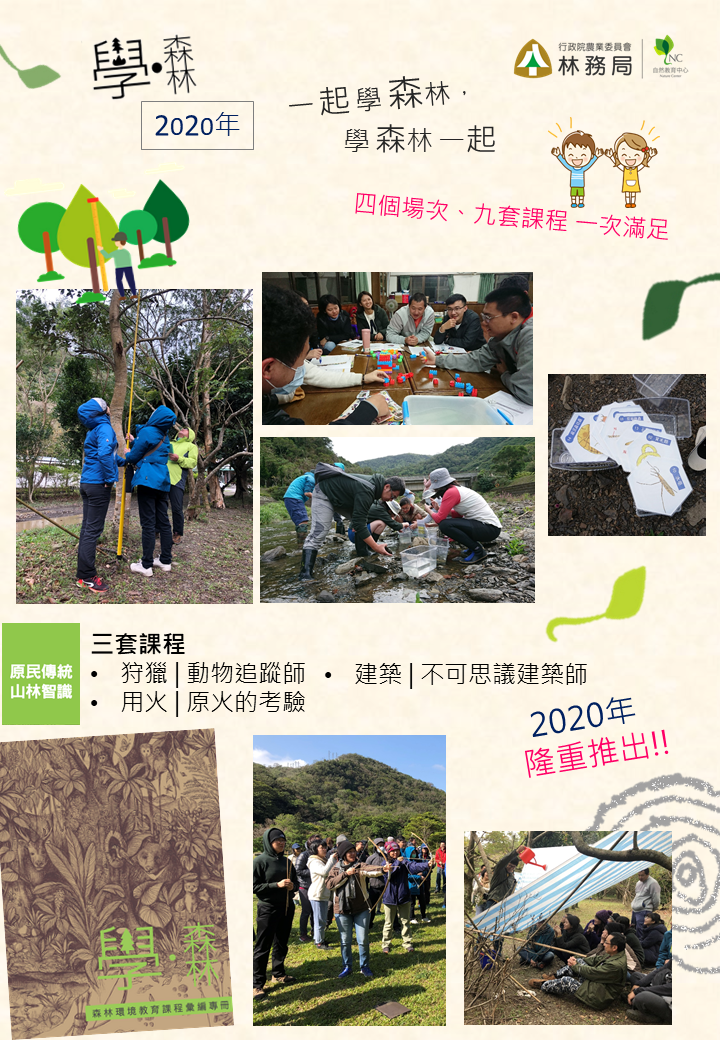 林務局自然教育中心在2017年將精彩的課程彙編出版「學.森林」套書,裡頭包含12套好玩有趣、具科學精神、豐富又知性、跨科際、跨領域的「森林課程」!在2017-2019年期間,已經有518位來自全台各地對森林主題有興趣的老師及民眾,在參與工作坊後成為種子教師。2020年期待更多人一起加入「學.森林」的推廣行列! 感謝大家熱情參與!上半年「學.森林」系列工作坊已圓滿結束!下半年第2波報名於6月9日上午9:00開始,於觸口自然教育中心、羅東自然教育中心以及雙流自然教育中心辦理!報名請上台灣山林悠遊網(https://recreation.forest.gov.tw/),點選「自然教育」,並於各自然教育中心「專業研習」服務項目進行線上報名。 第二場次「原民傳統山林智識」專冊工作坊,也同步開放報名,請上(https://www.accupass.com/go/educationforest)報名參加。歡迎有興趣的學校教師、環境教育工作者或對森林環境教育有興趣的民眾一起來參與!