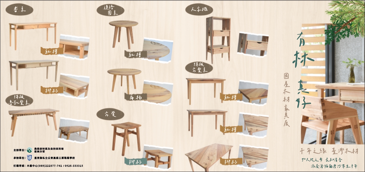林業保育署臺東分署與公東高工攜手創作國產材特色家具,「有林真好-國產木材家具」全國巡迴展第3場將於8月18日(星期五)起進駐新竹科學園區尼尼生活館(新竹市東區新安路2-1號),至8月27號進行為期10天的家具展售活動,本場次邀請新竹分署合作展出販售運用國產材製作小型創意商品及以國產材為主題《外公家的小木貓》故事繪本、及可供建築及木藝產業從業人員參考工具書「常見國產材利用手冊」,合力向國人推介「國產·材好」,擴展介紹國產材多元利用性,提高林產經濟效益。 公東高工是培育木材加工及工藝創作人才的搖籃,更是發展國產家具產業的重要據點,木工技術及設計製作的家具獲各界人士青睞喜愛,特別是傳統接榫、結構接合工料技術。近年在林業保育署及臺東分署導入多項資源支持下,公東高工於人才培力及產業發展上扎根前行,本次家具展產品多數是運用國產木材結合木工技巧,並加入原住民文化及工藝,將文化元素與傳統技藝巧妙的融入家具產品,也是校方透過教學課程,引導學生在製程中學習相關工藝與文化知識,所激發出來的精彩創作,期待讓國人在接觸溫潤質感國產材家具的同時,更能認識其特殊紋路及材質特性,感受使用低碳足跡國產材家具的價值與優勢。 本場家具展的作品運用了疏伐木紅檜、臺灣杉、柳杉及漂流木紅檜、牛樟、扁柏等。師生們依不同樹種材料特性設計及製作產出高方桌、併板方餐桌、達悟圓桌、書桌、辦公桌、併板魯凱餐桌、方凳、原民風矮櫃、原民風長凳、板型餐椅、原民風魚簍燈、圓滿、螢幕架等28款做工精緻及蘊含美學概念的家具,完美呈現臺灣優質的原木素材及手工全榫卯結構的技術,展售期間歡迎大家前往選購,同時開放電話及公東木藝KTUS Wooden Art粉絲專頁留言訂購,訂購專線089-222877轉741。 今年「有林真好」3場家具巡迴展前二場已於臺中及高雄展出圓滿結束,最後一場自8月18日至8月27日於新竹科學園區尼尼生活館展出,臺東分署吳昌祐分署長表示,此次家具展係臺東分署與公東高工合作推動國產材加值計畫成果,目的是使國人更認識及使用國產材,讓國產材成為提升居家生活品質及兼顧友善生態環境產業發展的具體實踐,更呼應政府積極推動淨零政策的核心主軸。在綠色消費的百年大計中,「國產的材好」國產木材最能適應臺灣氣候,好用且耐久,邀請民眾前往展場參觀、欣賞及交流,選購您所喜愛的國產材家飾、家具,攜手支持國產材優質產品。