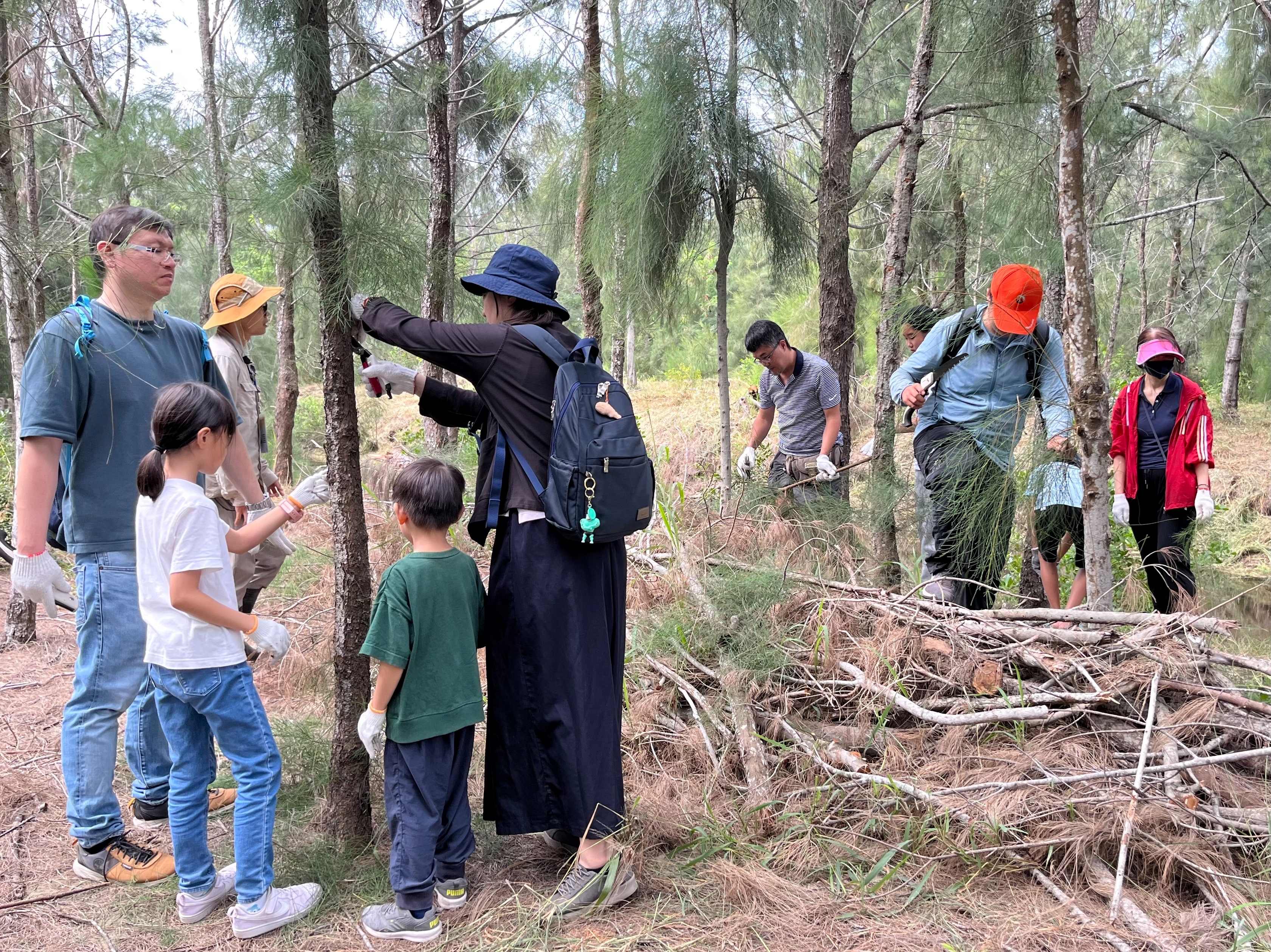 活動先以闖關方式進行環境教育,讓聯電志工了解「好美」保安林由在地居民以家園地名命名,再透過風速測量小實驗了解保安林防風擋沙的功能,接著解謎保安林暗藏火災、廢棄物等危機,認識保安林生物棲息環境等,並邀請志工對森林許下承諾,共同支持生物多樣性維護與森林保育。完成闖關後,聯電志工著手進行保安林木麻黃枯枝修剪工作,讓林下植物有更好的生長空間,也讓環境更加乾淨整潔,並將整理下來的枝條用於營造生物棲地,進一步提升保安林生物多樣性。