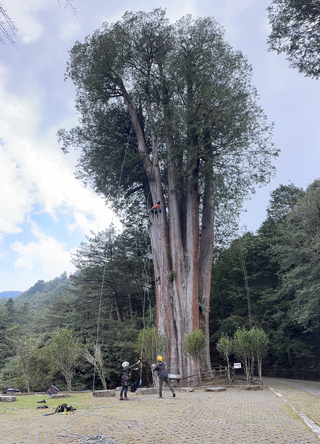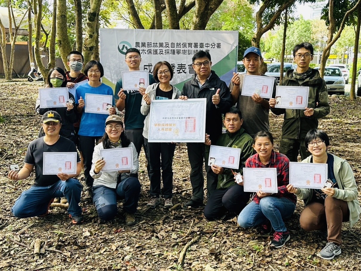為加強人員於森林樹冠層從事林木採種及自然保育等作業的安全,林業及自然保育署臺中分署辦理為期30小時的攀樹技能訓練,共有12位林業人員訓後通過專業知識及技術測驗取得攀樹證照,今(23)日於東勢林業文化園區舉辦「樹木保護及採種攀樹訓練計畫」成果發表會,頒發結業證書及授證儀式。當日更展示了攀樹採種裝備及工作照片等成果,並結合現場攀樹體驗,讓民眾更了解樹冠層工作的樣態。 林業保育署臺中分署表示,樹冠層工作包含林木採種、野生動植物調查及監測、樹木檢查、枯枝修剪、病蟲害防治等,但林木高度動輒20公尺以上,過去如徒手攀爬、使用工作梯或以打鋼釘的方式攀爬樹木,已不符合目前森林多元工作的安全需求與保育觀念。為確保人員都能安全並準確地完成森林工作任務,該分署特邀請3位國際樹藝協會(ISA)認證攀樹師擔任講師,從繩結應用、樹上採種工具使用,到空中救援與裝備保養,協助林業人員精進攀樹技能及增進作業安全。 為確保人員都能安全並準確地完成森林工作任務,透過筆試與術科考試,考驗人員在攀樹工作的安全認知與操作技能。術科考試以二人一組進行測驗,測驗項目包含投擲、單繩系統架設(SRS)、攀爬、雙繩系統轉換(MRS)及樹上作業等項目,除了測驗攀樹技能外還考驗二人間默契,讓人員在高聳樹木上能相互照應,是工作安全的重點之一。這次12名考生全數通過,其中還有3位女生巾幗不讓鬚眉,也在今日成果發表會中授頒攀樹證照,為日後林木採種及樹冠層調查增加生力軍。 林業保育署臺中分署表示,該分署人員已應用攀樹技術進行樹冠層珍稀植物、野生動物監測及林木採種等工作,卓有成效。為推廣攀樹技術的應用,今日提供民眾攀樹體驗活動,吸引了60位民眾報名,許多小朋友都來嘗試與樹冠層的親密接觸,更有民眾表示,首次體驗用不同角度與高度看樹木的樂趣,也了解到樹冠層作業時的難度與刺激,更敬佩林業人員的膽識與敬業。