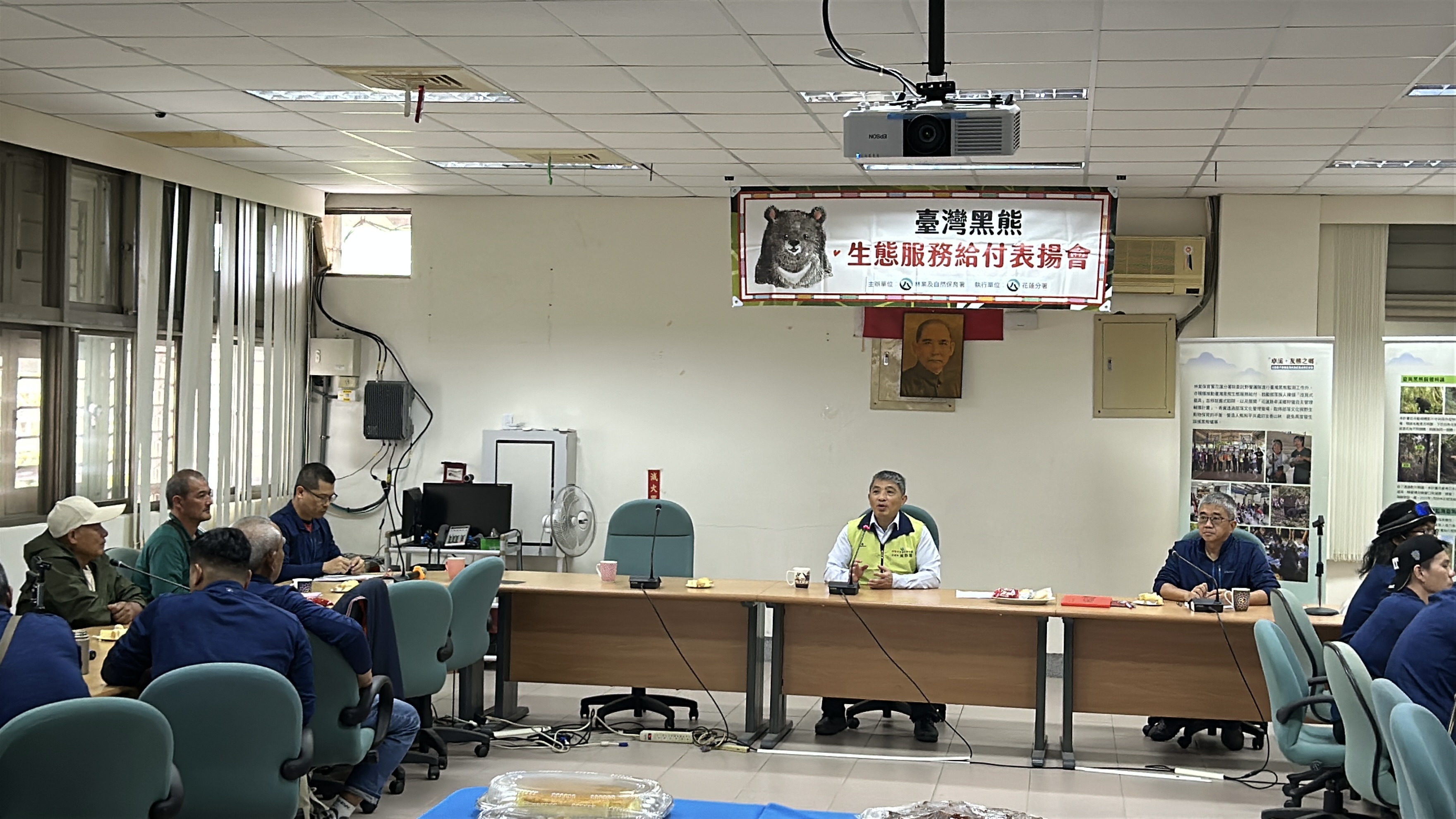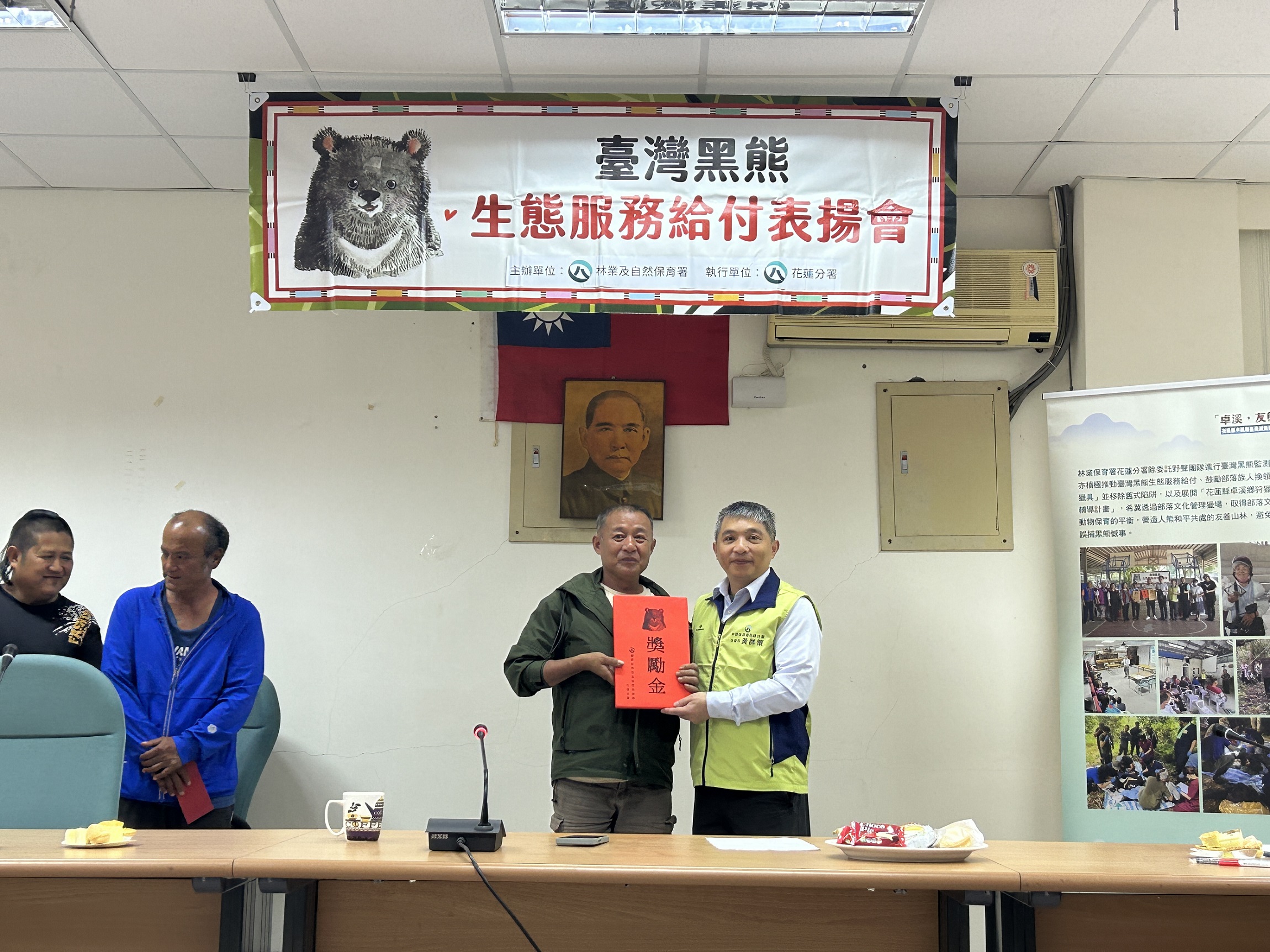 花蓮分署依據「臺灣黑熊生態服務給付方案」,於24日辦理公開表揚,感謝兩起事件通報人、梅醋工坊主人及蜂農共5位,分別頒發入侵通報獎勵金、入侵監測獎勵金,並補償蜂農蜂箱損失,感謝族人主動通報,積極配合相關防熊措施,將黑熊造成的損失降到最低,也大大避免了人熊衝突。砍草工代表林先生說,第一次看到黑熊非常開心,池姓蜂農則說,現在想起來仍餘悸猶存,雖然害怕但知道黑熊稀少很需要保育,也會積極配合相關防熊措施。今天表揚夥伴皆齊聲允諾,未來會持續參與保育臺灣黑熊的行動。