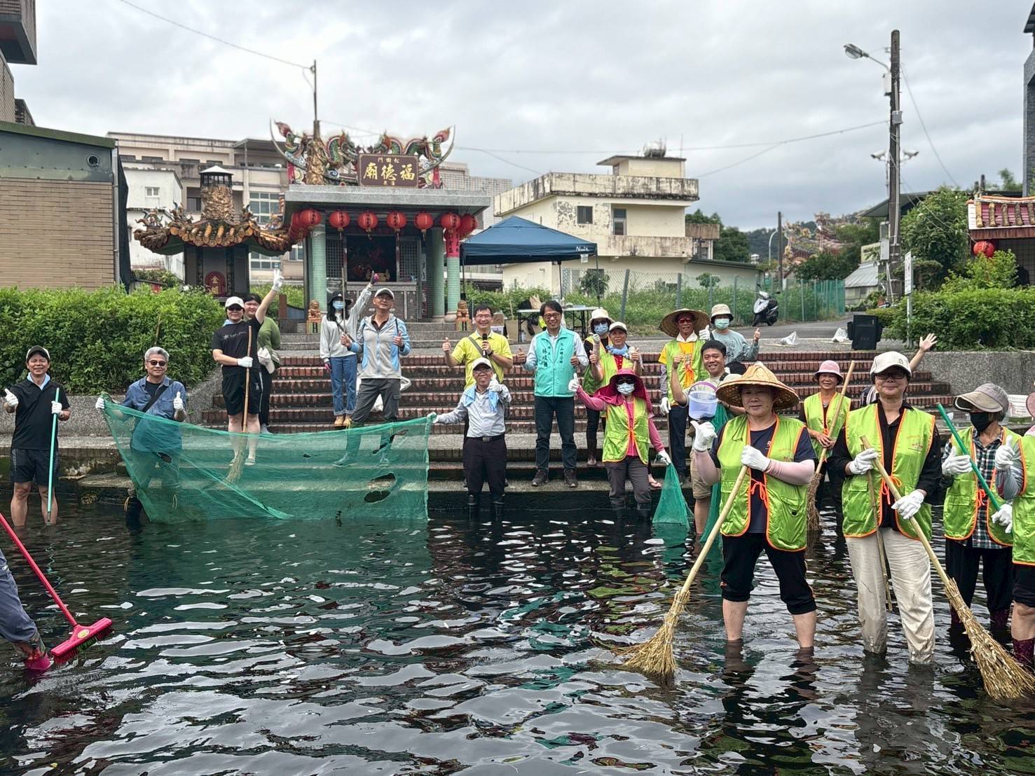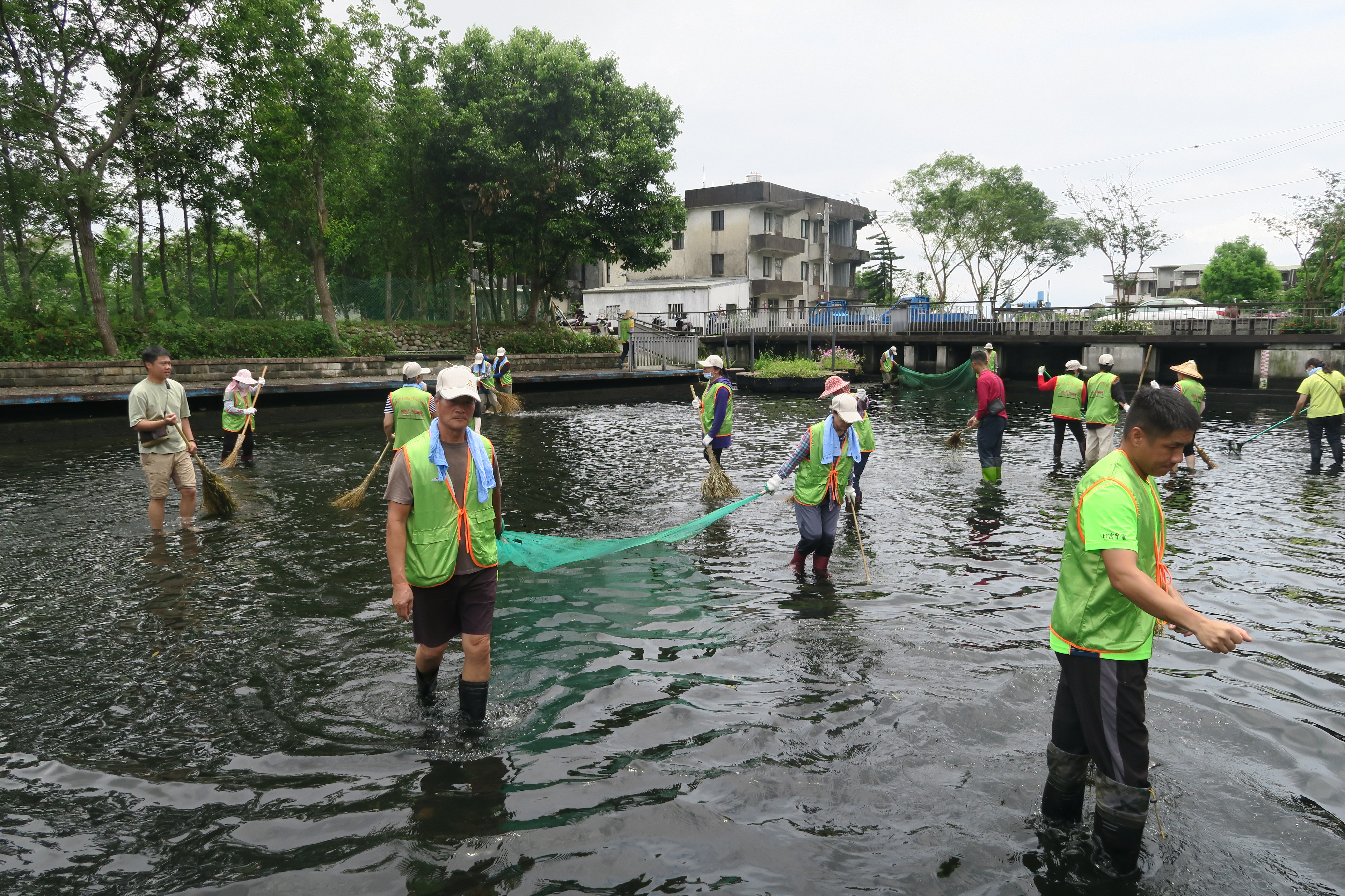 由於該區域與居民生活密切相關,松樹門湧泉除供應日常用水,也為地方辦理夏季戲水活動的重要場域,長期仰賴宜蘭縣冬山鄉公所及鹿埔村辦公室的維護與管理,如何兼顧人為利用與生物棲地需求,成為國土生態綠網節點推動的重要課題。於112年國土生態綠網-蘭陽平原湧泉埤圳平臺會議中,冬山鄉公所持正面態度支持保育合作事項推動,奠定雙方合作基礎。經本分署近年監測發現,因極端氣候影響,造成湧泉池出現優養化現象,大量藻類滋生導致水域溶氧量下降與光照不足,使石龍尾生存空間縮減。