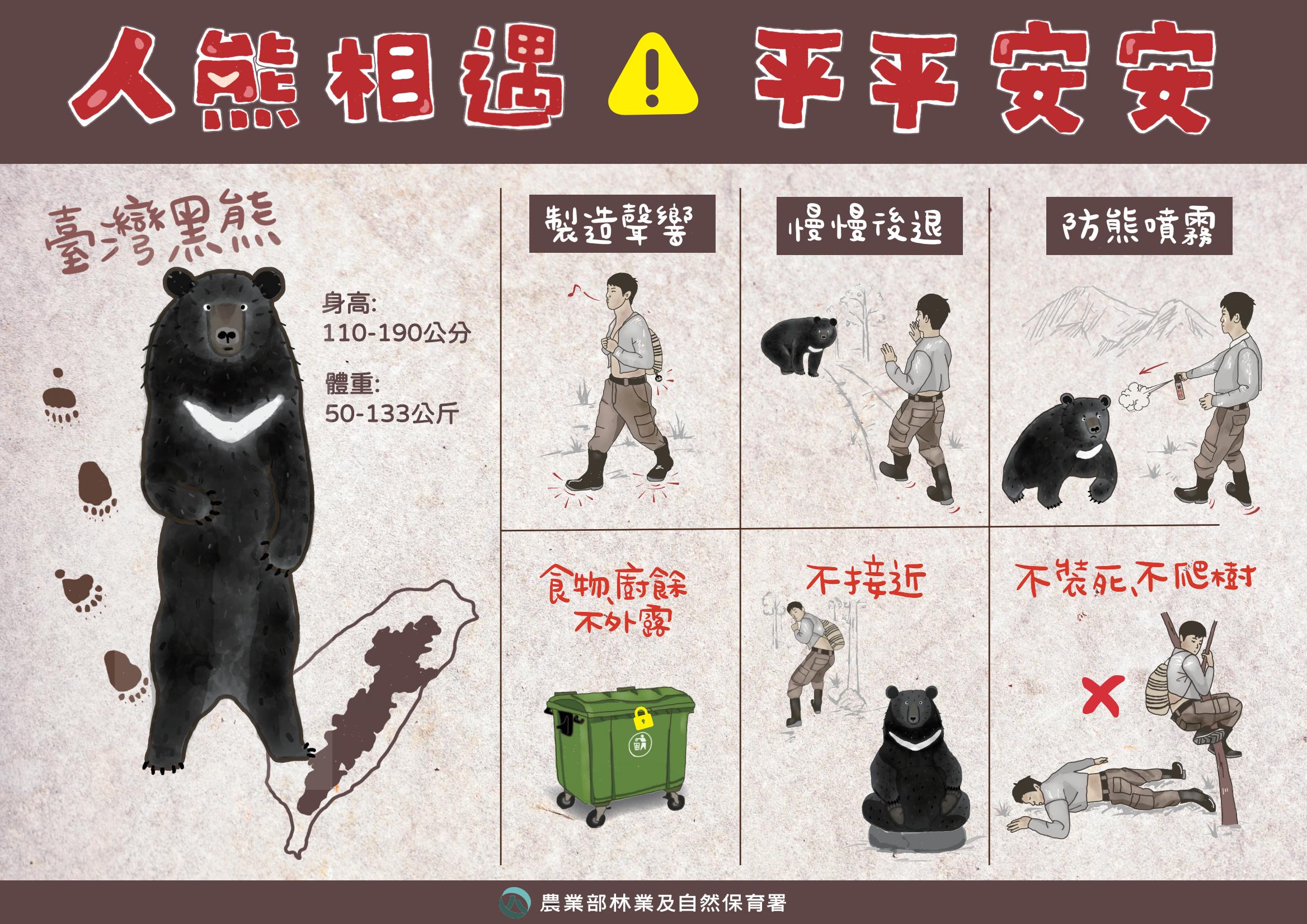 臺灣黑熊活動範圍廣泛,因應族群有逐漸擴張趨勢,並接近人類活動區域。林業保育署宜蘭分署自114年4月起委託專業團隊於宜蘭境內棲蘭山100線林道進行臺灣黑熊族群調查與監測工作,近期委託團隊回收紅外線自動相機資料,發現於100線林道29K處紀錄到臺灣黑熊蹤跡,另近期(115年4月)林業保育署宜蘭分署同仁於100線林道18.5K處紀錄到熊窩,顯示該區有臺灣黑熊活動紀錄。林業保育署宜蘭分署表示,為強化山域活動安全,呼籲山友進出該區域活動時應提高警覺,儘量結伴同行,並隨身攜帶熊鈴或可發出聲響的器具,必要時可準備防熊噴霧,可降低臺灣黑熊接近與攻擊風險。由於臺灣黑熊嗅覺靈敏,在山區活動應妥善保存食物並將廚餘帶下山,切勿隨意棄置,以免氣味吸引臺灣黑熊靠近。若在山區遇到臺灣黑熊時,應保持冷靜並維持安全距離,避免靠近或追逐拍照,以確保人身安全。為加強宣導防熊知識,林業保育署宜蘭分署已規劃在100線林道山友或遊客主要活動區域處設立「注意熊出沒」告示牌,並設有熊鈴掛置區,提供山友上山借用,下山後原處歸還即可。佩戴熊鈴可在行進間製造聲響,以降低與臺灣黑熊不期而遇的可能性。另持續向登山、研究及現場施工團隊宣導食物及廚餘管理措施,避免人為人食物吸引源引誘臺灣黑熊。林業保育署宜蘭分署提醒,山區農友與部落族人如有防治獸害或傳統狩獵需求,請洽林業保育署宜蘭分署免費換發或申領可避免誤捕黑熊的改良式獵具;誤捕臺灣黑熊,只要立即通報協助救援,即不會咎責,發現黑熊入侵或受困,請在確認自身安全後,立即撥打1999或林業保育署免付費專線0800-000-930(您您您救山林)。