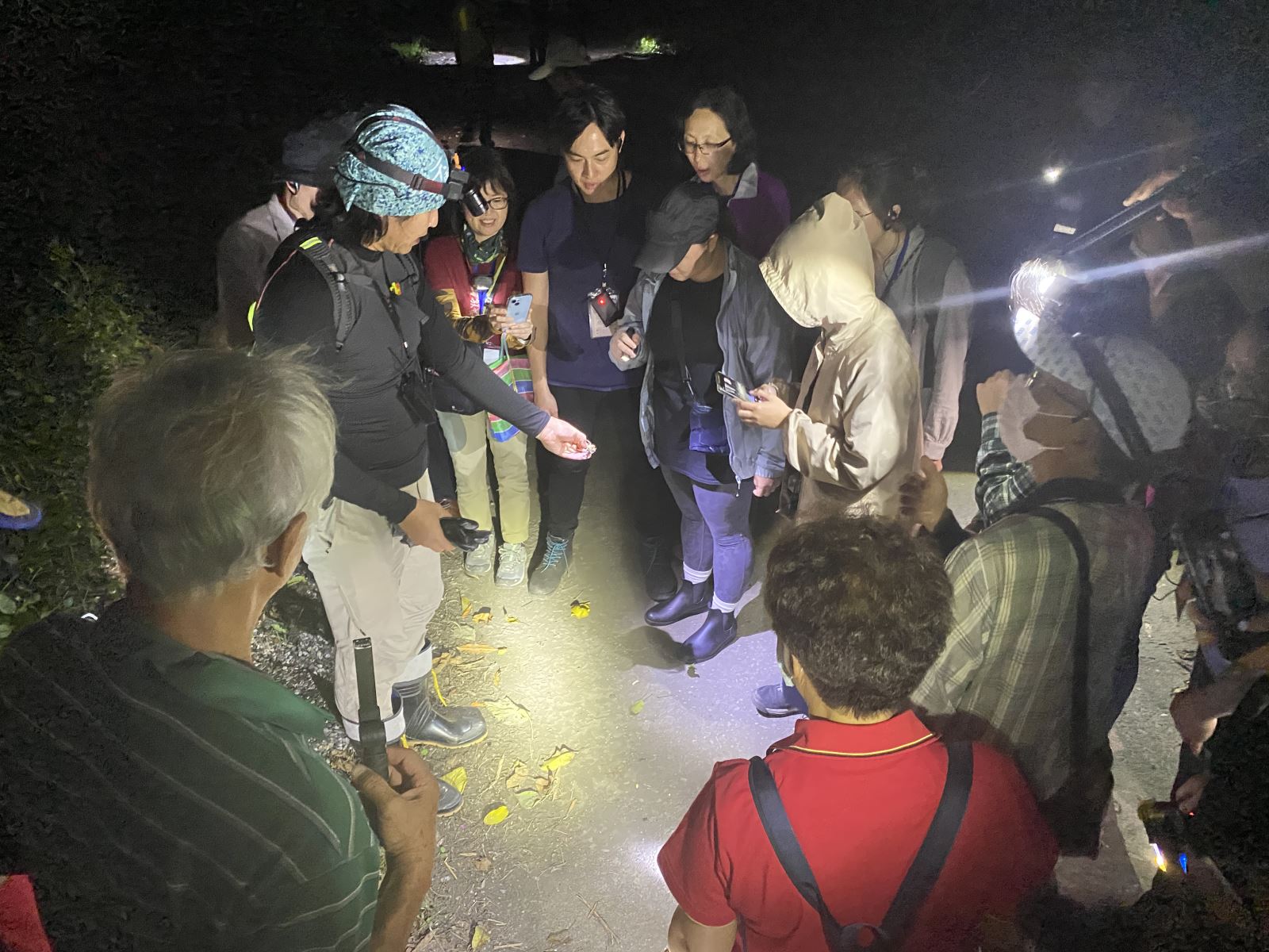 On the first day of the workshop, the participants visited Daxueshan Forestry Direct Sales Centre, where they learned about the log wood Shiitake mushroom cultivation and operations of the mountain product store. The store sells environmentally friendly produce from neighbouring communities such as citrus fruits, native cinnamon, Taiwan mountain pepper (magao), Shiitake mushrooms, and others. Damaopu community of Dongshih District, Taichung City was the next stop of the journey. Wu Zhe-Ming, the leader of the Damaopu survey team, shared how Damaopu community uses the results of local ecological surveys to improve sustainable water use and local livelihoods. Shibumizu (Seishui) Community, Yuchi Township, Nantou County was the last stop of the day. The area is not only famous for production of Taiwanese black tea but is also a great example of community-based maintenance of eco-trails, dragonfly and bird surveys, and wetland conservation. In the evening, community members prepared local delicacies and Taiwan Biodiversity Research Institute organised a night eco-tour.