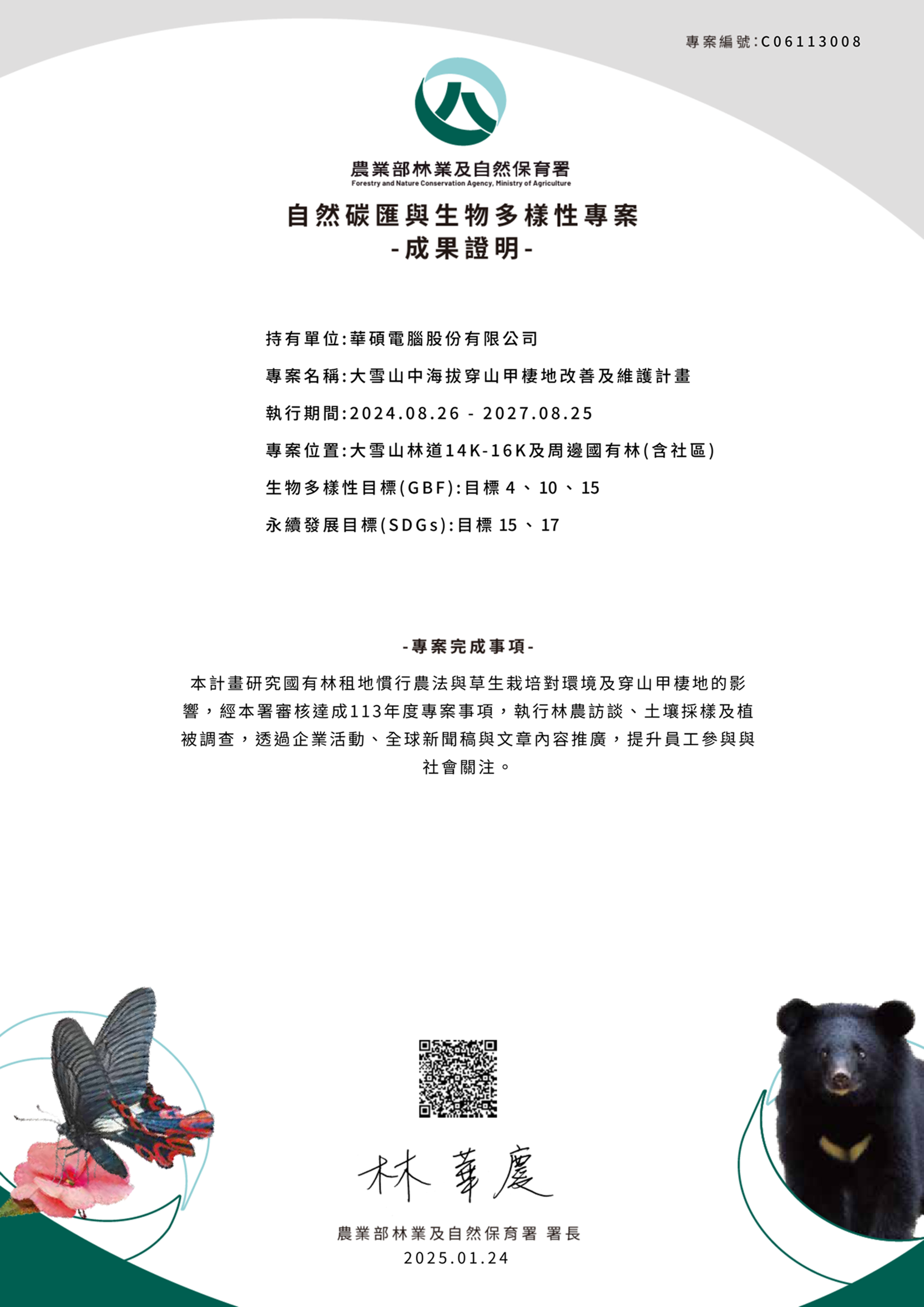 ASUSTeK COMPUTER INC. (ASUS) has entered into collaboration with the Taichung Branch of the Forestry and Nature Conservation Agency (FANCA Taichung), in which they will be working on a three-year project to improve and maintain pangolin habitats in the mid-altitude zone of Dasyuehshan. ASUS is the only company in Taiwan that is involved in pangolin conservation for ESG. The first year’s implementation goals have been achieved, and on the eve of World Pangolin Day, ASUS successfully passed the review and obtained the FANCA’s first natural carbon sink and biodiversity project results certificate. The company leveraged their corporate influence to respond to global sustainability and environmental challenges through concrete actions, thereby accomplishing the goals of biodiversity conservation and ecosystem sustainable development. In line with the United Nations Sustainable Development Goals (SDGs) for terrestrial ecosystem conservation and the Kunming-Montreal Global Biodiversity Framework (GBF) target on threatened species management actions, ASUS participated in the Carbon Sink and Biodiversity ESG Project in 2024 through corporate self-proposal, and carried out pangolin conservation work in the mid-altitude zone of Dasyuehshan. Based on the pangolin distribution survey data of the FANCA Taichung from the mid-altitude zone of Dasyuehshan, a more detailed investigation was conducted on different types of agricultural utilization, such as conventional farming and floor vegetation. The aim was to understand how different land environmental qualities impact the distribution of pangolin food resources and the use of habitats. In the first year of the project implementation, comprehensive records of pangolin appearances in different types of forests have been obtained. They will serve as a basis for further exploration of the relationship between habitat quality and pangolin distribution. The FANCA Taichung said that ASUS organized an internal biodiversity and environmental education event at the beginning of its participation in this project, inviting employees to watch a pangolin documentary together. Dr. Sun Ching-Min, a pangolin conservation expert from the National Pingtung University of Science and Technology, held a post-screening discussion so that employees could gain a better understanding toward the issue, and would be willing to participate further in various sustainable actions, which can help internalize the concept of conservation within the company. To encourage more people to turn their attention to biodiversity issues, ASUS will also work with the FANCA Taichung to visit the local communities of Dasyuehshan. They will encourage these residents, who are neighbors with pangolins, to learn basic knowledge about the animal and assist in rescue work, thus expanding the lineup of conservation partners and realizing local participation in biodiversity conservation actions. Understanding and improving the habitats that wildlife depend on will enable the benefits of biodiversity to be enhanced. The FANCA Taichung is grateful to ASUS for its dedication to pangolin habitat conservation and encourages more companies to participate in the Carbon Sink and Biodiversity ESG Project, where different projects for matchmaking will continue to be proposed. Companies interested in participating in the Carbon Sink and Biodiversity ESG Project are welcome to contact the FANCA for consultation. It is hoped that through the introduction of various non-government resources, a diversified partnership can be established to expand biodiversity and ecological sustainability benefits and achieve a win-win situation for all.