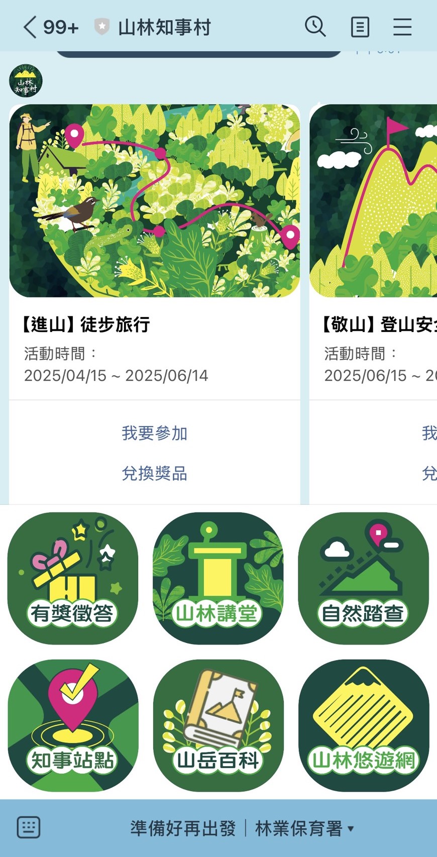 To further expand the project's influence, an official LINE account for the “Everything You Need to Know in the Mountains” project was simultaneously launched. This account provides google maps features and introductions of 21 physical sites. In addition, on the 15th of every even-numbered month, the LINE account features a quiz with prizes on the three major themes of “entering the mountains,” “respecting the mountains,” and “cleaning the mountains” (if all the answers are correct, users can go to any of the stations to redeem a mountain gift). The LINE account also provides the registration information for 16 sessions of “Forest Lectures” and “outdoor activities” led by professionals and outdoor education teams. Furthermore, it integrates the digital version of the "Mountain Encyclopedia" and the FANCA’s “Taiwan Forest Recreation” official website to allow the public to have easy access to the latest hiking and nature information.
