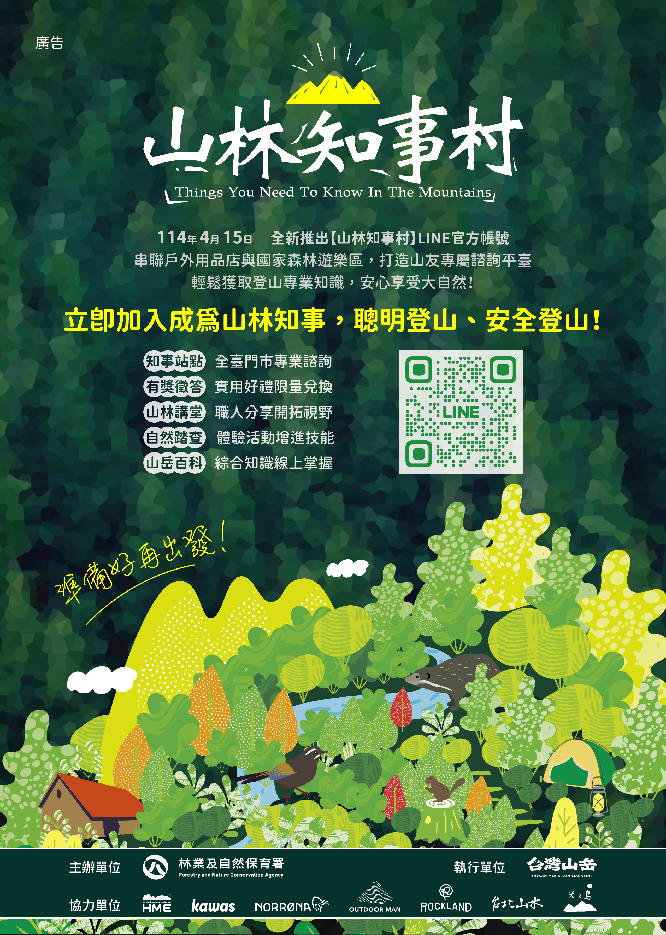 From now until October 31, through the “Everything You Need to Know in the Mountains” project, a total of 21 physical stations will be set up across Taiwan. People can go to the stations to consult on equipment and itinerary suggestions before starting their hike, and get free hiking safety leaflets created by the famous illustrator Shen En-Min, including “On Preparation” and “Entering the Mountain.” There will also be essential guides for popular hiking routes such as “Jiali Mountain,” “Ba-Tang Traverse Hike,” and “Shuiyang Forest.” The contents cover the planning and preparation before entering the mountain and the precautions to note along the way. Checklists are also provided for users to check off each item and be fully prepared before setting off.