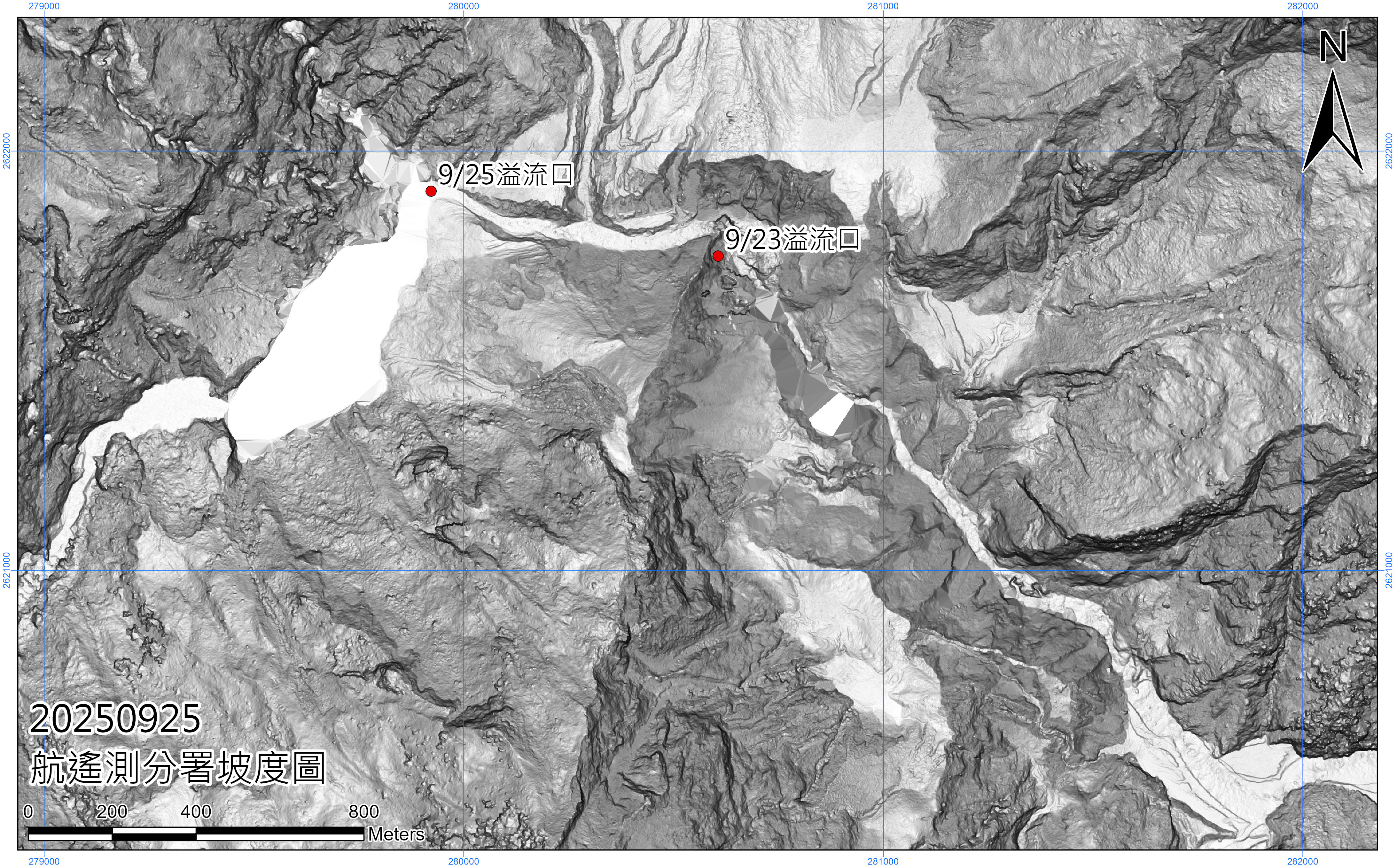 The Aerial Survey and Remote Sensing Branch (ASRS) of the Forestry and Nature Conservation Agency (FANCA), Ministry of Agriculture, has successfully obtained comprehensive imagery of the Matai’an Creek landslide dam disaster, covering the upstream landslide dam to the downstream disaster areas, including the creek channel. The ASRS stated that since the Matai’an Creek landslide dam was first detected by satellite in July this year, it has intensively dispatched aerial survey and remote sensing aircraft for imaging to the area. Prior to the installation of monitoring instruments by the FANCA, aerial survey photogrammetric technology was employed to measure the size of the dam and water level changes. A total of 17 missions were carried out, making a significant contribution to the early monitoring of the landslide dam. Before Typhoon Ragasa hit, the ASRS had completed preparations and made multiple attempts to capture images on the day after the disaster struck. Unfortunately, thick cloud cover and intense convective cloud systems hindered operations. After the weather cleared up yesterday morning (9/25), personnel immediately flew over the area before afternoon clouds developed in the mountainous area, successfully capturing comprehensive imagery covering more than 30,000 hectares in both upstream and downstream areas (Figure 1). The ASRS further pointed out that in addition to the LEICA DMCIII digital camera, the RIEGL VQ-1560II-S LiDAR scanner, which was installed last year, was also used in this survey mission. Not only can it provide images with a ground resolution of up to 15 cm, it can also simultaneously obtain LiDAR data with a point cloud density of approximately two points per square meter. This enabled more precise monitoring of terrain changes before and after the disaster, which has attracted public attention, including the elevation of the landslide dam and its embankment, as well as variations in soil and sediment within the disaster area, the creek channel and the riverbed. ASRS Branch Director Huang Chyun-Shiou explained that due to the massive volume of data, three dedicated workstation-level computers at the ASRS finally completed the processing of 145 images at 16:00 yesterday (9/25). Image comparisons clearly revealed differences in the dam’s size compared to pre-disaster conditions on August 18 (Figure 2). At the same time, the data was immediately shared with relevant agencies for use through the groups and platforms of the National Science and Technology Center for Disaster Reduction. As for the LiDAR point cloud data, the area surrounding the landslide dam was prioritized for analysis. With the assistance of a team from National Yang-Ming Chiao Tung University and the collaborative efforts of personnel from the ASRS, post-disaster topographic data (Figure 3) was produced overnight. The map clearly depicts the current terrain and overflow locations. Branch Director Huang also stated that the ASRS will continue to closely monitor the disaster area. He particularly emphasized that the aerial survey aircraft and related sensing instruments deployed this time were only established in 2019 with the support of the Executive Yuan. This capability proved vital during the disaster, validating the importance of establishing autonomous aerial surveying and disaster data collection capabilities for disaster-prone Taiwan, a point emphasized when securing the initial budget.