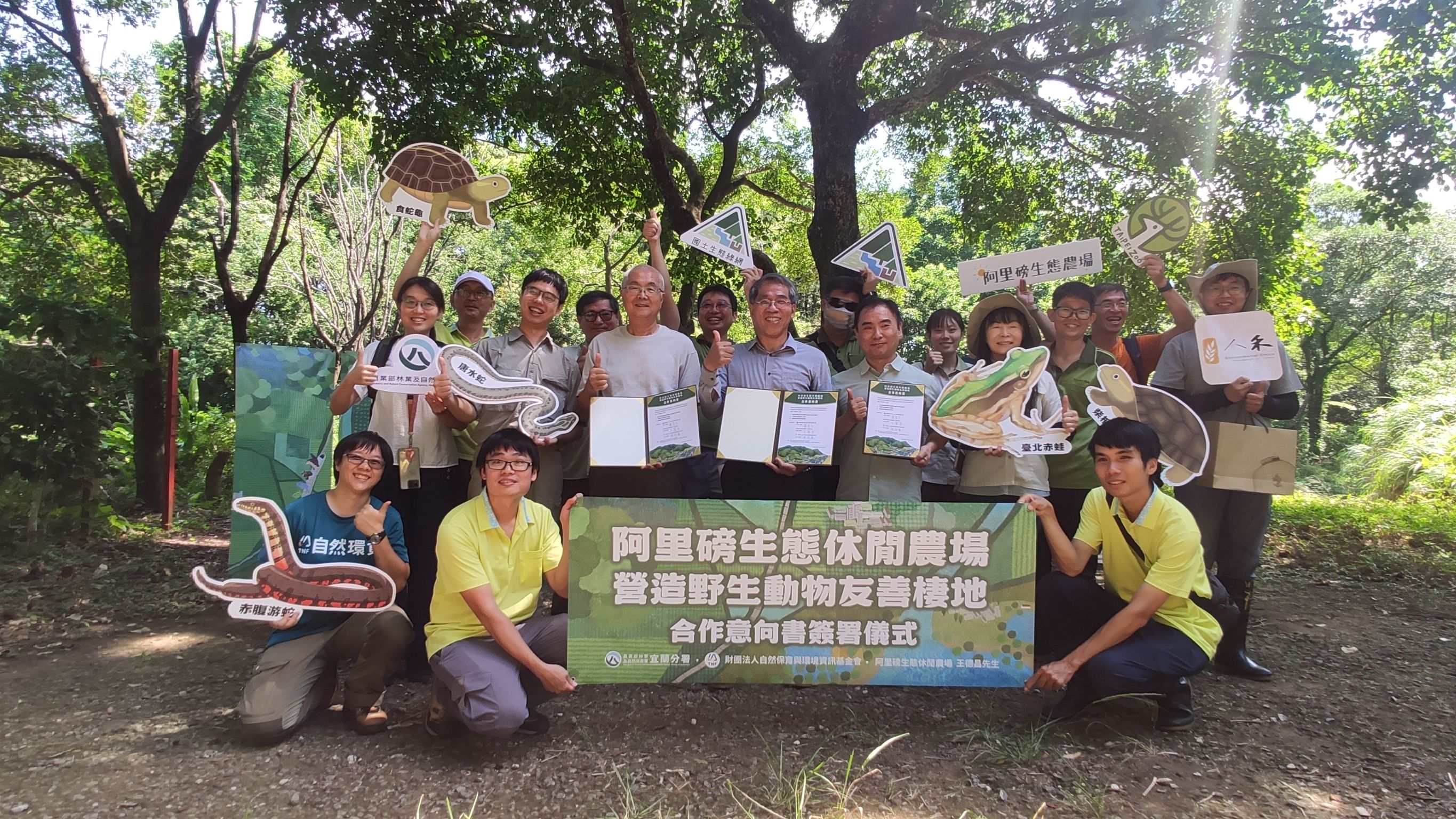 To deepen conservation efforts for a precious and rare native amphibian, the Taipei grass frog (Hylarana taipehensis, also known as the “thunder frog”), the Yilan Branch of the Forestry and Nature Conservation Agency (FANCA Yilan) signed a Memorandum of Understanding (MOU) for the “Creation of Wildlife-Friendly Habitats at the Alibang Ecological Leisure Farm” with Mr. Wang De-Chang, representative of the farm’s landowners, and the Trust in Nature Foundation (TNF) on September 30, 2025. This collaboration aims to jointly safeguard native species habitats and establish a model for cross-agency cooperation. The Taipei grass frog was once a common frog species in Taiwan’s plains. However, in recent years, its distribution range has been significantly reduced due to pesticide overuse, habitat fragmentation, and human interference. The species is now confined to areas such as Shimen and Sanzhi in New Taipei City, and Yangmei in Taoyuan. The Alibang Ecological Leisure Farm, with its low-impact development strategy, once hosted the highest population density of Taipei grass frogs in New Taipei City, demonstrating its habitat-friendliness and conservation value. Located at the foot of Yangmingshan, the Alibang Ecological Leisure Farm is situated at the hub of the North Coast low-elevation mountain conservation corridor of the Taiwan Ecological Network. Spanning approximately 10.3 hectares, the farm boasts a diverse ecosystem of wetland, streams, and forest. It originated from Mr. Wang De-Chang’s “Nature Deposit” initiative, which rallied 60 families to collectively fund the land purchase for environmental protection. Starting in 2022, the project has been managed by the TNF, which continues to promote habitat conservation and environmental education. Through long-term monitoring and investigation by the Environmental Ethics Foundation of Taiwan (EEFT) and the Alibang Working Group of the TNF, it was discovered that the farm is the last bastion of the native Taipei grass frog along the North Coast, making it a critical site for its restoration. Surveys also identified the presence of protected species including the yellow-margined box turtle (Cuora flavomarginata), yellow pond turtle (Mauremys mutica), and red-bellied annulate keelback (Trimerodytes annularis), indicating rich biodiversity. Conservation should not rely solely on the government, grassroots participation from the bottom up is particularly crucial. The relatively enclosed environment and appropriate management of the Alibang Ecological Leisure Farm provide a safe and stable habitat for native species. In recent years, the farm has actively engaged in habitat creation, removal of exotic species, and promotion of nature education, yielding fruitful results. FANCA Yilan also utilized a variety of policy tools. Apart from existing research programs, it also included the farm in the “Red-bellied Annulate Keelback Payments for Ecosystem Services Demonstration Program” and designated it as a key promotion area for the other effective area-based conservation measures (OECM). Through the signing of the MOU, the Taipei grass frog will be designated as an umbrella species to safeguard the diverse native species inhabiting this land. Both parties will initiate further collaborations in site management and educational outreach based on the contents of the MOU. Furthermore, the Alibang Ecological Leisure Farm will be used as a demonstration model, jointly leaving a solid legacy of protection and hope for Taiwan’s natural environment.