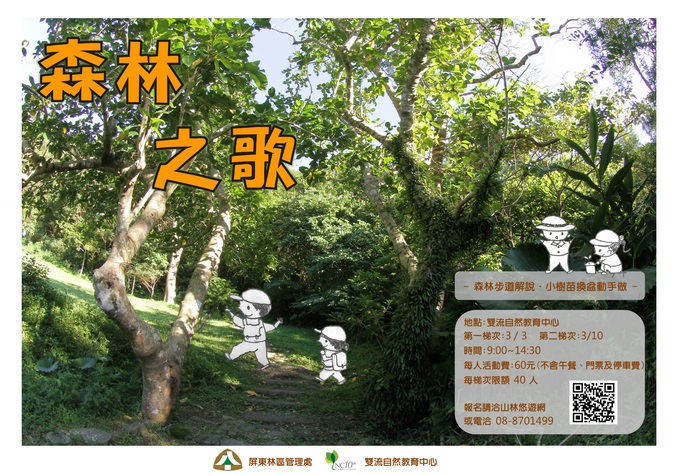 三月的雙流,嫩綠的新葉迎著陽光,透露出春天的訊息,雙流在今年 3月3日與3月10日,將舉辦兩梯次的森林之歌主題活動,讓我們離開城市惱人的 PM2.5,一起走入雙流的森林世界,深刻感受自然環境與動植物生態的奧妙及動手換盆栽,體會陪伴小樹苗長大的感動。歡迎想體驗難得機會的大家踴躍報名參加。 當空氣品質日益惡化,我們只顧著抱怨霾害嚴重,卻忘了身邊的綠色植物正努力地淨化著空氣,也忘了森林是地球之肺,數年來默默進行空氣的優化與固碳的功能。森林與植物與人類密切相關,這次雙流將帶領大家與森林成為好朋友,特別舉辦「森林之歌」植樹月活動,上午透過國家森林志工帶領民眾走入雙流的森林,認識會走路的樹-白榕與山棕的傳說;親身進入森林裡揭開神秘森林的生態密碼,發現一個又一個森林裡躲藏的小亮點,成為森林中的名偵探!午後要培訓每個參加者成為植樹王,透過輕鬆有趣的小遊戲、教學技巧及親自動手換樹盆,讓人人都成為拈花惹草的綠手指! 雙流自然教育中心「森林之歌」活動,每人報名費用60元,因活動需事先報名,想成為名偵探及植樹王的各位請上台灣山林悠遊網或電話洽詢活動資訊08-8701499。 南臺灣空氣品質最好的地方—雙流國家森林遊樂區的蓊鬱森林歡迎您的到來,另外,中心全年度準備了許多活動讓民眾體驗參與,不管是個人、親子活動、政府機構還是學校團體在這裡可以滿足您的需求!