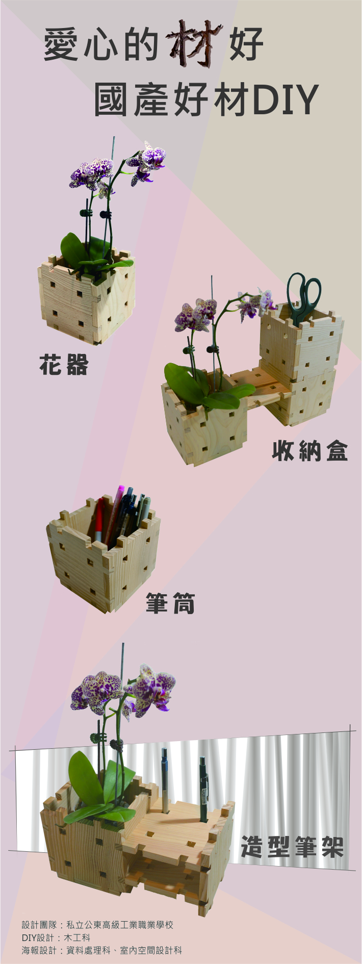今年擺設的DIY攤位有「席德(seed)的故事」及「國產的材好」,其中也邀請培育國際木工金牌獎的搖籃-公東高工的設計團隊解說教學,了解林木從生長到利用的全過程,並利用來自國產台灣杉及紅檜疏伐木所製成的材料組裝成實用的文具。