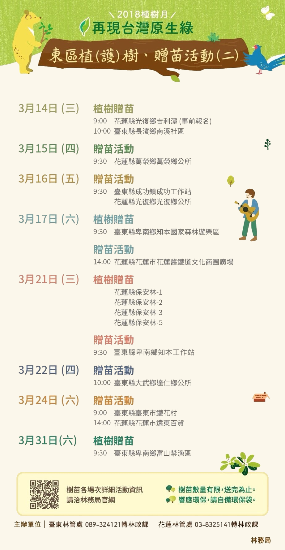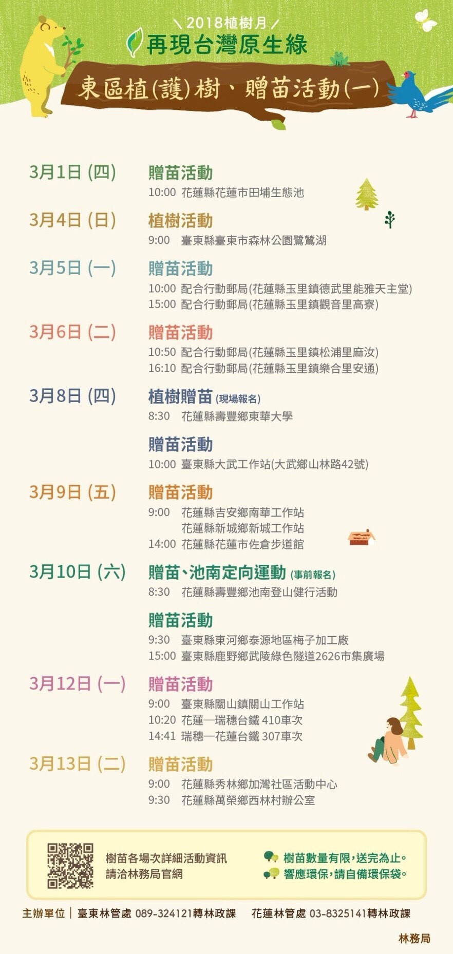 未來整個3月份該處也會分別在關山、成功、知本及大武地區舉辦贈苗及植樹活動,相關訊息可至臺東林區管理處官方網站(http://taitung.forest.gov.tw/)查詢。