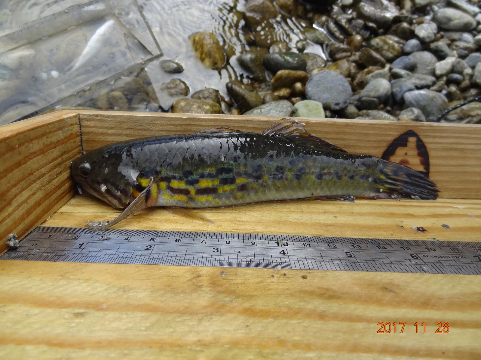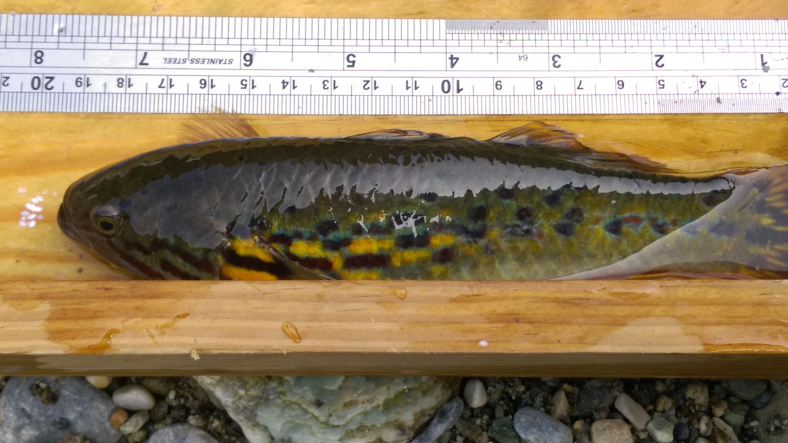 繼105年台東因風災、水患不斷,有台東民眾發現,有著艷麗鱗片的稀有魚類「無孔塘鱧」,重新出現在市區溪澗中,花蓮林管處於106年11月,於三棧溪進行溪流魚類調查時,也意外發現從未紀錄魚種「無孔塘鱧」的蹤跡,無孔塘鱧,又稱無孔蛇塘鱧,是蛇塘鱧屬的一種;體中軸線具有一列黑色的斑點,背側有不規則的黑褐色斑點。頰部於眼後下方有放射狀的黑褐色線紋。幼魚體側有淡青色的光澤,成魚則有暗紫紅色的斑塊,且鰭膜具有黃色的線紋及斑點。 無孔塘鱧在溪流中下游的淡水域裡,河口區的半淡鹹水中甚至剛退潮的海邊水坑都可以發現它的蹤跡。泳力佳,警覺性很高。本次調查發現該魚體長已達19公分,依據文獻屬於該魚種的重量級大哥了,成魚體色是黃綠為主,身上佈有紅色、藍色和黃色斑點,看起來色彩相當豔麗繽紛,彷彿有如在溪裡的琉璃,見一眼就讓人深深著迷。 三棧溪是以三棧南溪為主流,而後在三棧村附近和北溪會合後才東流注入太平洋。本區域動、植物生態多樣豐富;結合位於三棧階地的布拉旦社區人文特色,很適合從事觀察地形、地質、動植物生態、攝影、寫生等自然觀察與生態旅遊活動,喜歡親近大自然的朋友們,不妨來趟生態之旅,幸運的話還可以遇見這稀有的水中琉璃-無孔塘鱧。