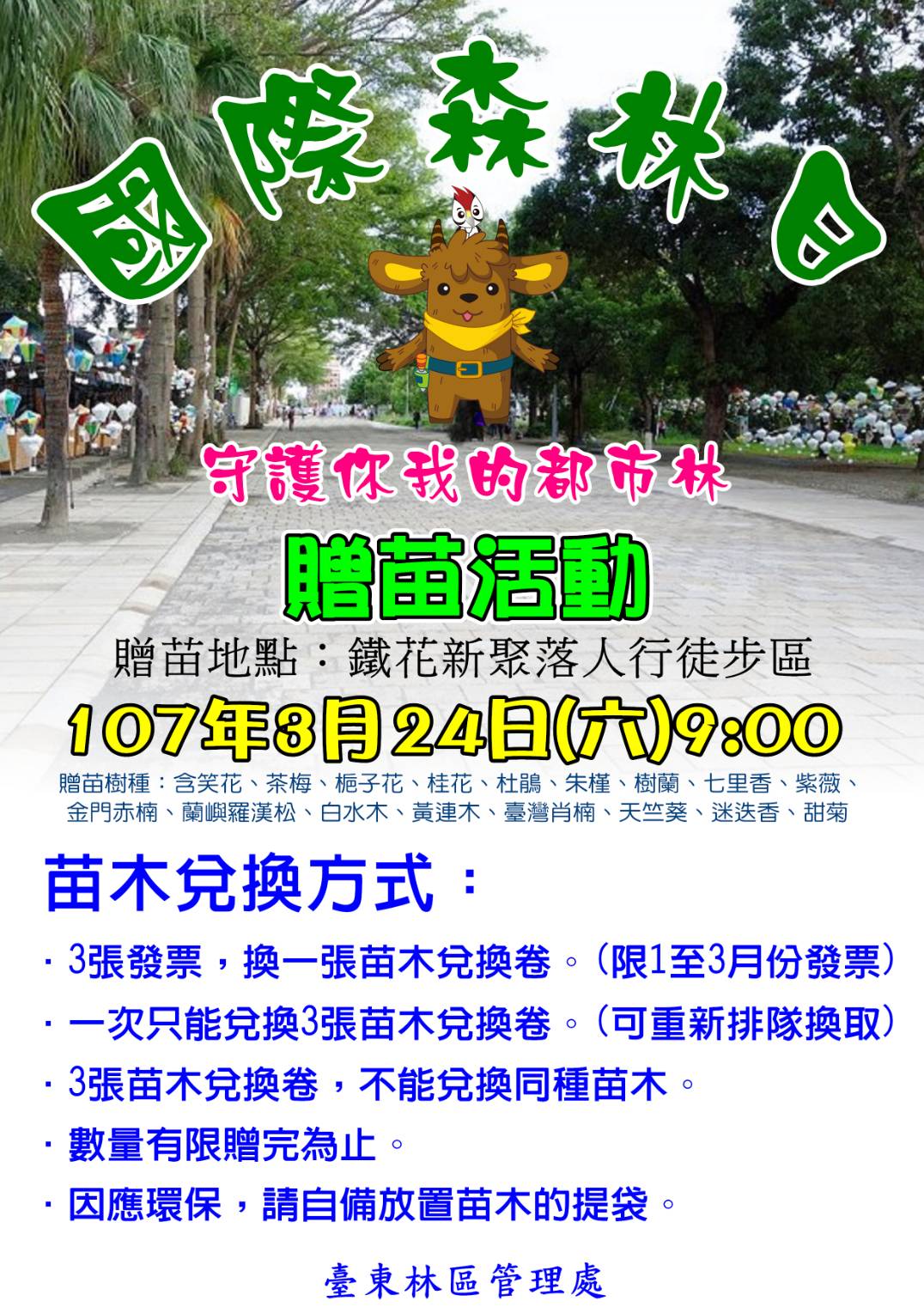 林務局臺東林管處於本週六3月24日上午9-12時,於鐵花村行人徒步區辦理『鐵花國際森林日–守護你我的都市林』贈苗活動。現場提供多達17種苗木及草花贈送外,還有植樹護樹宣導、廉政宣導及有獎徵答、犬貓疫苗施打優惠、國產材手作DIY等多元活動。