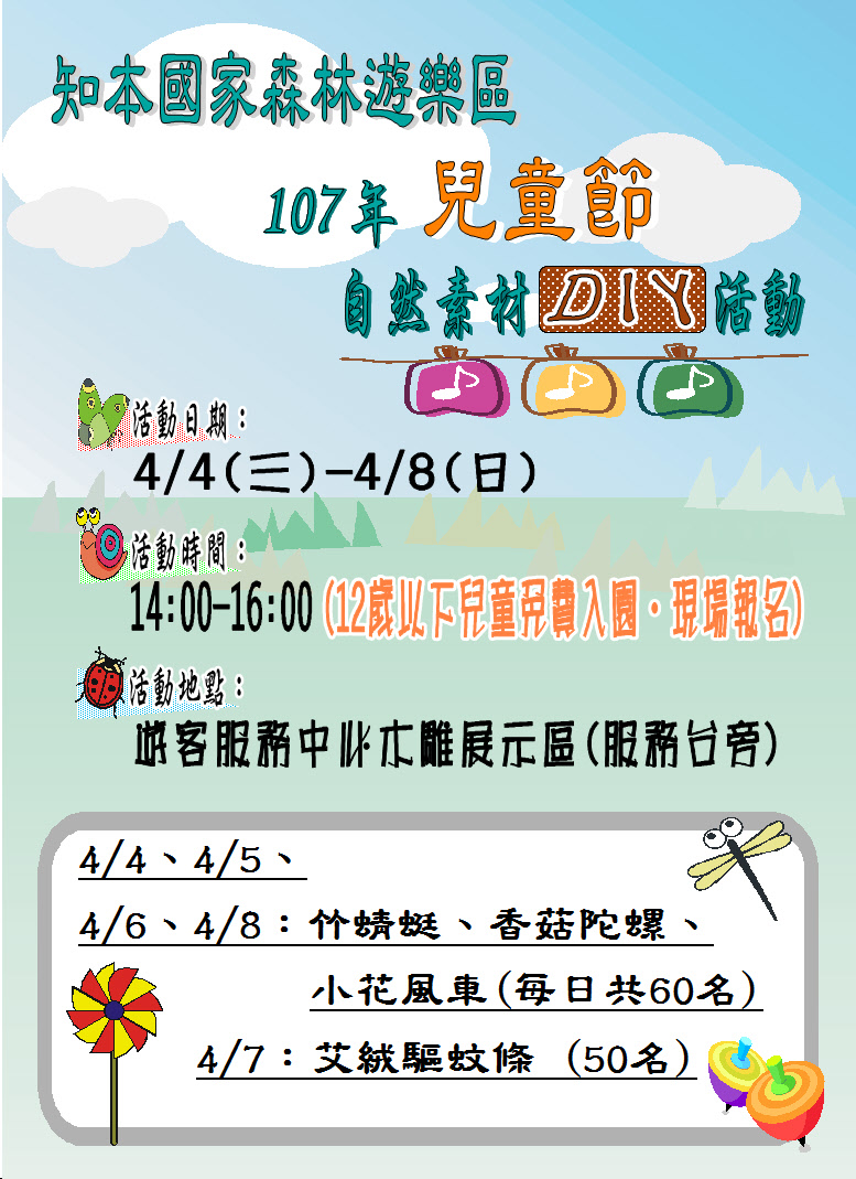 知本國家森林遊樂區今年兒童節連假下午2點到4點,將於遊客服務中心舉行自然素材DIY活動,針對不同年齡層兒童規劃竹蜻蜓、香菇陀螺、小花風車、艾絨驅蚊條等手作DIY活動。臺東林區管理處表示,現今孩童日常生活充斥著各種3C產品,過度沉迷使用3C產品,對孩童身心發展恐造成負面影響,甚至造成親子關係疏離,在兒童節連假舉行自然素材DIY活動,除了希望讓孩子們透過自己雙手努力完成作品,從中獲得滿滿成就感外,更鼓勵家長帶著孩子們走入戶外,遠離電子產品,體驗充滿童趣及純真樸實的兒童節。