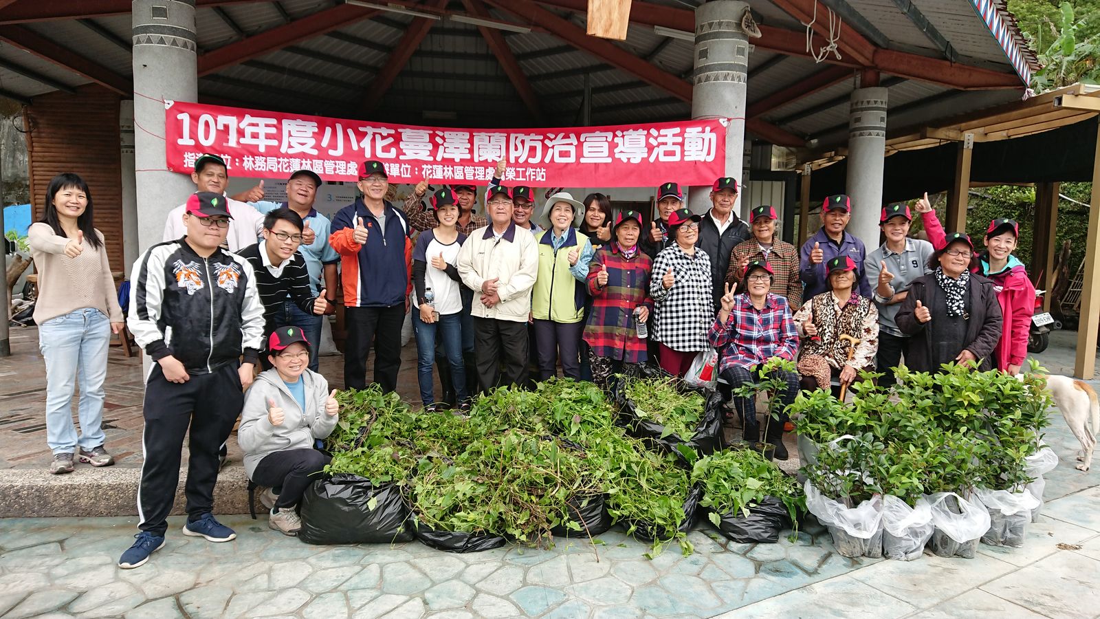 花蓮林區管理處今(17)日於豐濱鄉復興部落辦理「107年度小花蔓澤蘭防治」活動,現場還邀請到國立花蓮高農共襄盛舉並介紹小花蔓澤蘭的萃取醋液,可防治小黑蚊,部落阿公阿嬤都覺得好神奇。 花蓮林管處黃碧雲秘書帶領同仁與部落民眾合計五十餘人參加,阿公阿嬤為守護森林生態,對抗「綠癌-小花蔓澤蘭」不落人後,大家互相鼓勵,雖然天氣濕冷,仍奮力移除了部落周邊的小花蔓澤蘭,多達百餘斤,看到阿公阿嬤這麼賣力都覺得很感動,其中一位參與的阿公感慨的說:「這種小花蔓澤蘭真的長很快,三天不管就會覆蓋他的菜園,危害很大,需要大家齊心協力才能把它趕出去」。 由花蓮林管處及花蓮農改場、水土保持局、農糧署東分署組成的「花蓮縣豐濱鄉新社村『森-川-里-海』生態農業倡議跨域平台」與新社、復興兩部落討論出五大面項、38項工作分工項目,其中移除外來入侵種就包含在內。據復興部落總幹事張慧芬說部落產業道路兩側常見小花蔓澤蘭攀爬樹木,部落阿公阿媽很勤勞的一直拔一直拔,但小花蔓澤蘭就越長越多,造成部落的山林環境被小花蔓澤蘭佔據,部落也不知道該怎麼辦。所以,花蓮林管處特別規劃4月17日於復興、5月25日於新社舉辦與部落居民舉辦移除小花蔓澤蘭的活動,以宣導正確地拔除方法、移除的季節及拔除後小花蔓澤蘭如何再利用。 花蓮林管處黃秘書碧雲向部落居民說明小花蔓澤蘭被世界自然保育聯盟(ICUN)列為「世界百大入侵種」,在台灣主要對海拔1000公尺以下、陽光充足的農林地造成危害,入侵後會攀爬覆蓋導致農作物或樹木「窒息」死亡,且因繁殖散播能力強在國外有「一分鐘一英里雜草」之稱,目前防治方式仍以人工拔除為主。期盼部落了解外來入侵種的危害性後,平時加強防堵外來入侵種的散播,也呼籲大家共同防治,及早發現及早拔除,共同保護森林、維護生態棲地。