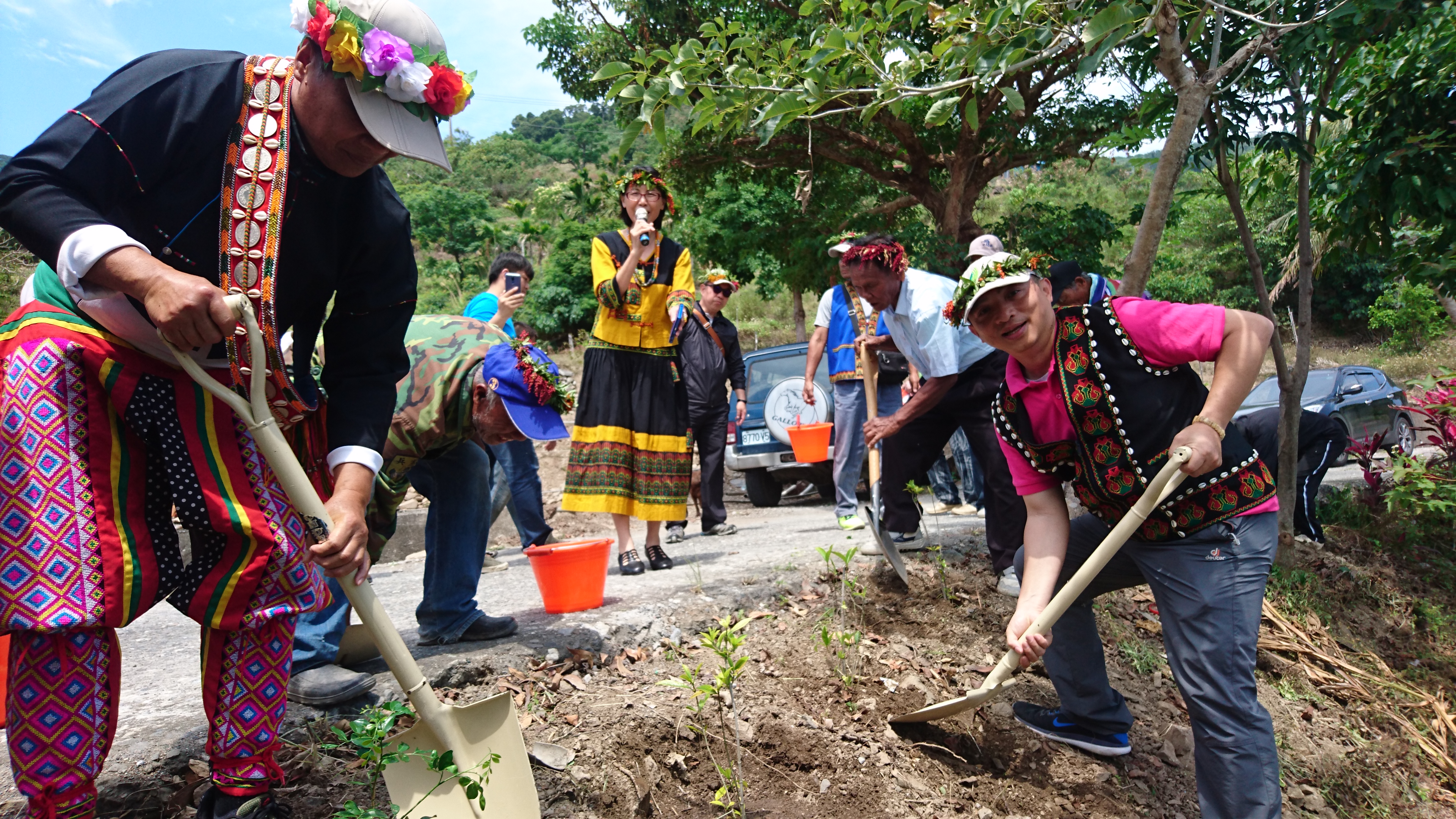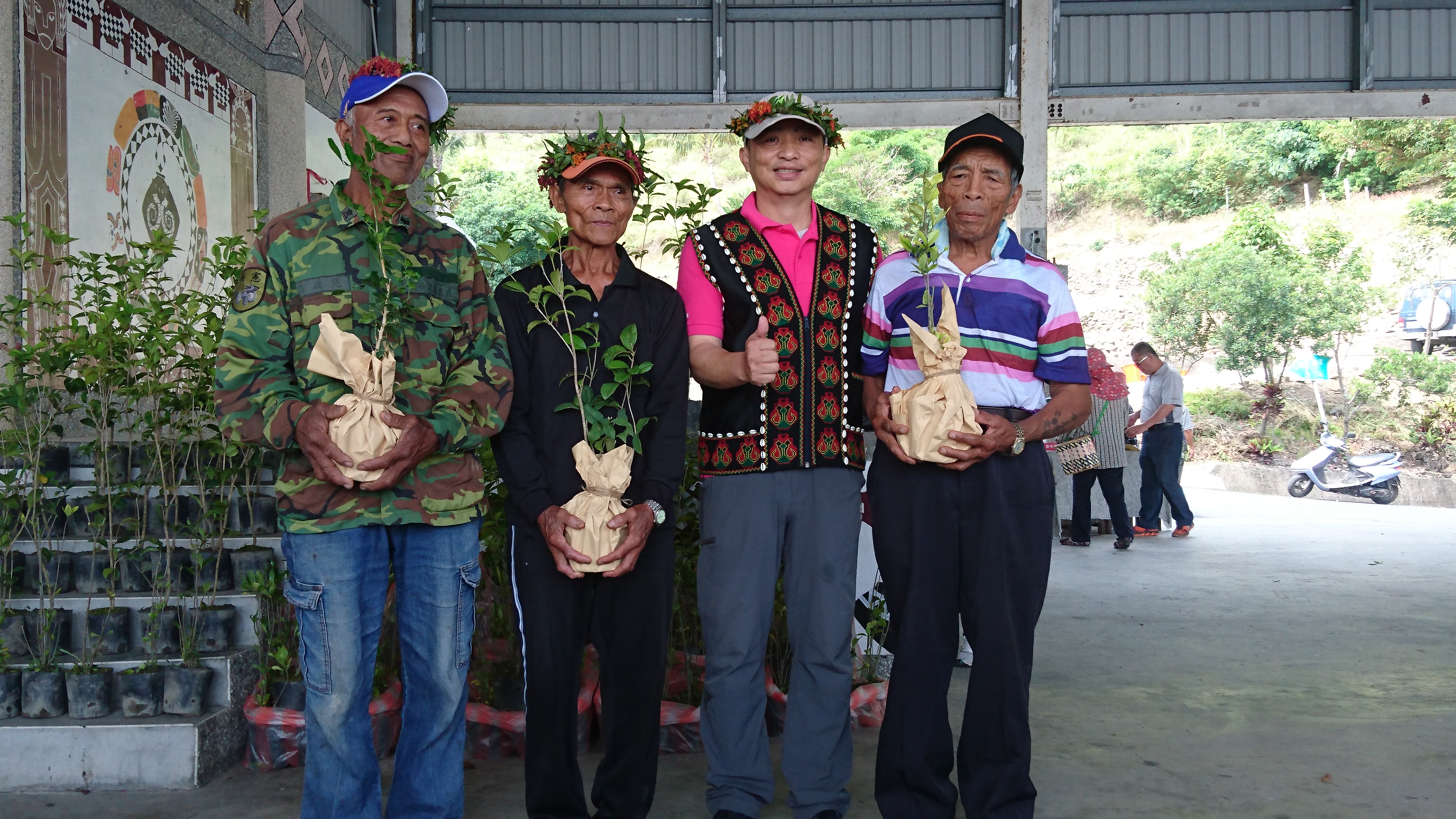 排灣族古諺說:「香,是魔鬼的臭」,臺東林管處大武工作與太麻里瀧部落於4月21日上午,以具有民族風的「排灣FU植樹活動」,在4月22日世界地球日前夕,攜手為部落建構具有排灣FU的香氛保護傘,參加人員更在引導之下,春遊查拉密,深入瞭解排灣族人如何運用充滿山林智慧的生活態度,悠遊於山海之間。 4月21日上午10點,在查拉密部落的巴拉冠,臺東林管處副處長黃群策戴著香草花環,以排灣族古諺「香,是魔鬼的臭」為基調,將百餘株梔子花、七里香送給部落居民,然後一起在巴拉冠旁邊栽種,為查拉密部落重建具有排灣古調的香氛網,希望能阻絕壞東西進入部落。卑南鄉利嘉巡守隊也遠道來參加植樹活動,村長林肯毅上台介紹卑南FU的植物,還以精彩的歌舞與在地村民交流,賓主盡歡。 臺東林管處副處長黃群策表示,鄰近查拉密部落的向陽薪傳木工坊,自2009年成立以來,在各方的協助及前公東高中校長黃清泰的指導之下,除了讓部落族人習得木工技藝,得以發展天賦、製作精緻木藝產品以外,木工坊經理陳秀如更深入部落,並與臺東林管處大武工作站共同規劃出具有在地特色的植樹活動。活動中並穿插在地人文生態旅遊導覽,以生動的故事講述部落傳說,及排灣族人的山林智慧,大家都聽的津津有味。 在散步查拉密時,大家發現路旁竟有幾株銀膠菊,大武站人員立刻動手移除,將植物體放在垃圾袋中悶壞,並向村民說明這種幼時像艾草、開花極似滿天星的銀膠菊,可能導致過敏,每個人嚴重程度不一,請村民如有發現,應著長袖衣物、戴手套和口罩移除,以避免大面積擴展。
