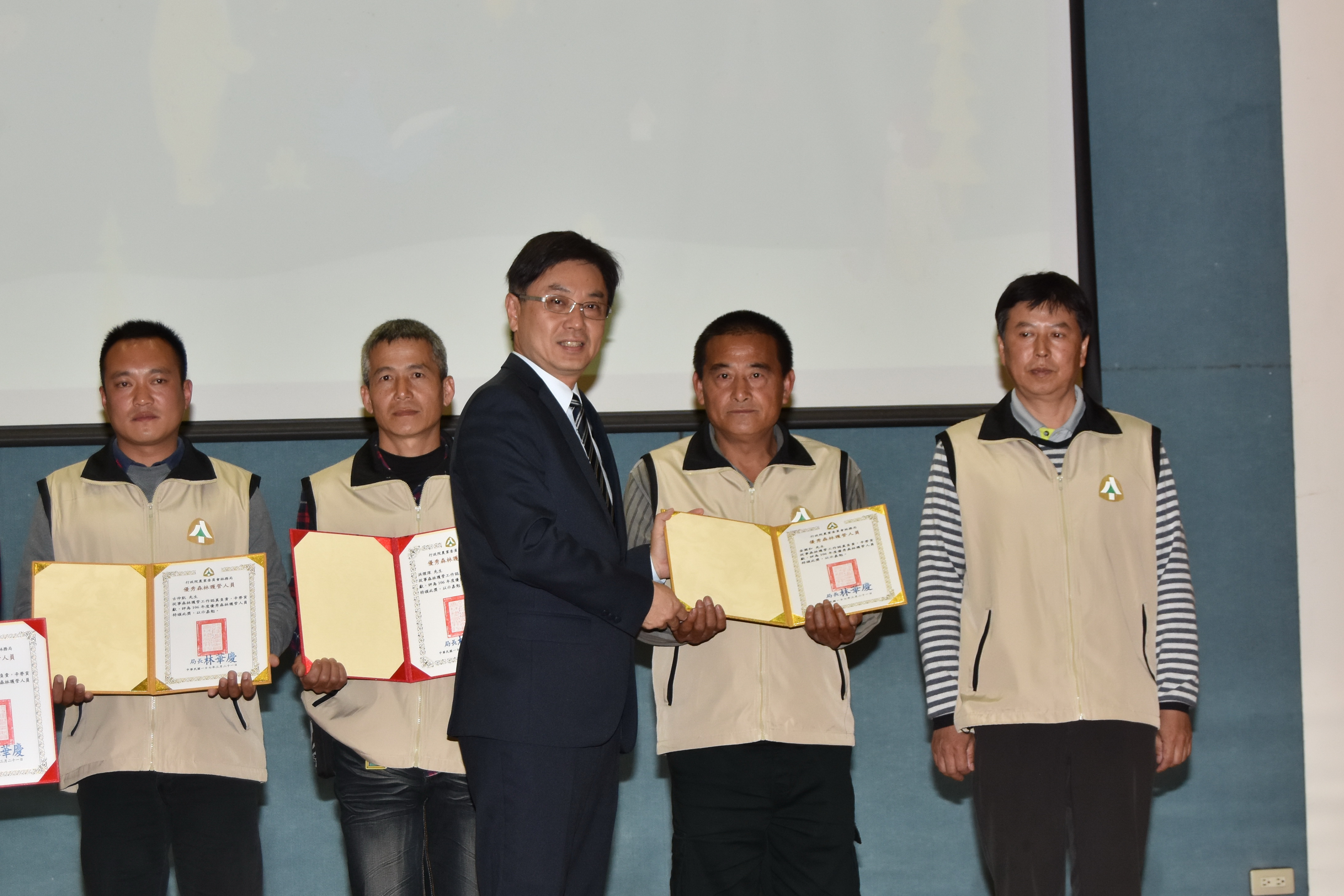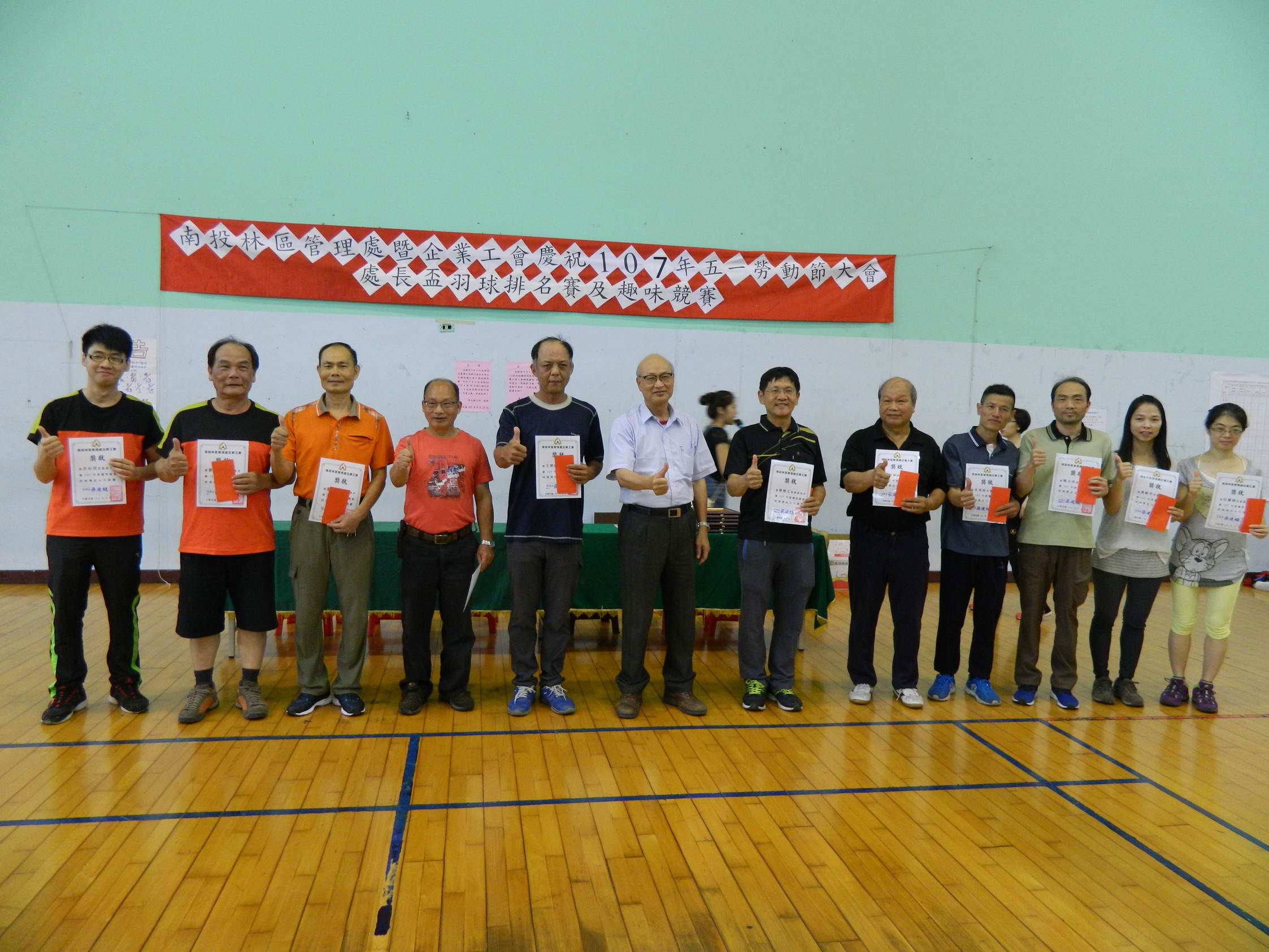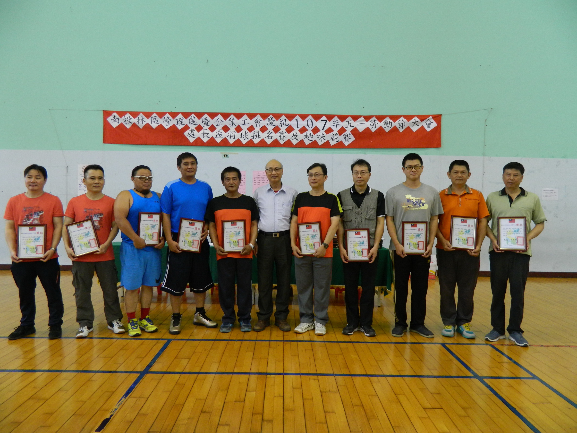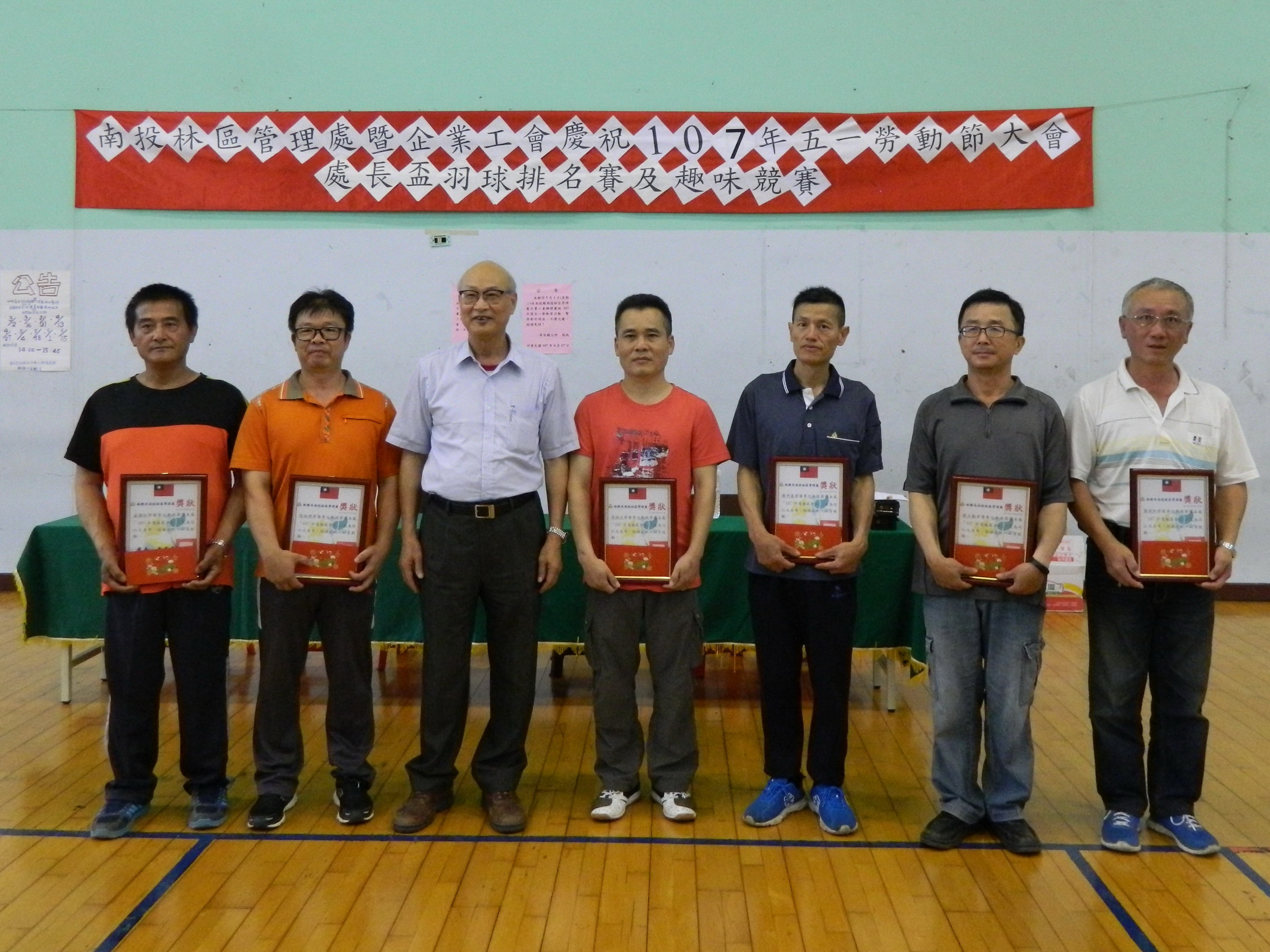 林務局南投林區管理處暨企業工會於本(107)年5月1日上午9時舉行107年度五一勞動節慶祝大會,並依規定辦理「勞工安全衛生講習」以宣導正確工安防護及災害預防的觀念,會中表揚模範勞工、優秀森林護管人員及優秀企業工會會員計27名,每名各獲頒獎狀及禮券。 林管處處長李炎壽特別於會中感謝受表揚同仁平日的辛勤及付出,勉勵繼續努力,一同守護這片美麗的山林。李處長亦表示,受表揚人員只是一個代表,全處各項業務在團隊和諧合作下共同完成工作目標,並締造佳績,所有員工之努力都值得嘉許及肯定。