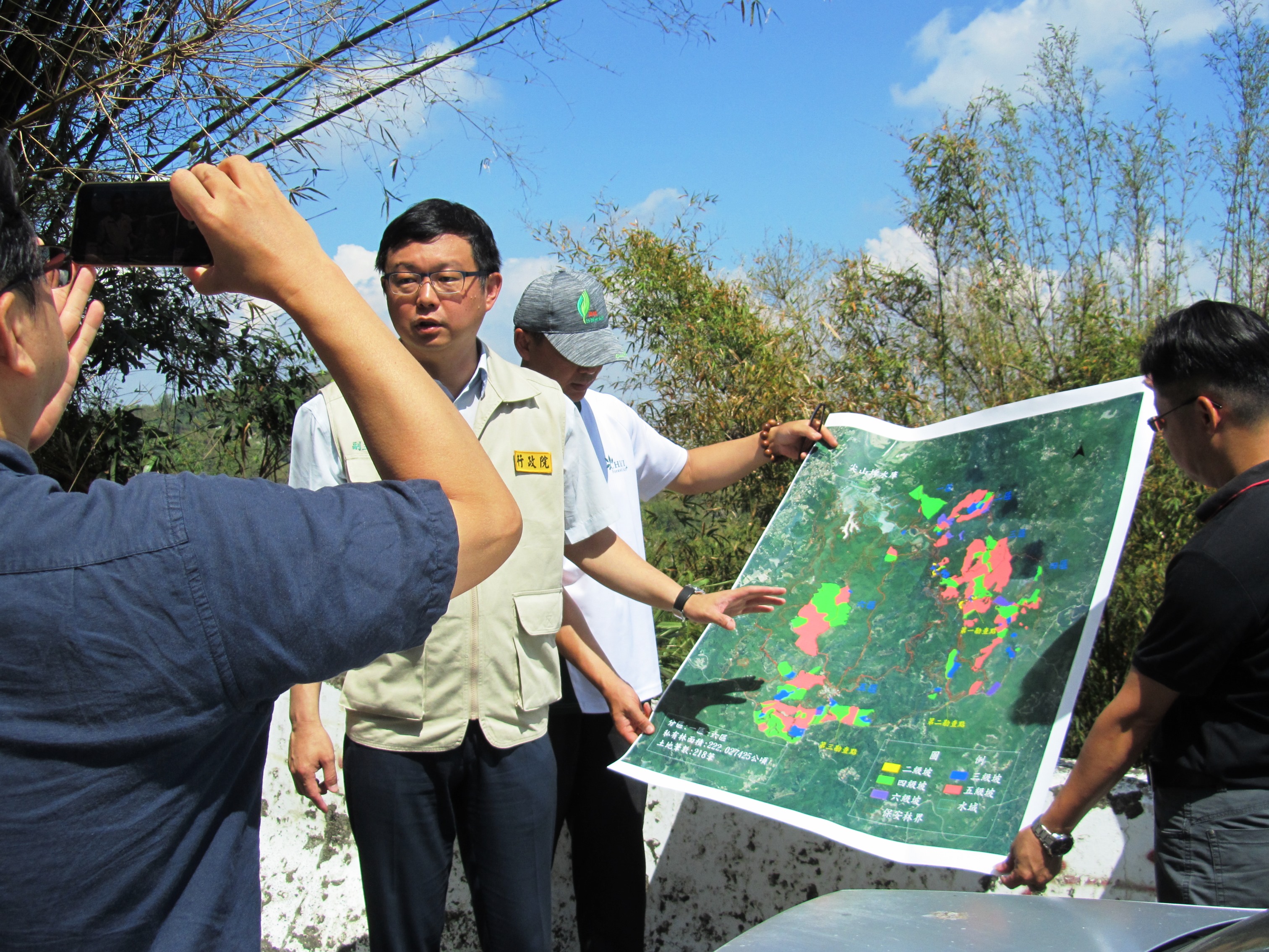 行政院農業委員會李退之副主任委員於今日(5月15日)率林務局及嘉義林區管理處等相關人員至尖山埤水庫私有保安林,與在地民眾,進行現場勘查,聽取在地民眾的心聲,副主委強調,本案請林務局用最快的速度來辦理,以解決多年私有保安林地主爭取的權益,現場鄉親都鼓掌表示認同。