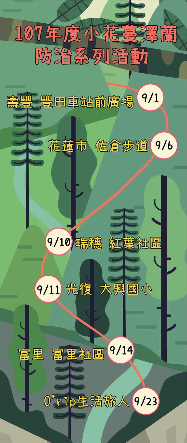 為了宣導正確移除小花蔓澤蘭的方式及防治時機,農委會林務局將每年8月15日至9月15日訂定為全國防治月,並將九月第一週的星期六訂為全國防治日。花蓮林區管理處今年度以「自家小花自己除」為主題,將辦理5場防治宣導活動,全國防治日當天壽豐鄉豐田社區舉辦除蔓競賽活動,並於豐田火車站前廣場設有外來入侵種闖關遊戲、花蓮林管處業務宣導攤位及在地市集,以多元豐富的活動為花蓮縣的防治月開啟序幕。 小花蔓澤蘭原產中南美洲,因強勢的入侵特性而名列世界保育聯盟「世界百大入侵物種」名錄,是極具威脅性的世界級惡性雜草,由於其強盛的散布能力及繁殖力,自民國89年報載在花蓮縣發現危害情形後,至今已遍及全台低海拔林地,遭其蔓藤覆蓋纏勒的植株,會因光合作用受阻而枯萎死亡,嚴重危害我們的生態環境及休閒品質。 配合今年防治主題,為了讓民眾瞭解自家環境週遭小花蔓澤蘭的危害狀況,花蓮林管處分別於9月6日在花蓮市佐倉步道、9月10日在萬榮鄉紅葉社區、9月11日在萬榮鄉大興國小校園、9月14日在富里鄉富里社區,帶領民眾針對平時經常活動的步道及公園進行除蔓,並宣導正確的移除方式及移除時機,也特別與O’rip生活旅人工作室合作辦理小花蔓澤蘭纖維藝術工作坊,透過藝術工作坊創作體驗,將危害生態的植物轉變為創作素材,用不同方式間接宣導小花蔓澤蘭以及外來種對於生態的危害。 花蓮林區管理處表示,小花蔓澤蘭的散布造成原生植物死亡、減低環境的生物多樣性,是破壞生態的「綠色癌症」,並呼籲民眾可以從住家周圍的除蔓做起,進而至社區環境,一步步減緩小花蔓澤蘭散布的速率,守護臺灣的生態環境,就從「自家小花自己除」開始! 小花蔓澤蘭的移除重點有三: (一)於每年8-9月進行全面性的切蔓或拔蔓。 (二)人工將根部挖(拔)除,攀附在樹體上之藤蔓則於拔除根系後,任其懸掛枯萎。 (三)切除或拔除後散落的蔓莖及根部,應加以收集、綑紮後置入可分解的黑色大塑膠袋中使其腐爛,或集中至水泥地或空地上曬乾後再予燒燬。