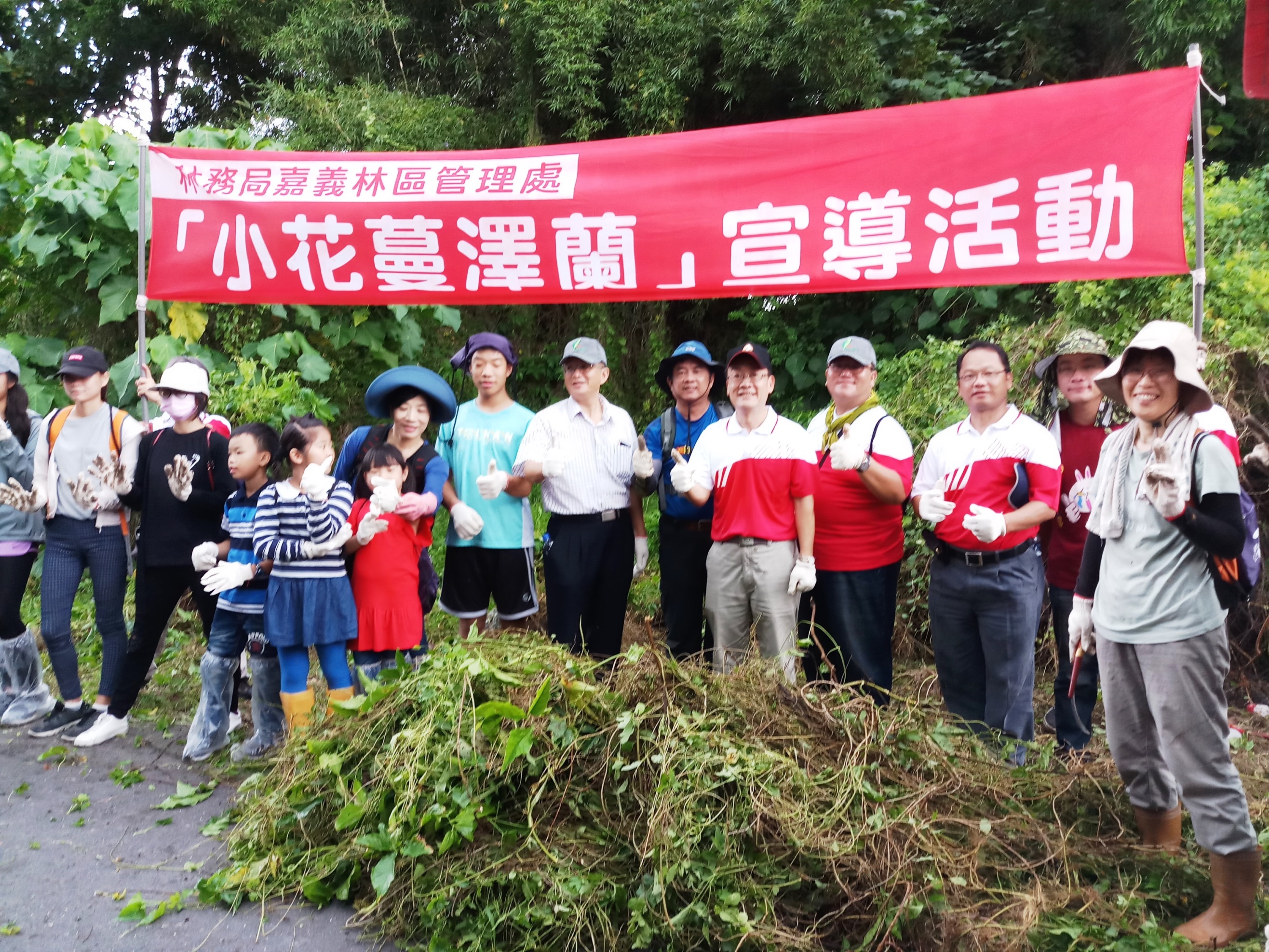 除蔓小動作 守護大棲地 今日(1日)為小花蔓澤蘭全國防治日,嘉義林區管理處在諸羅樹蛙棲地三崁店糖廠辦理小花蔓澤蘭防治宣導活動,且特別避開樹蛙繁殖季,當日首先由嘉義林區管理處張岱處長、臺南市農業局吳威達主任秘書、荒野保護協會台南分會張副會長讚合、台灣糖業公司代表朱保而先生等人一同揭開「除蔓護蛙」活動主軸,以生動大型繪本方式講解移除小花蔓澤蘭方法,表達除蔓可保護樹木,亦可間接保護樹蛙棲息環境意義,共有近200位民眾參加,透過彼此間互相合作與攀附在樹木的小花蔓澤蘭進行一場艱難的拔河比賽,經過漫長的1小時拉扯,終於剷除達800餘公斤植物體,達到以實際的除蔓小動作,守護大棲地目標。 小花蔓澤蘭多元利用 推陳出新 防治小花蔓澤蘭活動已推行多年,為多元利用移除後的植物體,嘉義林管處與工業技術研究院合作進行炭化收集醋液及炭化物,並再加工做成不同再利用品,從多元環境液、防蚊液、手工皂等,今年度更是推陳出新,利用炭化物製成複合栽培土搭配光蠟樹種子,做成「除蔓種樹 讓地球喘口氣」栽種包,發送給參與民眾,另天埔社區利用移除的植物體搭配其他花草,以敲染方式製成環保杯袋,展現社區無限創意,都讓民眾覺得小花蔓澤蘭有著無限新價值,同時現場亦設攤宣導生態保育、外來入侵種防治、台灣原生植物種子介紹等相關知識,讓除蔓活動更具多元性及知識性。 防治小花蔓澤蘭 非你不可 嘉義林區管理處表示小花蔓澤蘭、香澤蘭是百大外來入侵植物,提醒民眾9月至10月為小花蔓澤蘭最佳防治時間,現已展開收購活動,收購金額每公斤5元,收購時間至10月31日止,收購地點為嘉義林管處玉井工作站、觸口工作站及奮起湖工作站,歡迎社區民眾揪團共同來剷除賺外快;另9月份有3場防除活動分別於7日嘉義縣竹崎鄉沙坑村社區活動中心、8日臺南市六甲區鎮南宮2021區外保安林、11日嘉義縣中埔鄉深坑段造林地辦理,小花蔓澤蘭防治月,就缺你一咖,快快來加入吧!!(詳情請洽:05-2787006轉379李小姐)