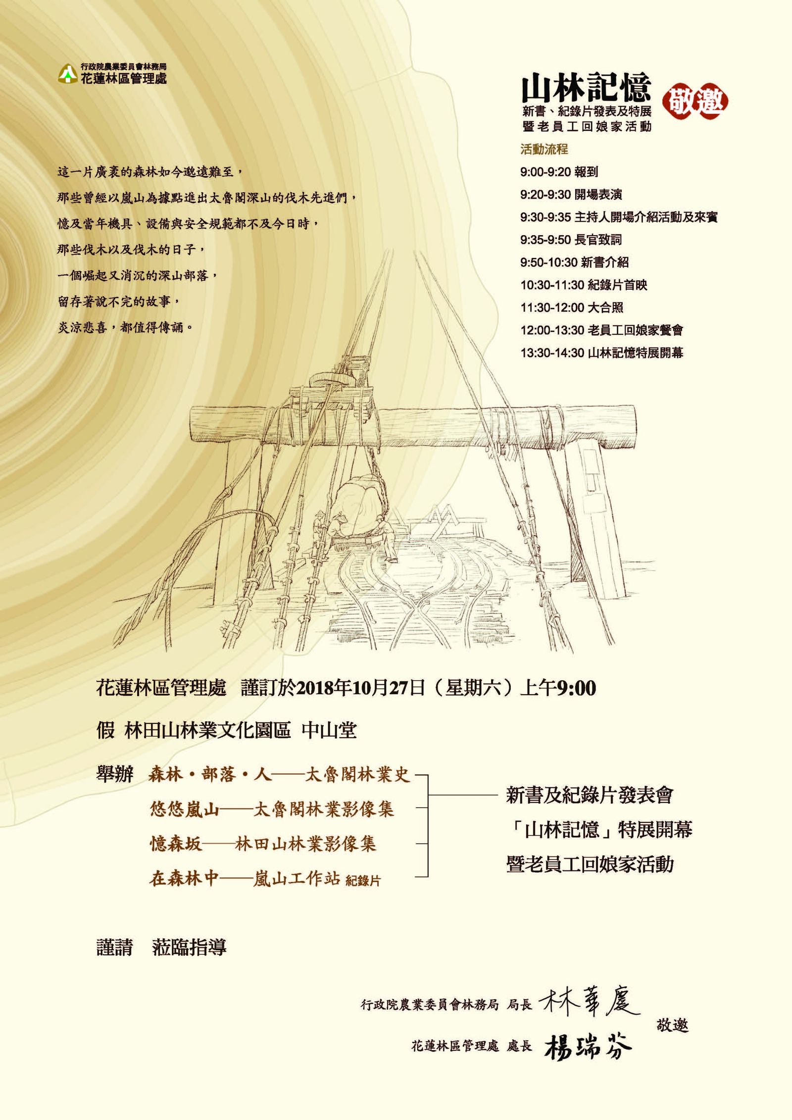 眾所周知,「嵐山工作站」、「哈崙工作站」及「林田山林場」是花蓮也是東臺灣林業發展重要場域,開發歷史久遠,不但是臺灣林業發展的縮影,更是許多林業人的生命故鄉。10月27日(六)林務局花蓮林區管理處邀請大家蒞臨花蓮林田山林業文化園區,一起來「賞新書、看首映、遊特展、回娘家」,共襄盛舉花蓮林業人文饗宴。 花蓮林管處致力森林經營與保育,同時盡力保存在地的林業歷史及其相關史蹟,繼《1922無盡藏的大發現——哈崙百年林業史》,再度委託國立東華大學王鴻濬教授團隊針對太魯閣林場/嵐山工作站進行調查研究,道綺全球傳播有限公司拍攝紀錄,阿之寶有限公司編輯出版,歷時5年,終於重拾這一段塵封三十年的林業光羽。一方面蒐集文獻,一方面前往現地探勘測繪,記錄嵐山工作站及鐵道、索道等各項林業設施的現況。該團隊也進行深入的人物訪談,從口述歷史的角度建構太魯閣林場昔日的樣貌,在文獻和統計數字之外挖掘更多關於嵐山的故事。 10月27日(六)上午9時起,花蓮林管處將於「林田山林業文化園區」展示豐碩的成果,聚焦太魯閣深山的「嵐山工作站」,舉辦《森林.部落.人——太魯閣林業史》新書發表會及《在森林中。嵐山工作站》紀錄片首映會,還有「嵐山、哈崙、林田山」等三座林場老照片集結而成的限量影像書及超限量精裝套冊,同時邀請林場老員工與家屬齊聚一堂,共話當年出入深山的甘苦回憶,歡迎大家一起來聽聽山裡的故事,看看花蓮的林業歷史,認識臺灣森林經營轉向的歷程。 10月27日當天共有四個免費活動,呈現方式多元精彩。當天將進行交通管制,歡迎多加善用大眾運輸工具入園,例如台灣好行-縱谷花蓮線,誠摯邀請大家一同前來分享臺灣森林的故事。活動介紹如下: 活動一【新書發表會、紀錄片首映】 時 間:09:00-12:00 地 點:林田山林業文化園區中山堂 發表項目:1.書籍《森林.部落.人——太魯閣林業史》 2.影像書《悠悠嵐山——太魯閣林業影像集》 3.影像書《憶森坂——林田山林業影像集》 4.紀錄片《在森林中。嵐山工作站》 參加辦法:免費入場,自由入座(150個座位,外圍可站立,現場可購買書籍) 活動二【林田山老員工回娘家】餐會活動 時 間:11:40-13:30 地 點:林田山林業文化園區中山堂及森榮國小廣場 參加辦法:收到「邀請卡」的老員工「憑識別證」入場用餐。 活動三【山林記憶:花蓮林業記錄特展】 開幕時間:13:30-14:30 展出地點:林田山林業文化園區生活館 展出期間:2018年10月20~11月22日 開放時間:9:00~17:00(每週一休館) 參加辦法:自由參觀 活動四【玩木趣DIY體驗活動】 時 間:09:30-16:00 地 點:林田山林業文化園區、工作站前車道及林業生活館廣場 活動內容:1.新書販售(現場特價優惠)、2.學.森林——樹行動 3.森林知識100問、4.我愛國產材、5.無螫蜂蜜與蜂膠之妙用 6.李宗儀木雕(木雕野生動物展示)、7.認識國產材及木材樣本展售 8.花蓮農校實習產品展售、9.刻磨機木彫體驗、10.手提木工機具體驗 11.電烙體驗、12.線鋸體驗、14.鋸木體驗…等。 參加辦法:免費,自由參加