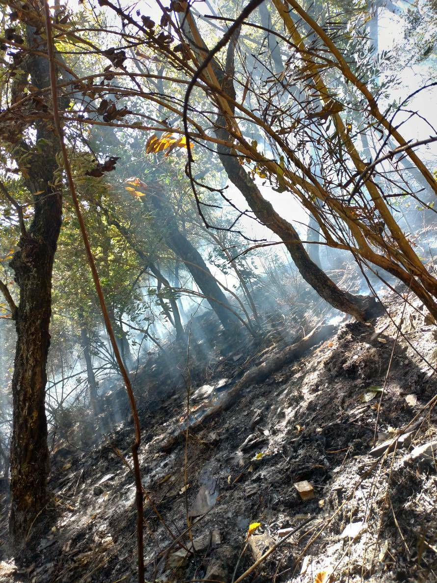 東勢林區管理處於今(11/24)日上午接獲通報梨山地區發生森林火災,地點位於梨山地區大甲溪事業區23林班,經巡山人員以GPS及望遠鏡觀察確認火災位置後,立即動員展開救火工作。 火場海拔高度1,820公尺,現場濃煙密布,坡度45度,初估燃燒面積約1.2公頃,林管處緊急調度森林救火隊弟兄奔赴火場,目前動員計23人全力搶救,同時,內政部空中勤務總隊出動直昇機對火場直接灌灑10次,另消防隊亦趕赴現場佈水線,陸空全力合作持續滅火中。 東勢林區管理處呼籲目前已進入乾燥季節,民眾上山請注意防火,若發現森林火災盡速通報消防單位或撥打林務局保林專線0800-000930進行通報,另森林法規定放火或失火燒毀他人之森林者,應負刑責外尚須負民事賠償責任,請大家一起維護國家寶貴森林資源。